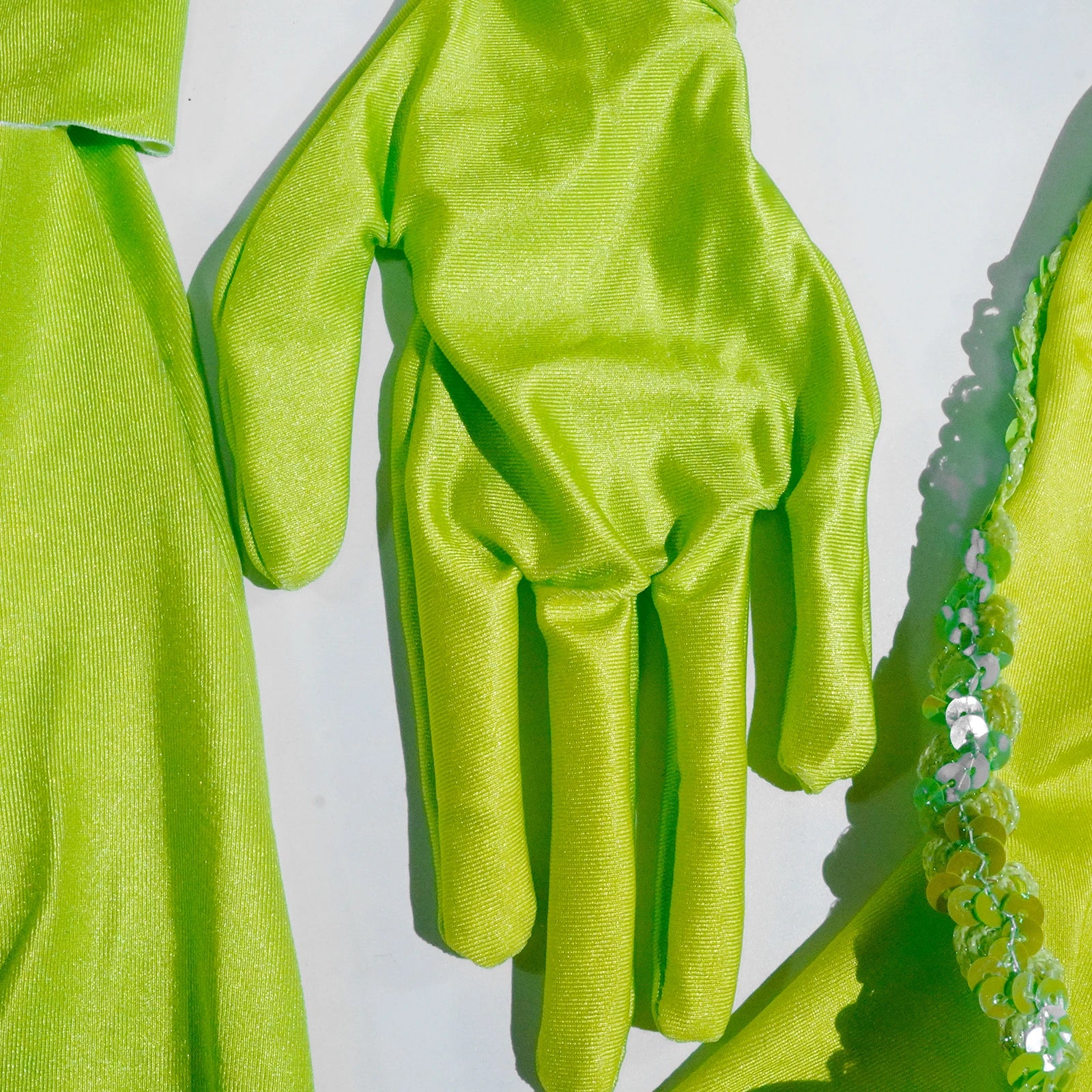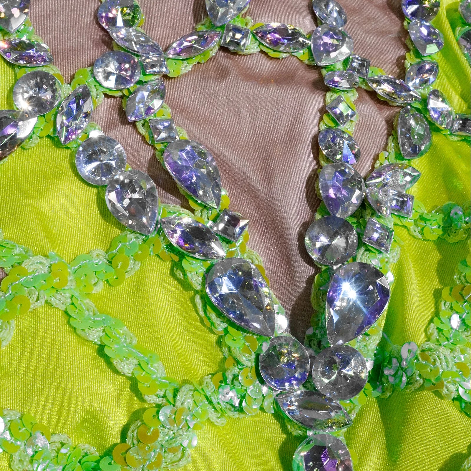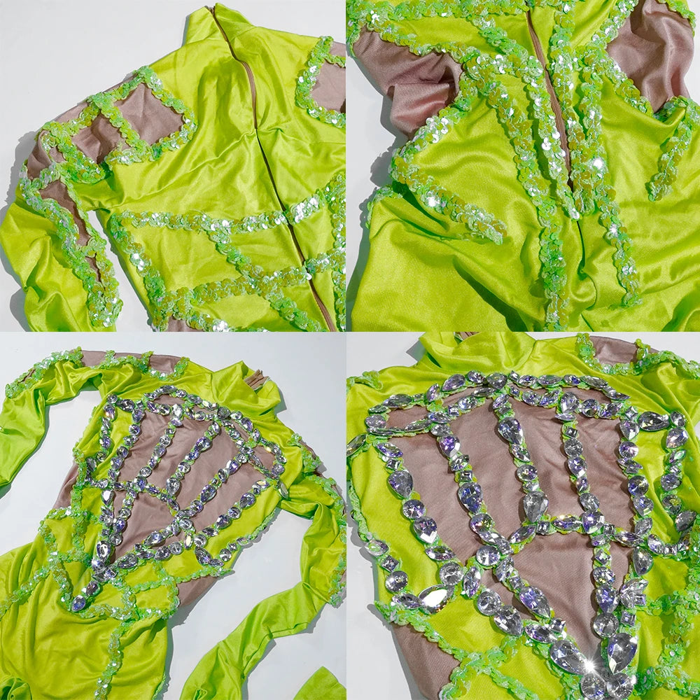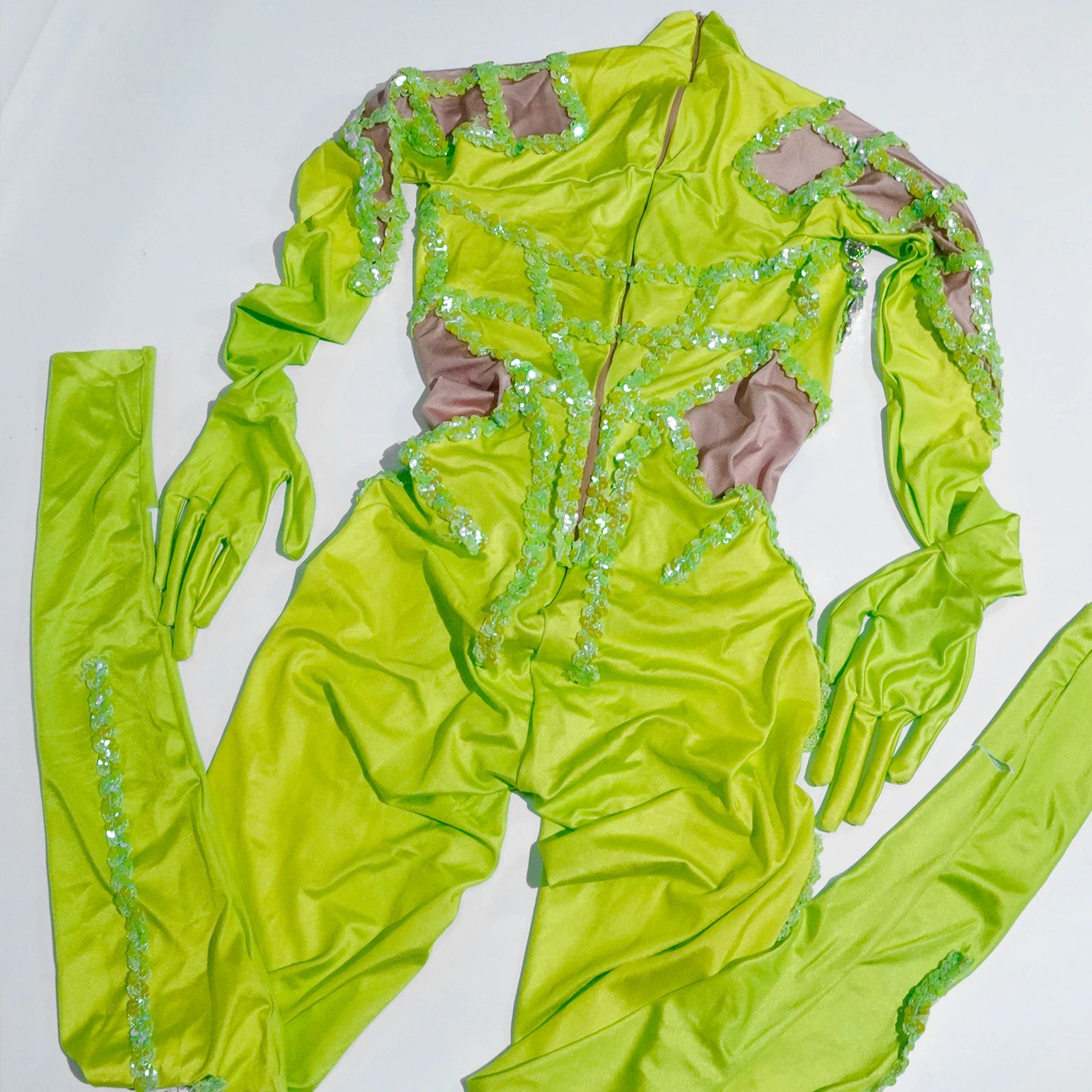 Elevate stage presence with this Sparkling Fluorescent Green Rhinestones & Sequins Jumpsuit — a high-impact performance costume designed for singers, dancers, drag performers, nightclub appearances, birthday parties, and photo shoots. This jumpsuit combines fluorescent color, dense sequin coverage, and precision rhinestone placement to deliver maximum visibility under stage lights and UV/blacklight.
