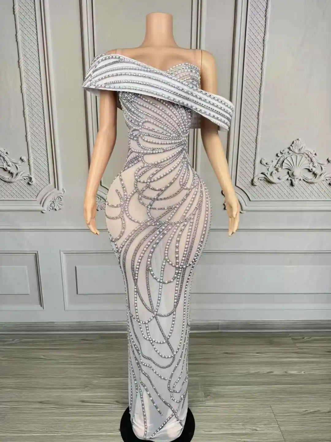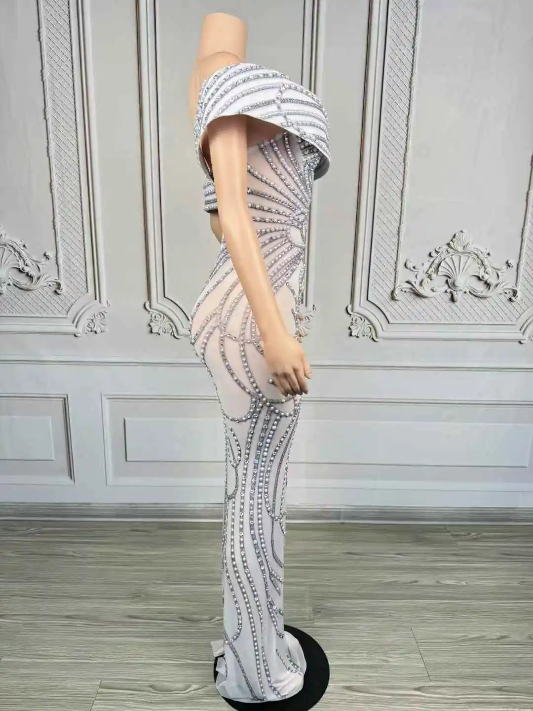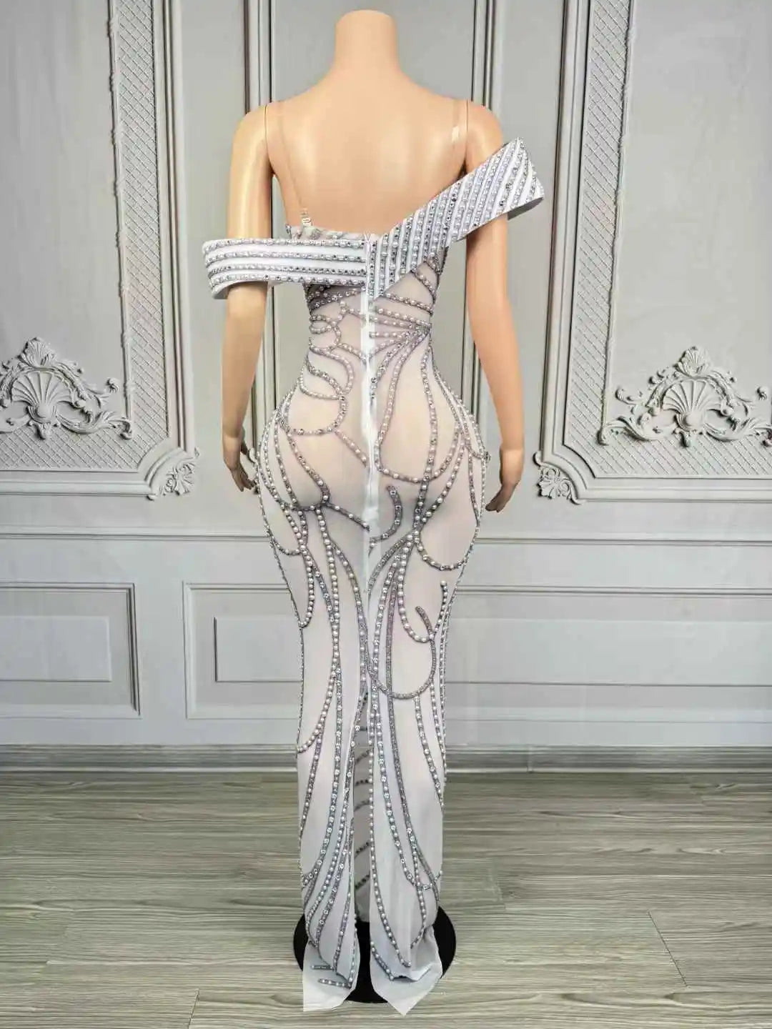 Step into luminous elegance with this Sparkling Pearls Rhinestone Evening Dress — a glamorous, show-ready gown designed to catch every camera flash and spotlight. Combining the soft luxury of pearls with the high-impact shimmer of rhinestones, this dress blends classic femininity and modern stage glamour, making it perfect for birthdays, festivals, performances, red-carpet appearances, and photoshoots.