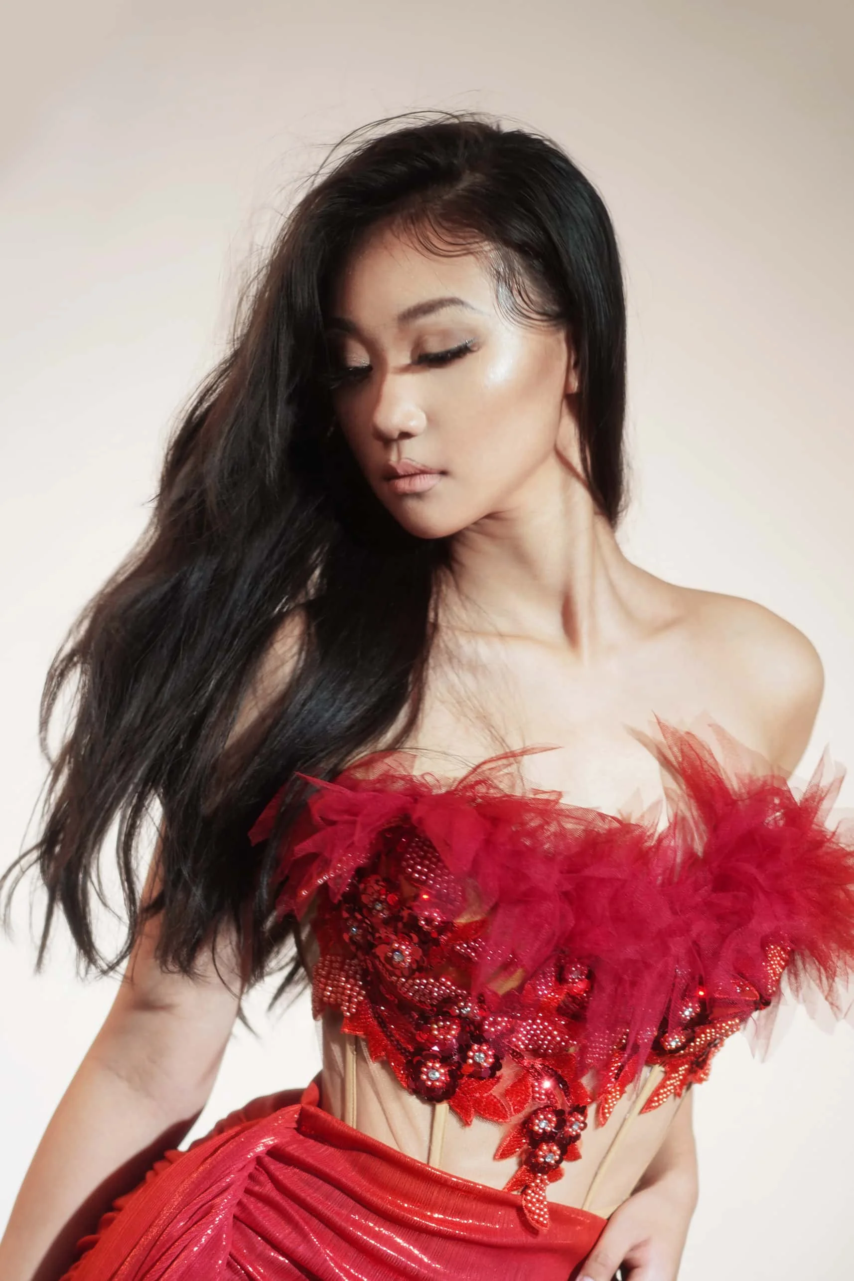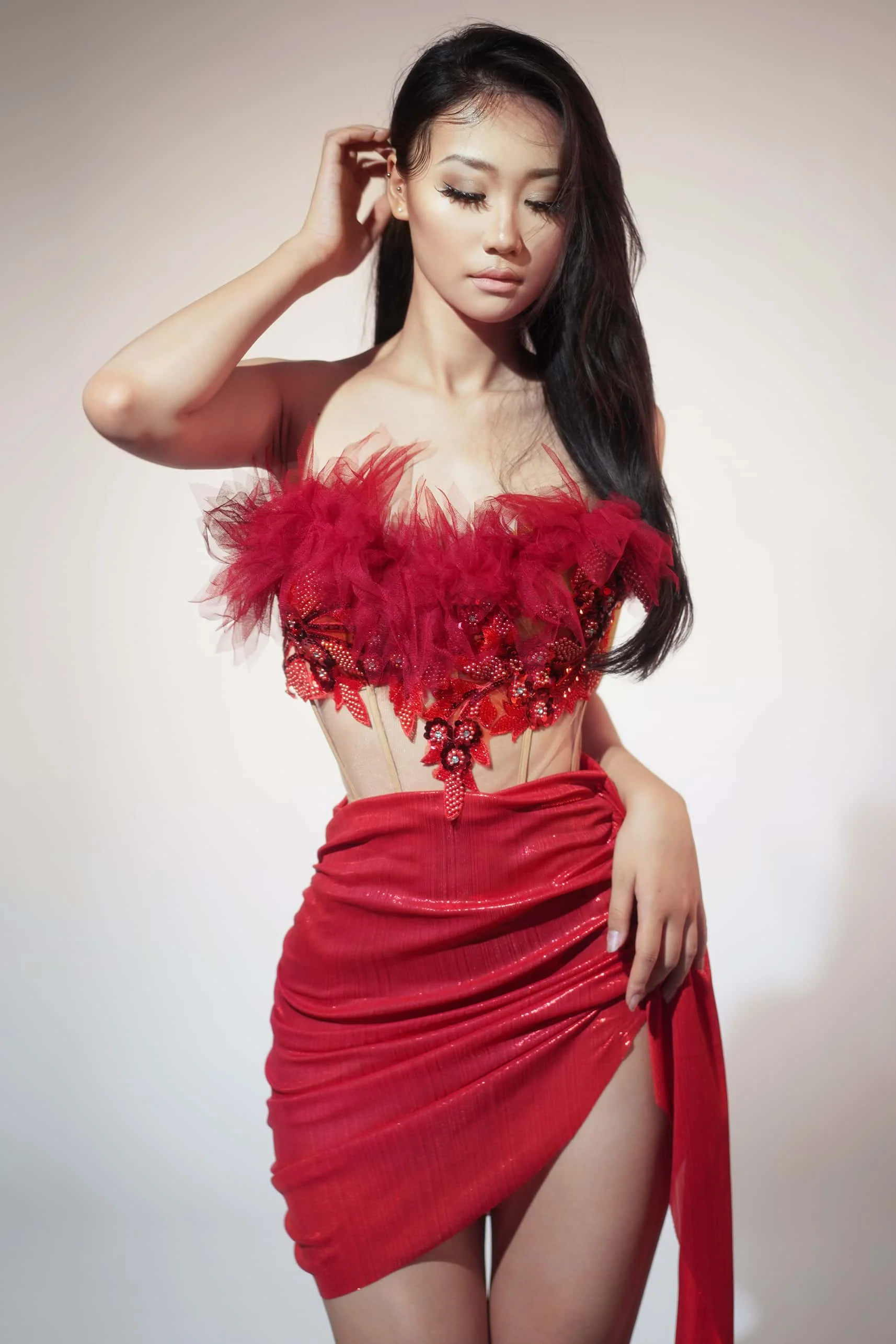 Sparkling Red Pearls Bra Top and Skirt Set Sexy Nightclub Prom Clothing Birthday Party Dress Set Singer Party Stage Outfit Fanqie
