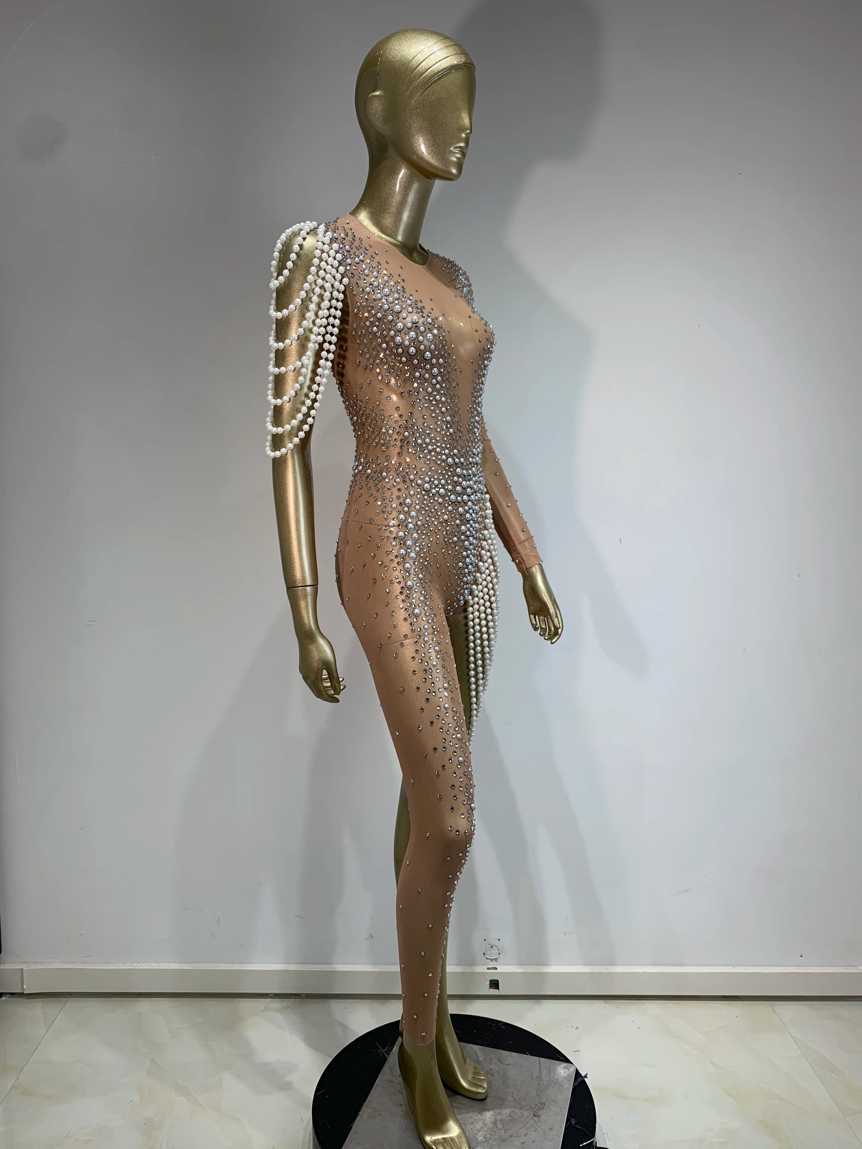 Dazzle the crowd in our Sparkling Rhinestone Pearl Long Sleeve Sexy Stretch Jumpsuit! This stunning evening party costume is designed for singers and performers, featuring a captivating blend of rhinestones and pearls that catch the light beautifully. The stretchy fabric ensures a comfortable and flattering fit, making it perfect for nightclub performances and stage shows. Step onto the stage with confidence and shine in this glamorous jumpsuit, designed to make every moment unforgettable!