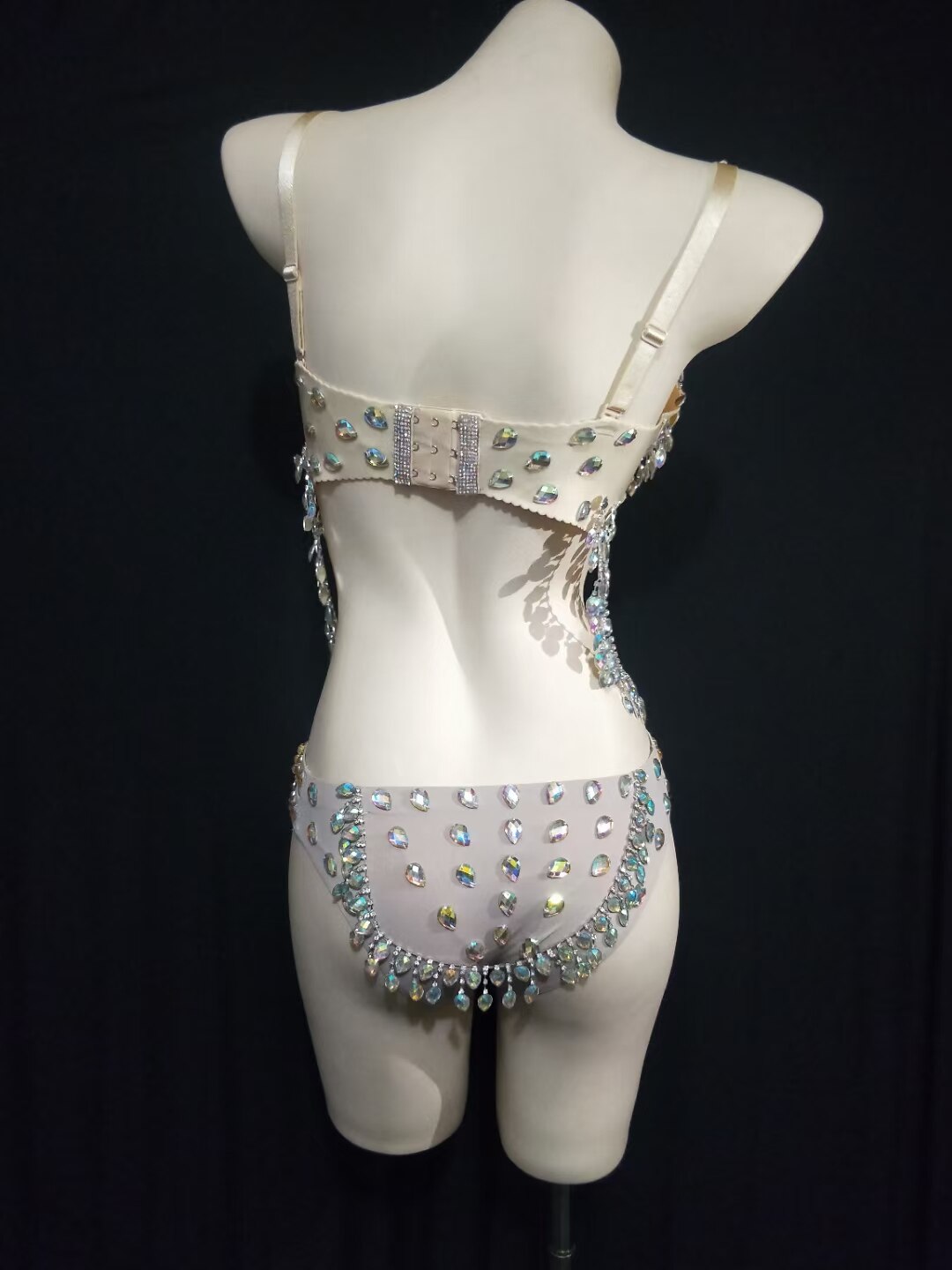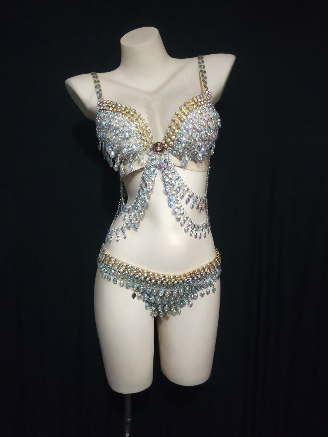 Sparkling Rhinestone Tassel Bikini Outfit Sets with Mesh Trailing Dress Women Sexy Crystal Bra + Shorts Dancer Singer Stage Wear