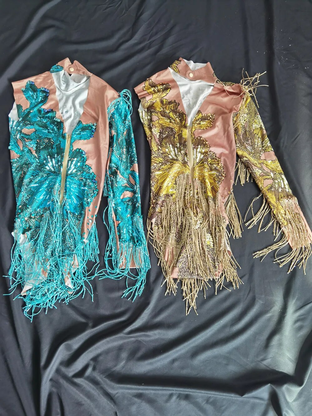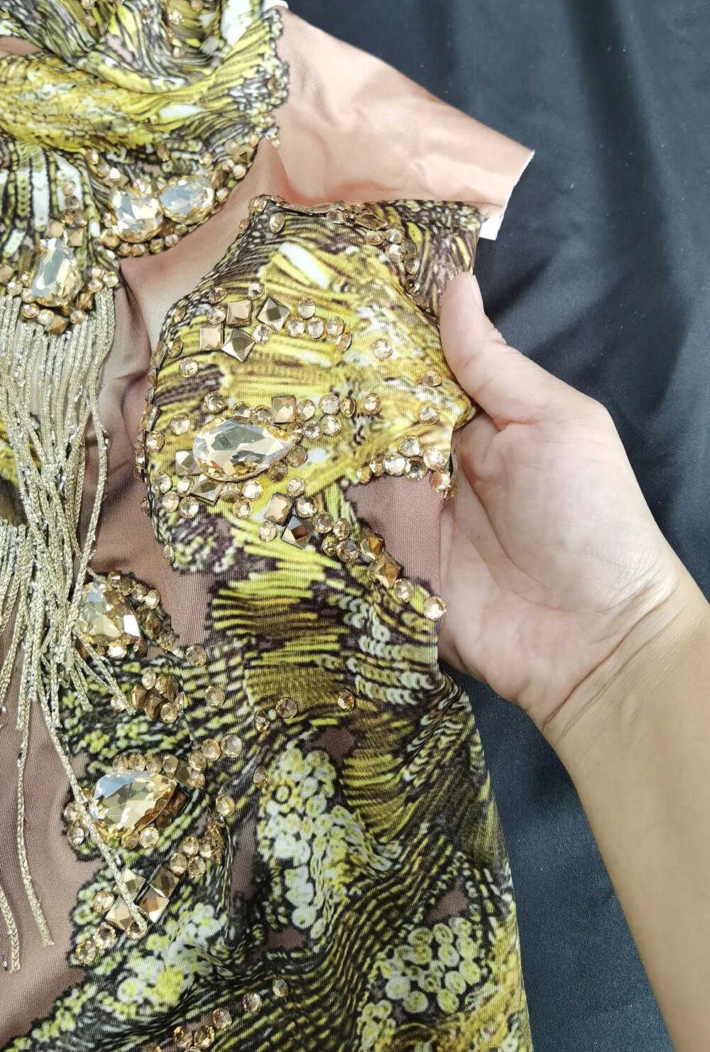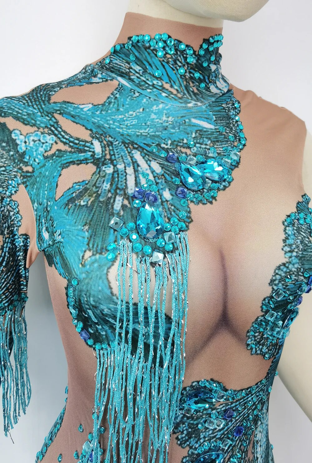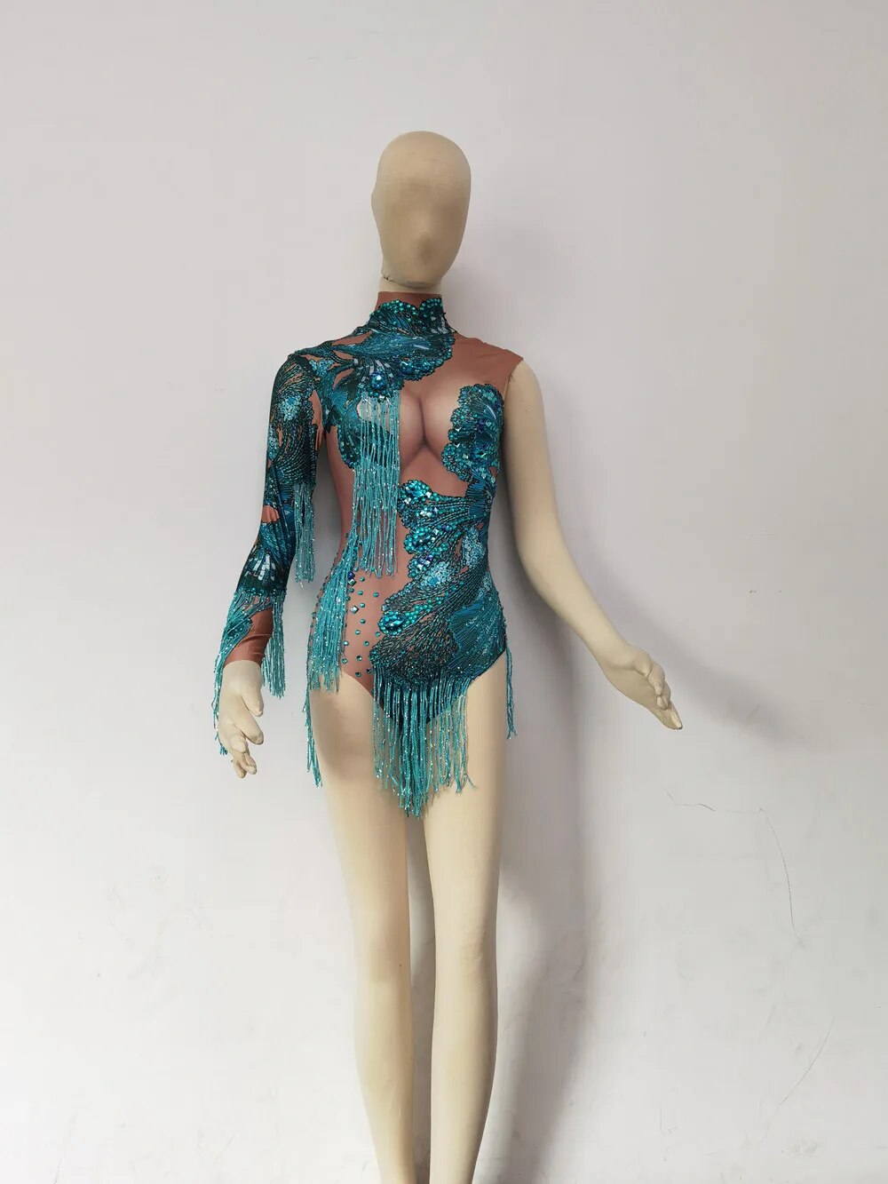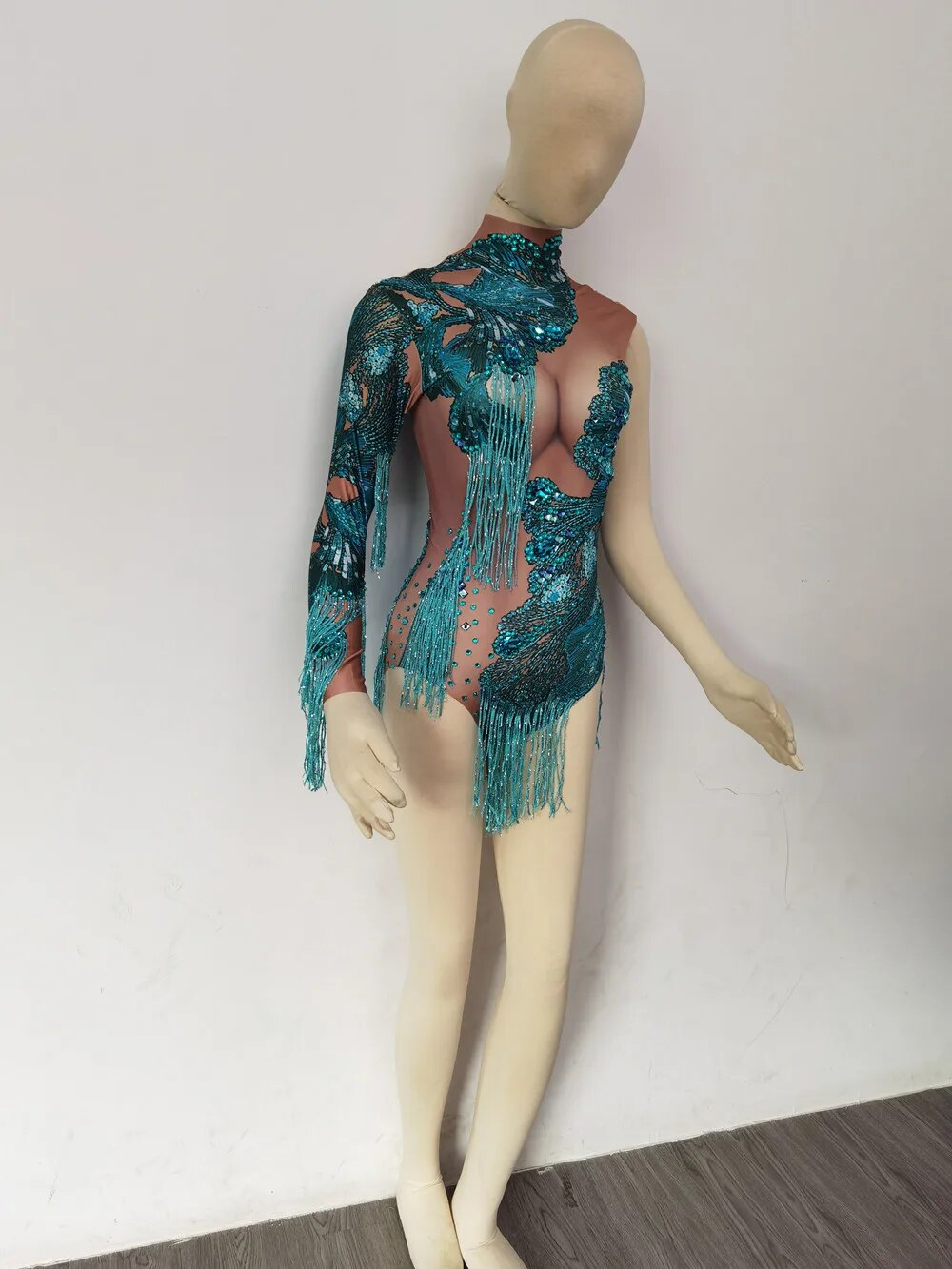Sparkling Rhinestone Tassel Bodysuit Women Single Sleeve Party Fringes Jumpsuits Nightclub Celebration Dancer Stage Costumes