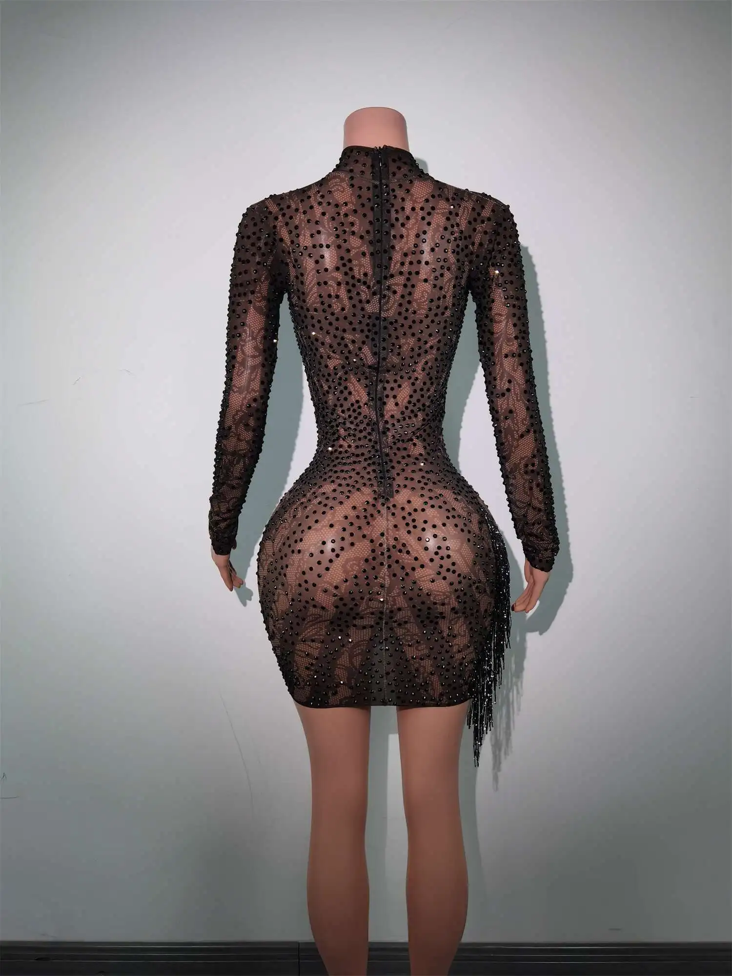 Sparkly Black Rhinestones Tassel Short Dress Women Sexy Birthday Evening Prom Celebrate Dress Photo Shoot Stage Wear Diban