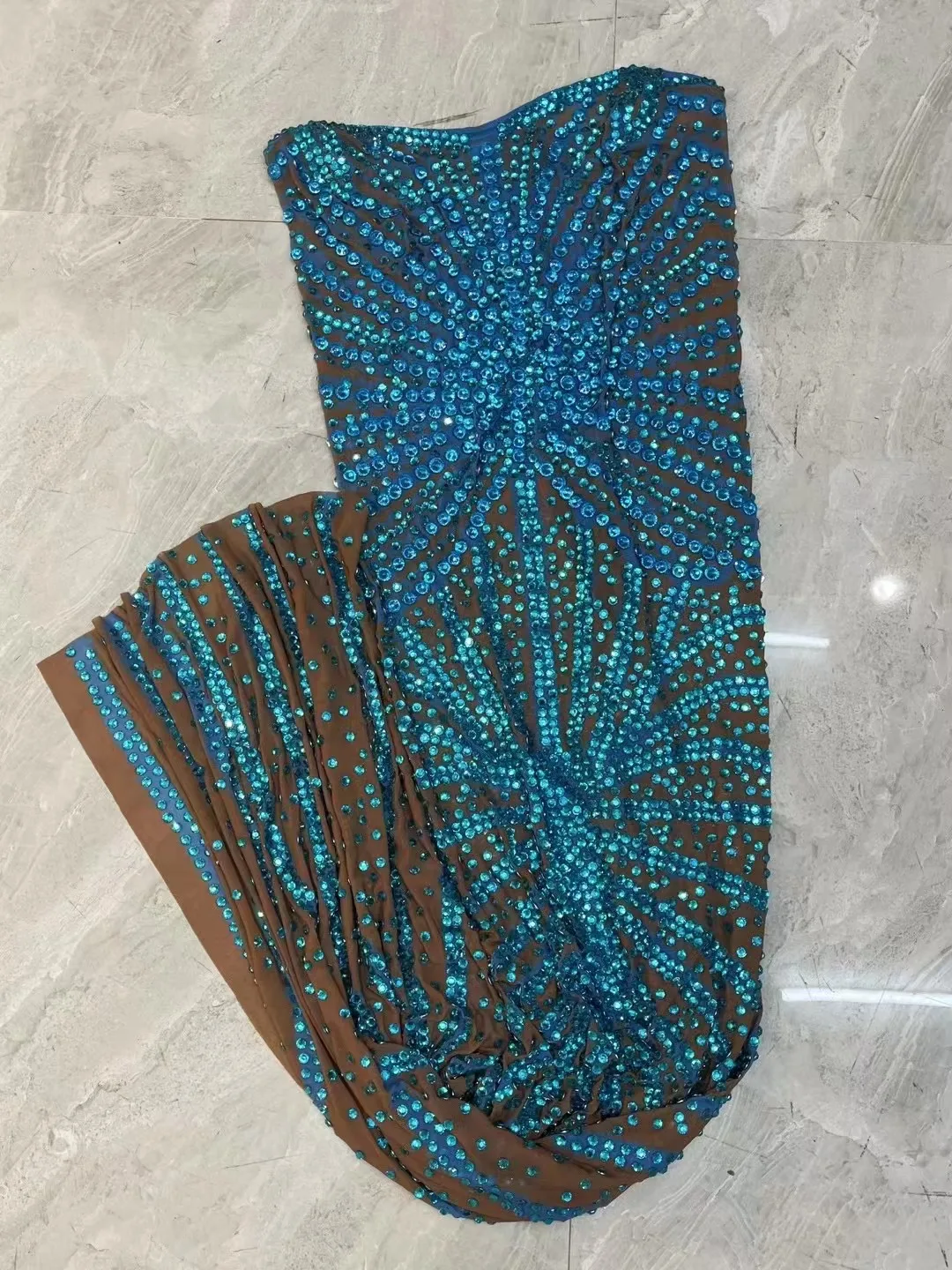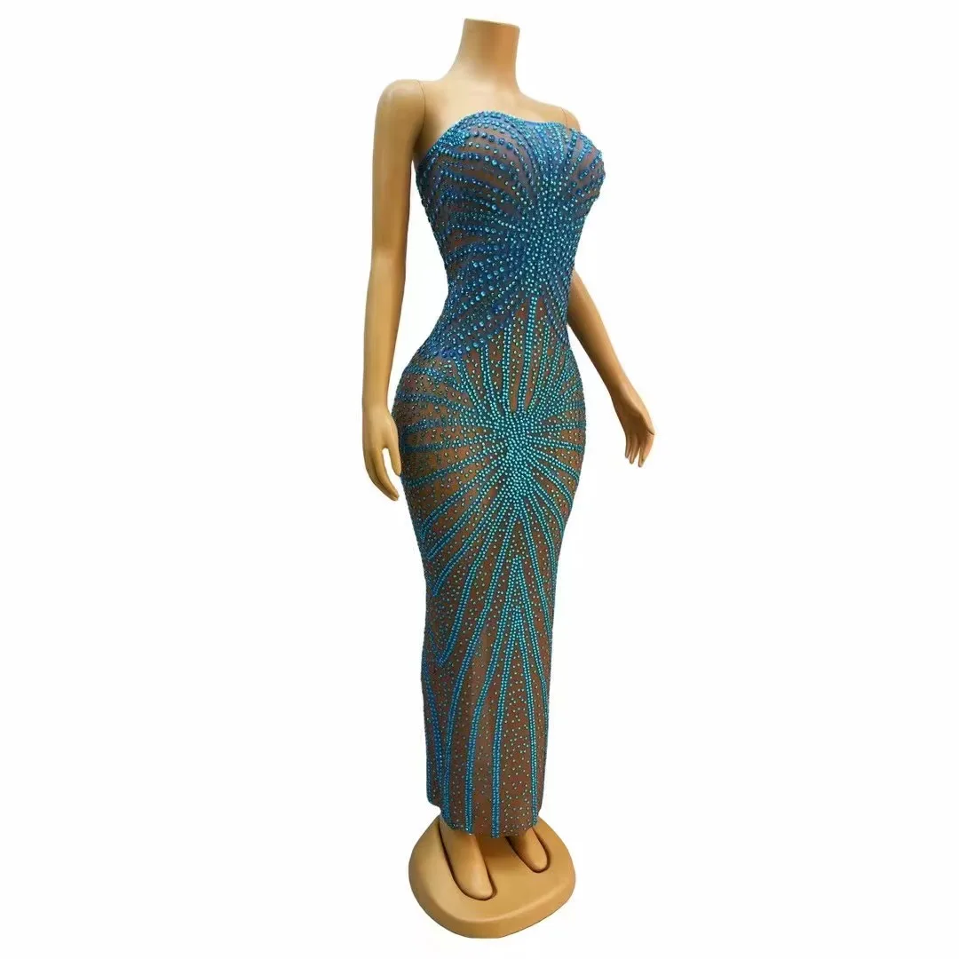 Sparkly Blue Beads Rhinestones Sleeveless Dress Evening Birthday Celebrate Sexy Backless Dance Costume Prom Photoshoot Gowns