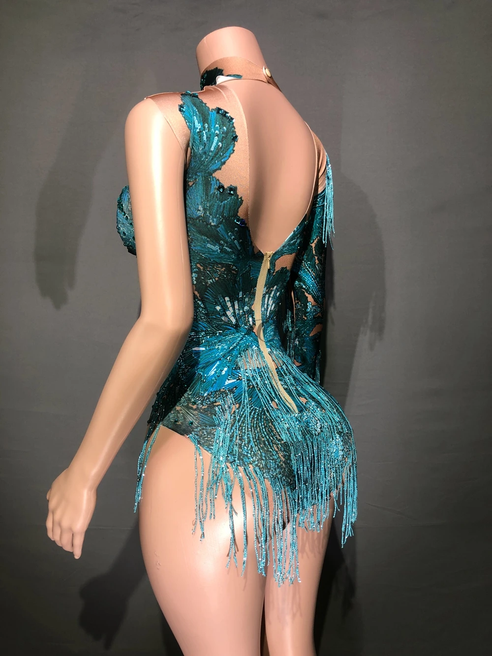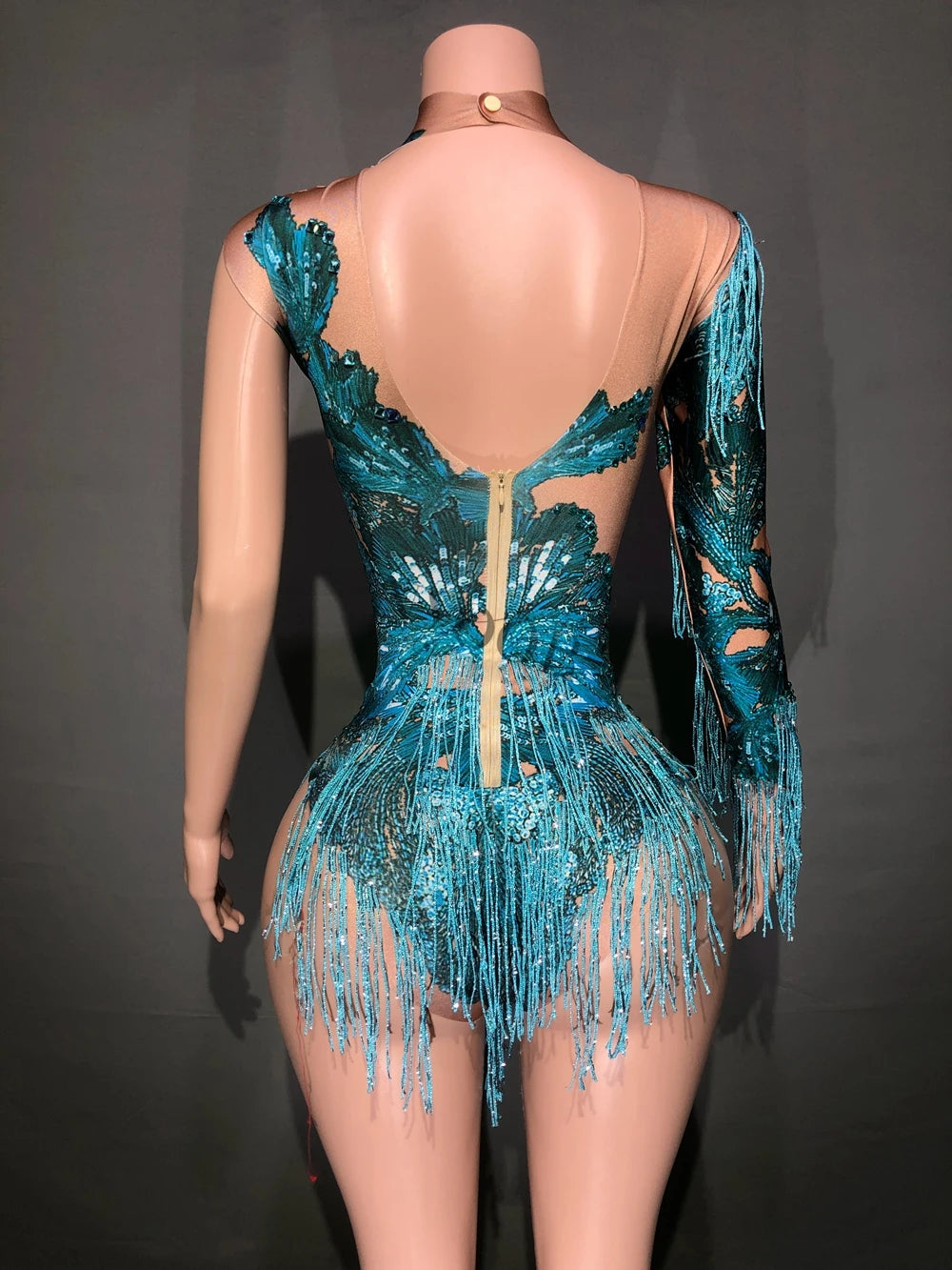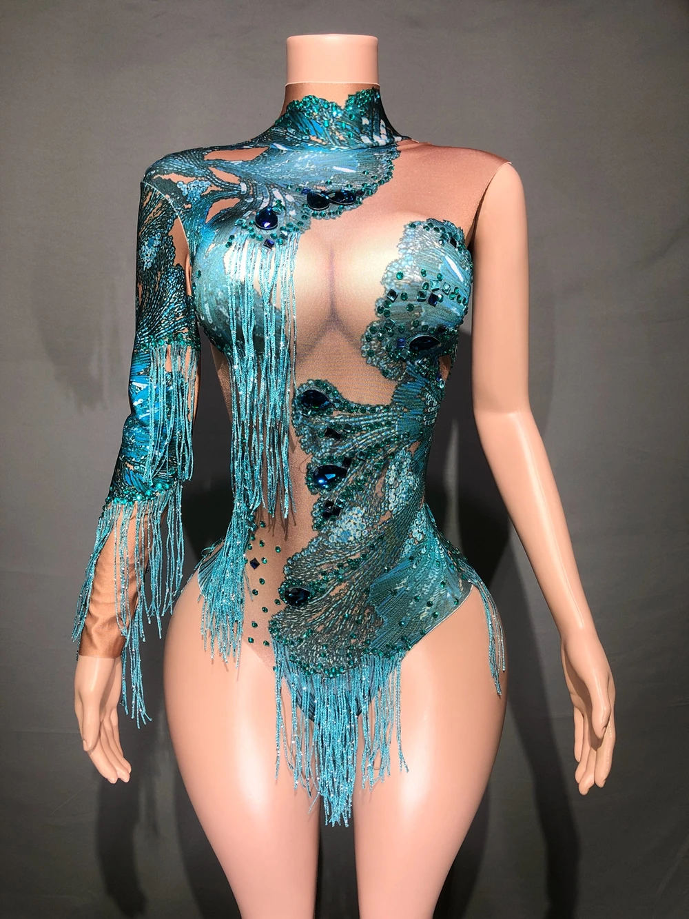 Sparkly Blue Rhinestones Fringes One Shoulder Bodysuit Women Dance Costume Sexy Skinny Leotard Singer Dancer Show Stage Wear