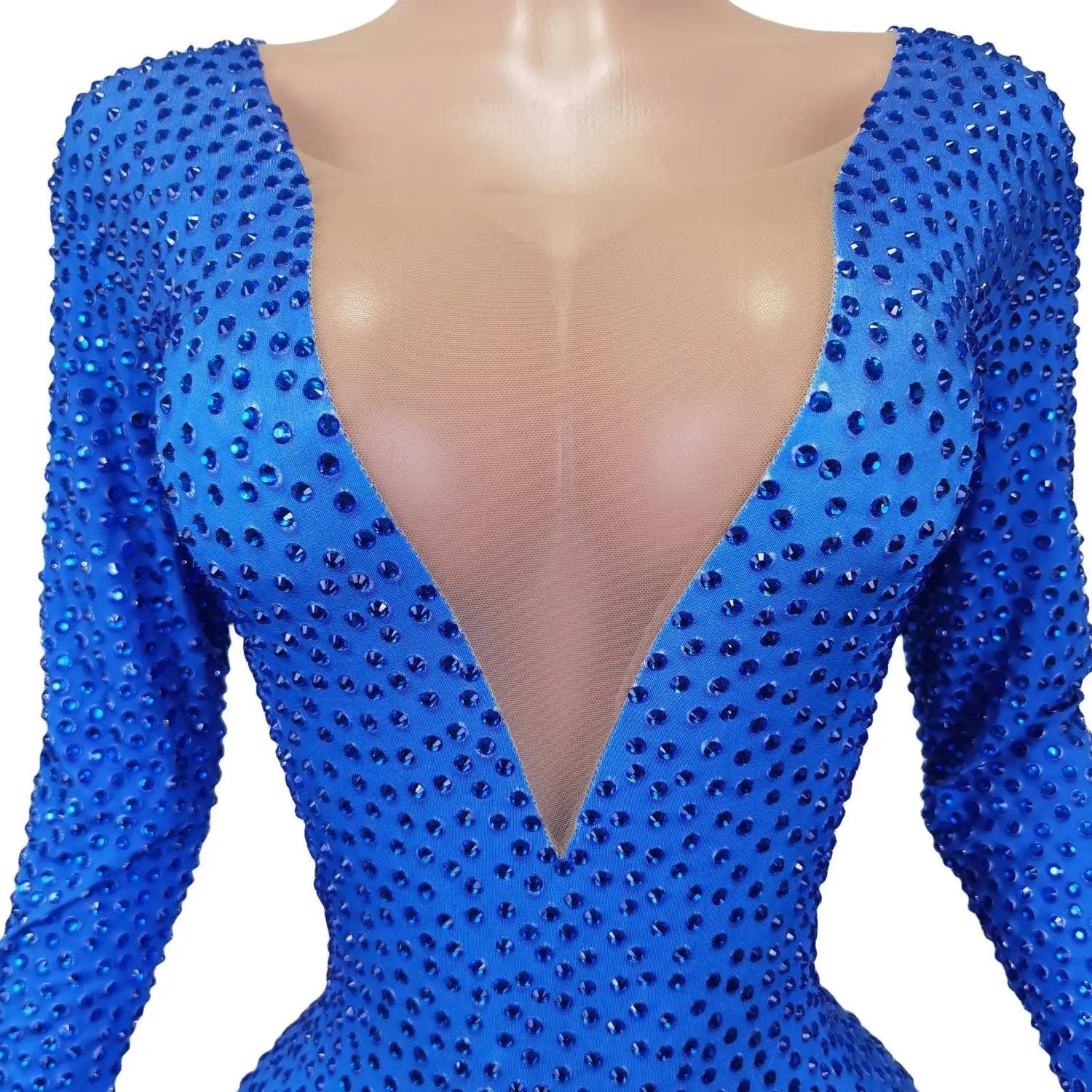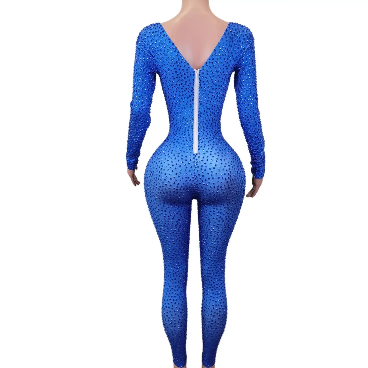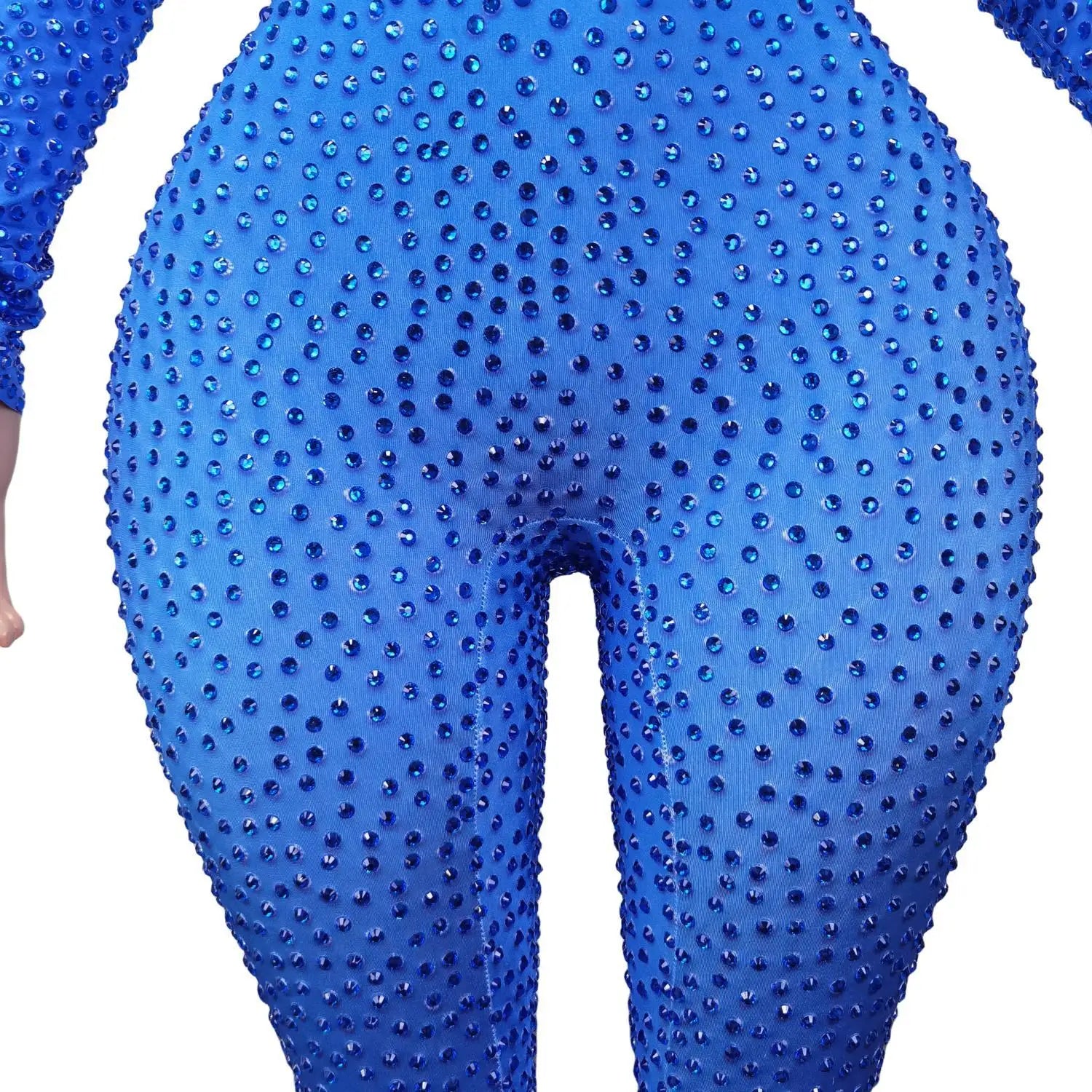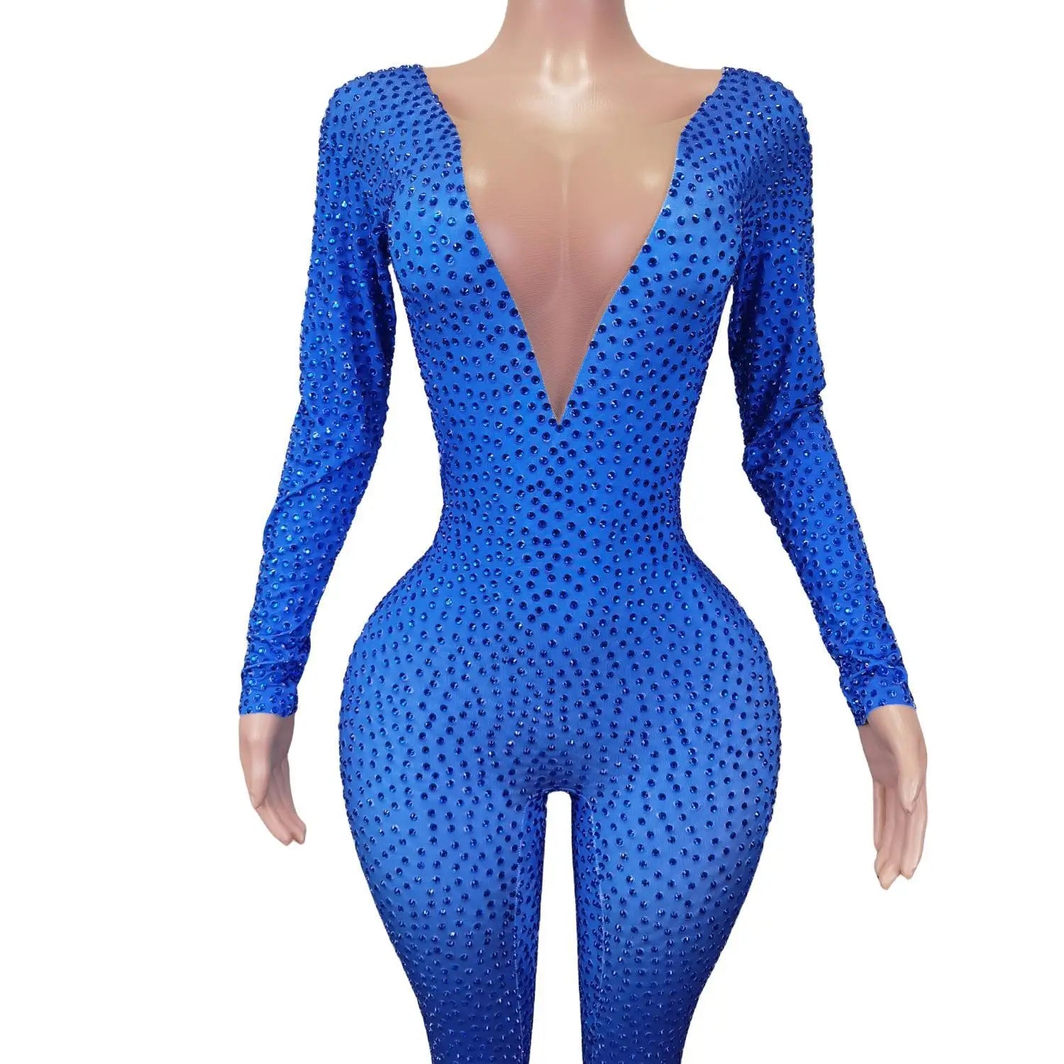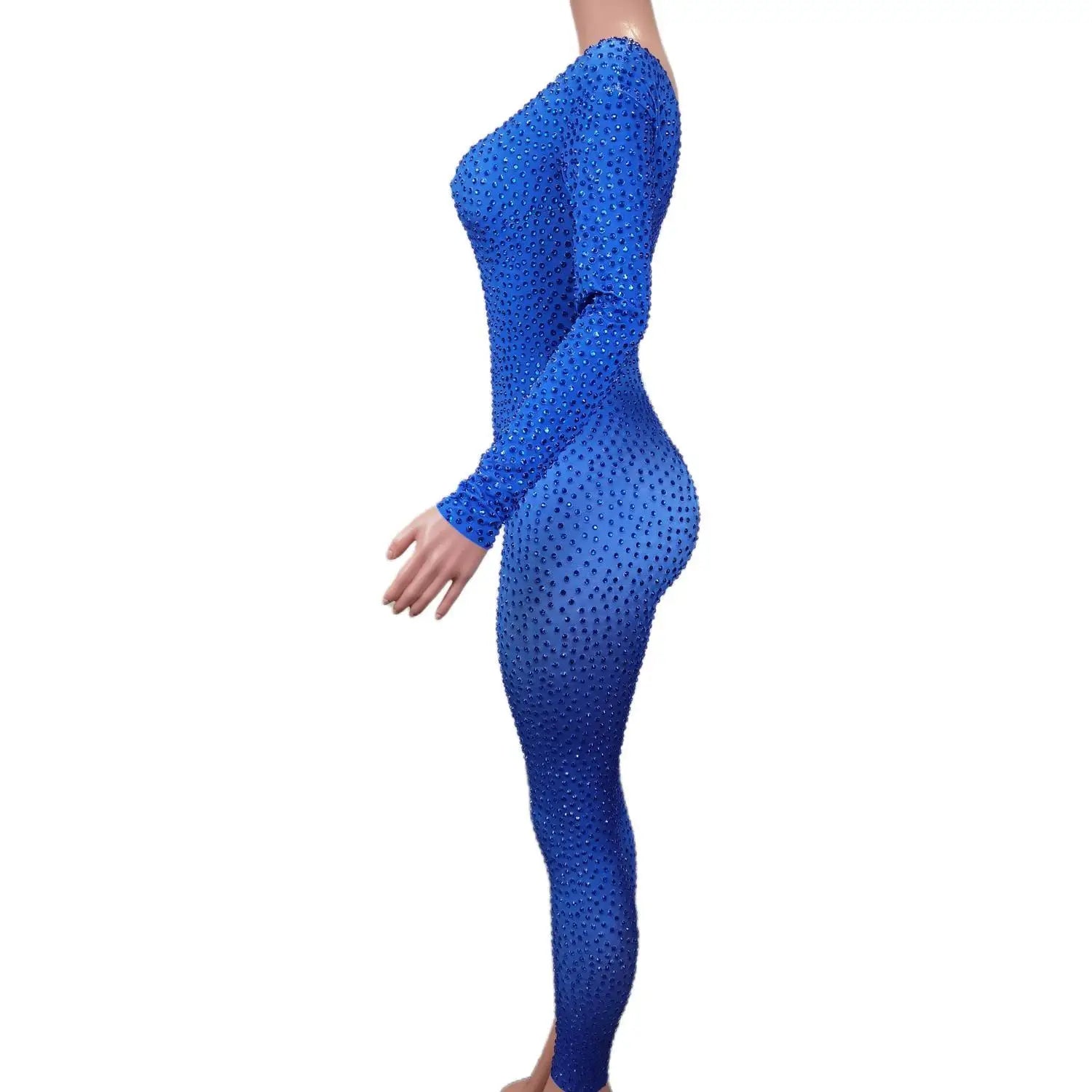 This Sparkly Blue Rhinestones Jumpsuit is a stunning one-piece bodysuit that is perfect for a night out at the nightclub or a dazzling performance. The stretchy fabric ensures a comfortable fit, while the intricate rhinestone detailing adds a touch of glamour. Stand out and shine in this outfit designed for dancers and party-goers alike.