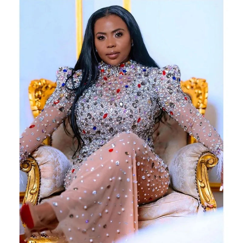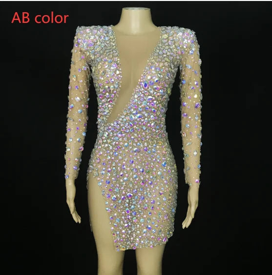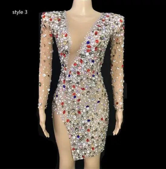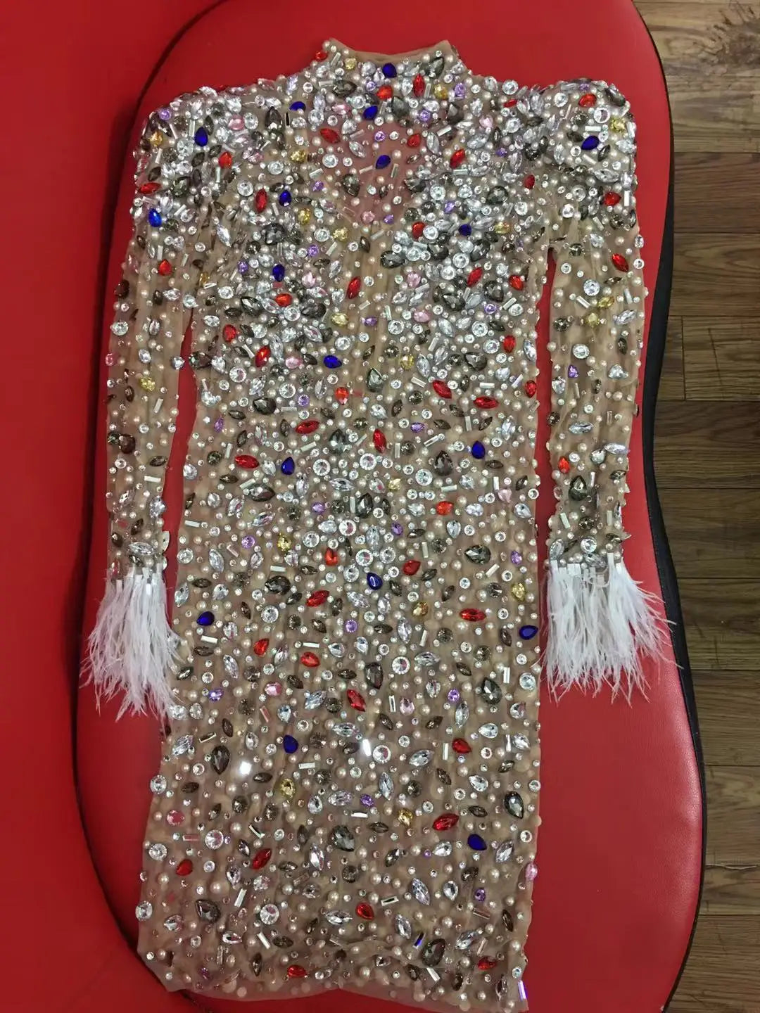 This dress is a show-stopping piece, featuring colorful rhinestones and a transparent design, making it a perfect choice for prom, evening events, and birthday celebrations. The multicolor crystals and feather sleeves add a touch of glamour and sexiness, making it a standout costume for special occasions.