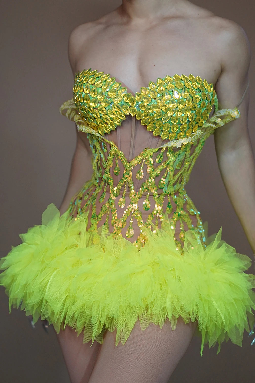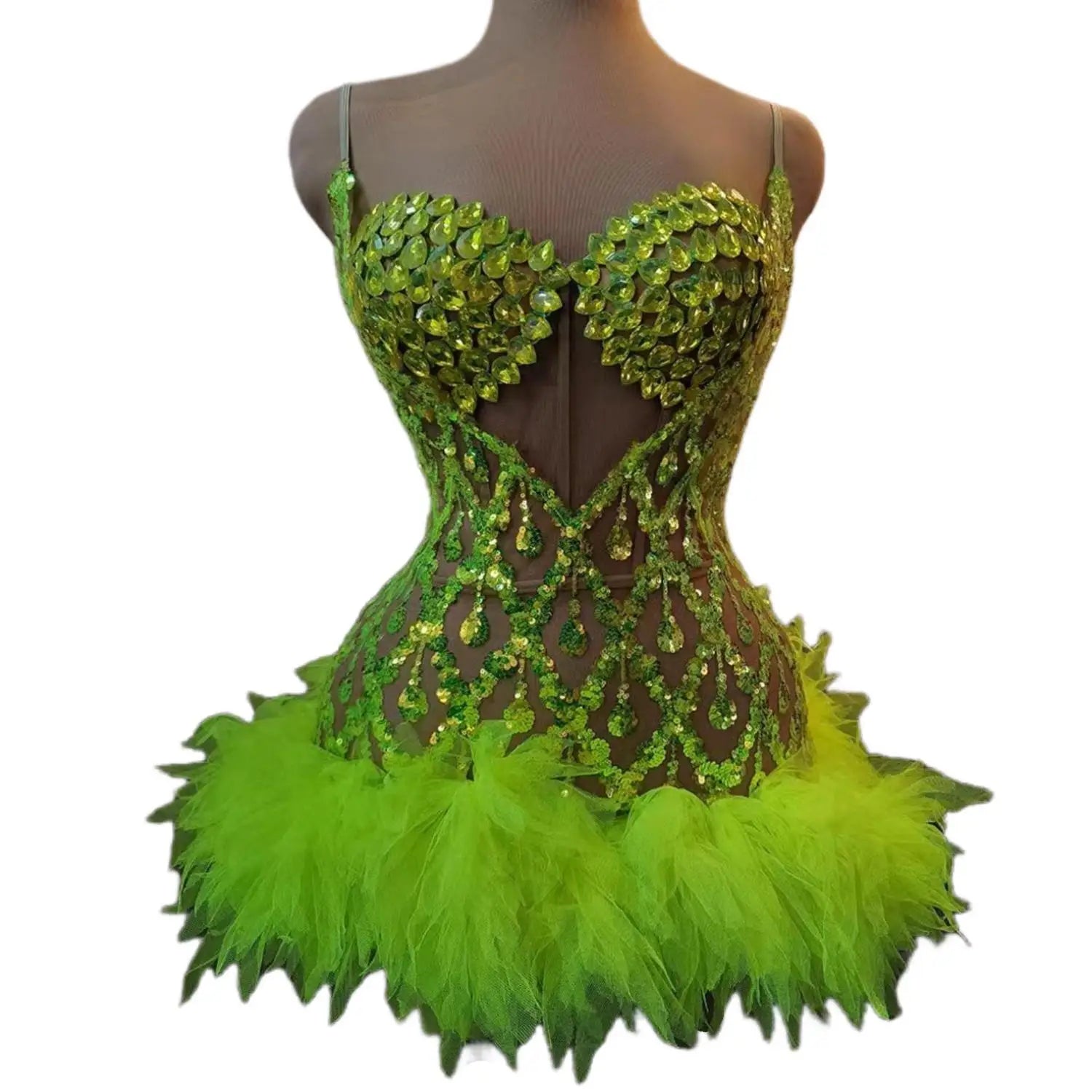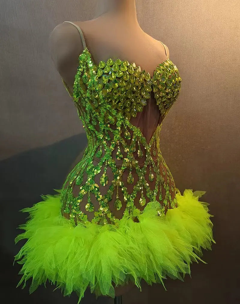 A high‑impact two‑piece performance set featuring asparkly crystals brapaired with asequins skirt— designed for singers, dancers, club performers, birthday celebrations, and stage appearances. The set balances structural support and stage durability with maximum sparkle to read under lights and in photographs.
