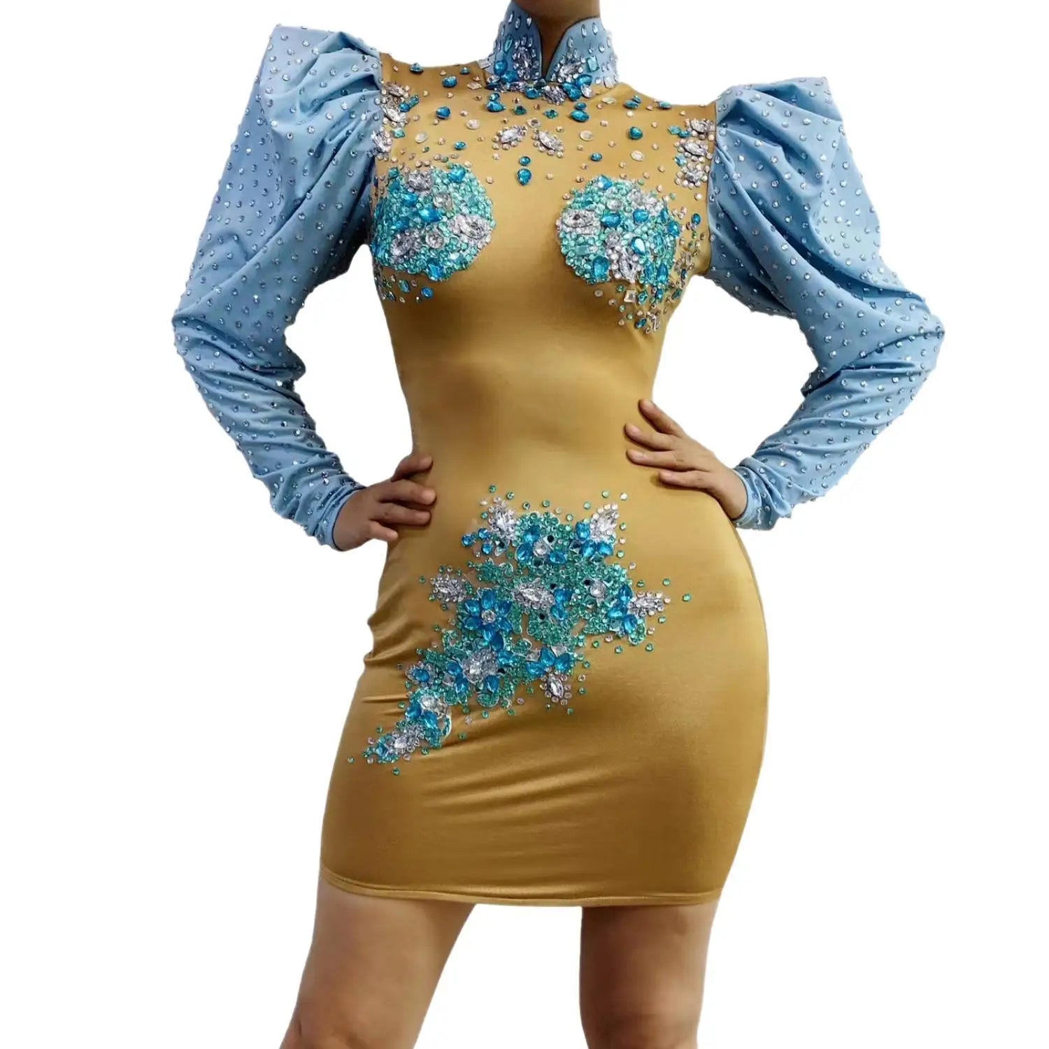 Sparkly Crystals Jumpsuits Women Blue Puff Sleeve Pole Dance Stage Wear Party Costume Nightclub Gogo Drag Queen Outfit Songgaoku
