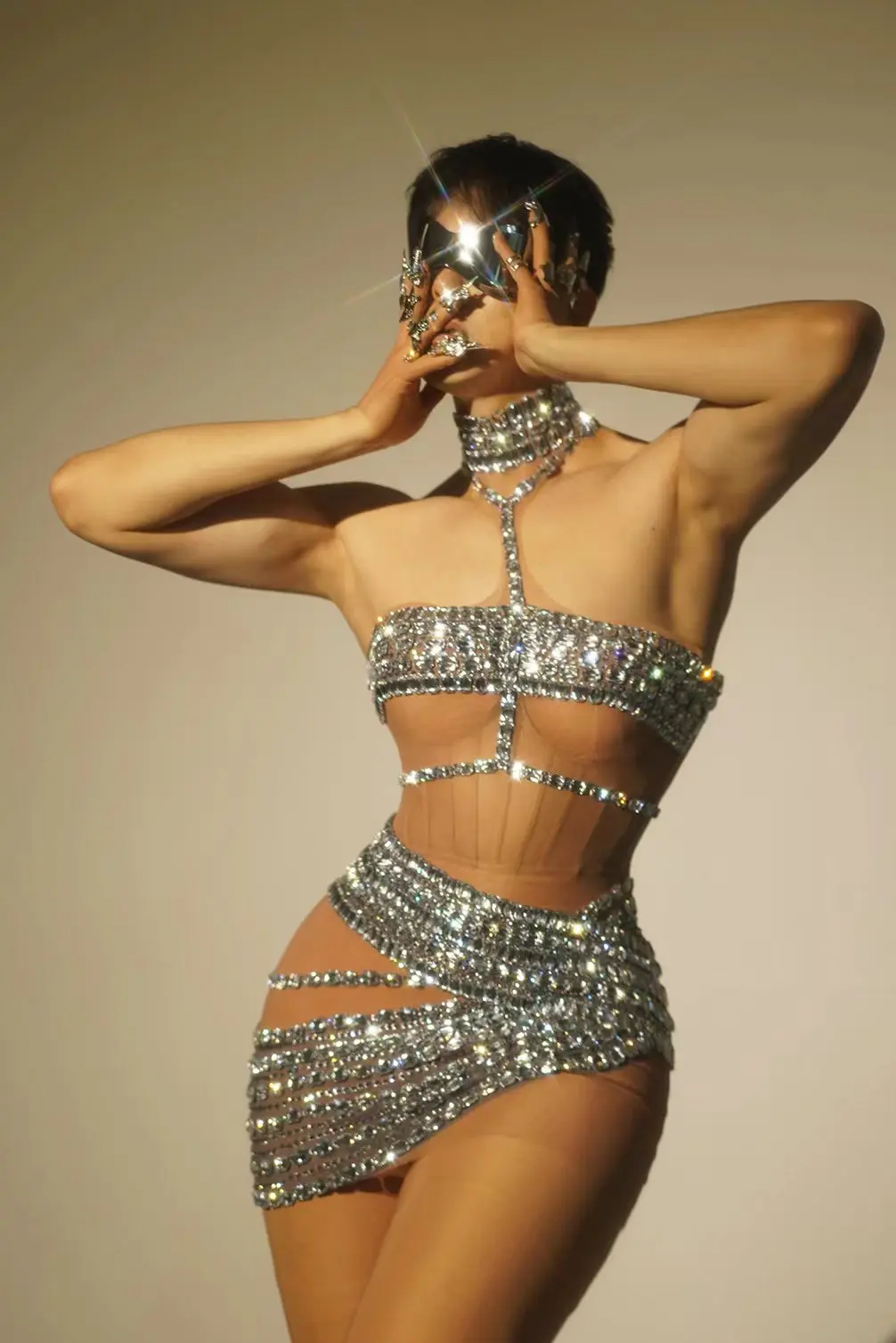 Sparkly Crystals Short Dress for Women Sexy Mesh Party Celebrate Birthday Dress Photo Shoot Wear Performance Costume Fangtang