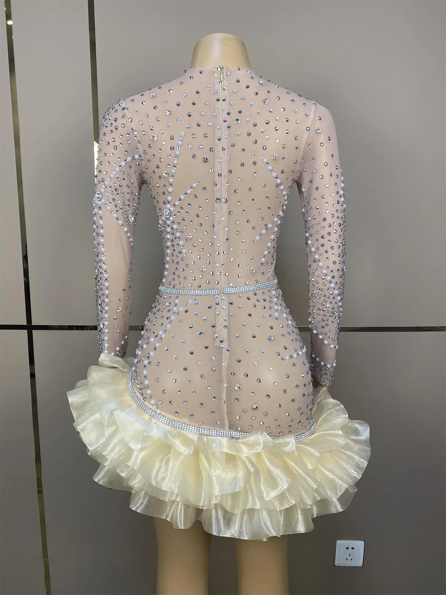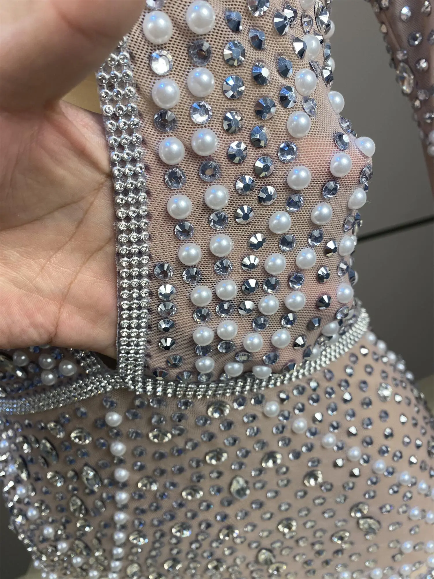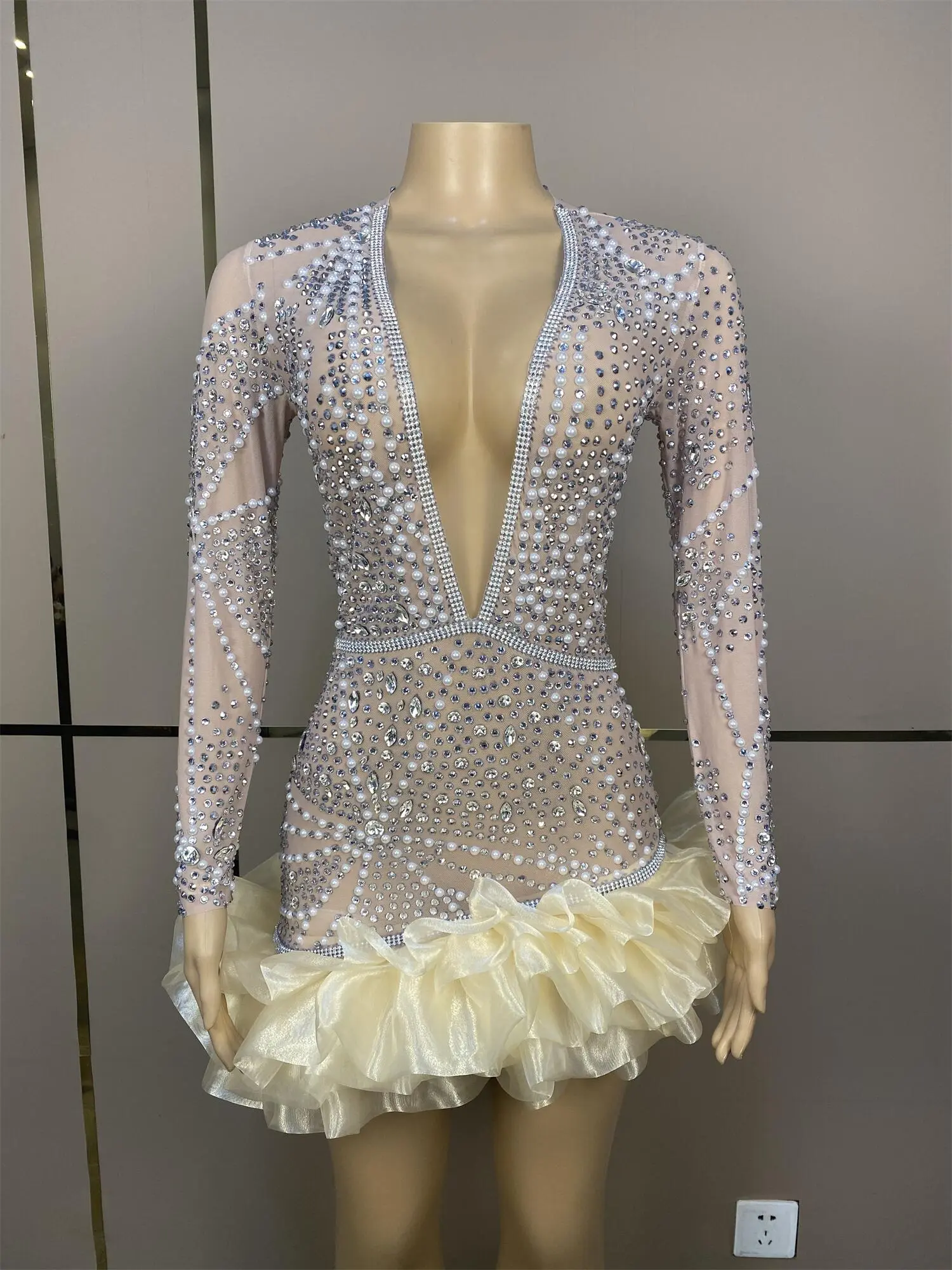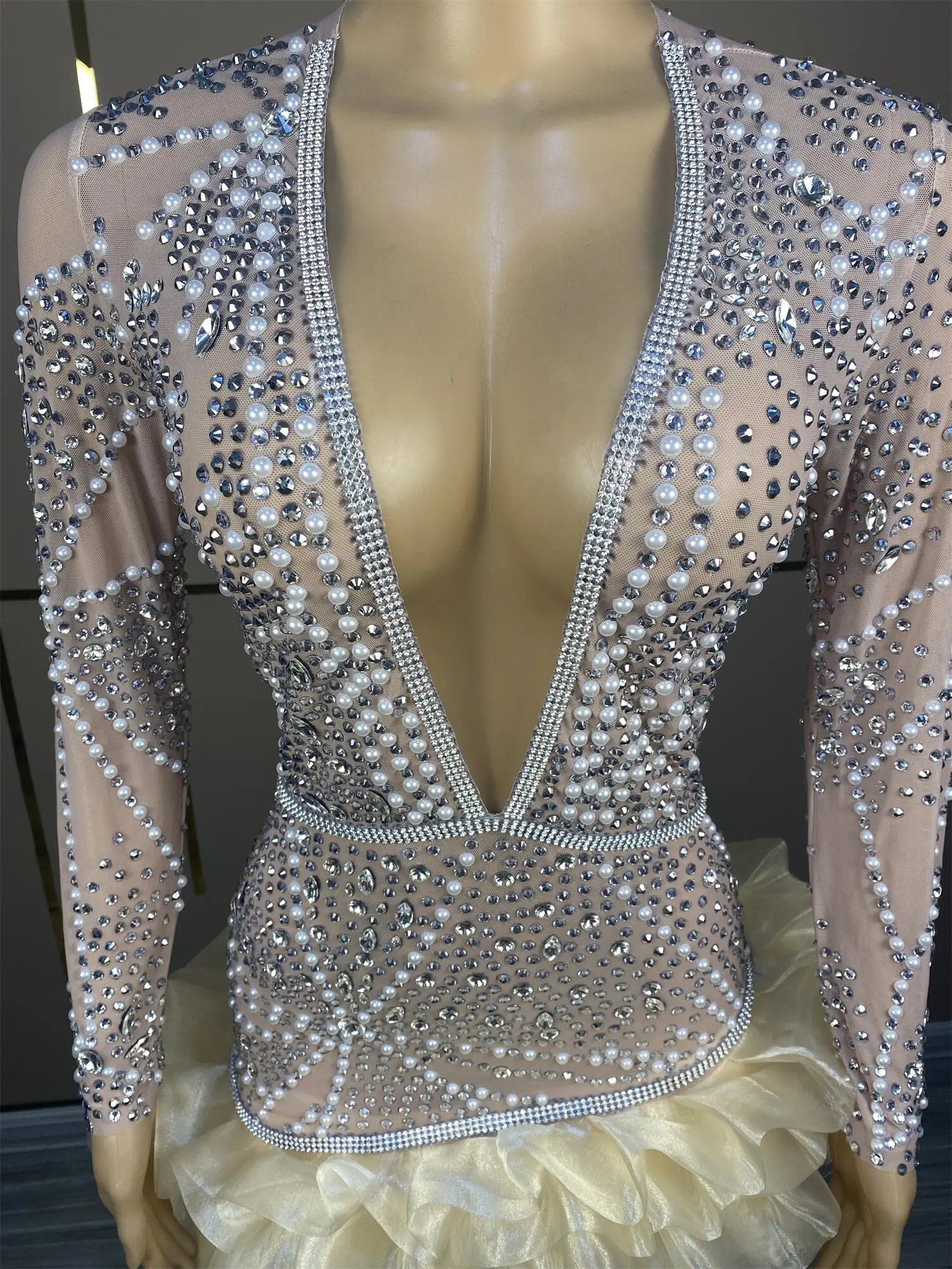 Sparkly Deep V Pearl Rhinestone Dresses Women Birthday Party Queen Dress Stretch Sheer Mesh Night Out Performance Wear Kaishan