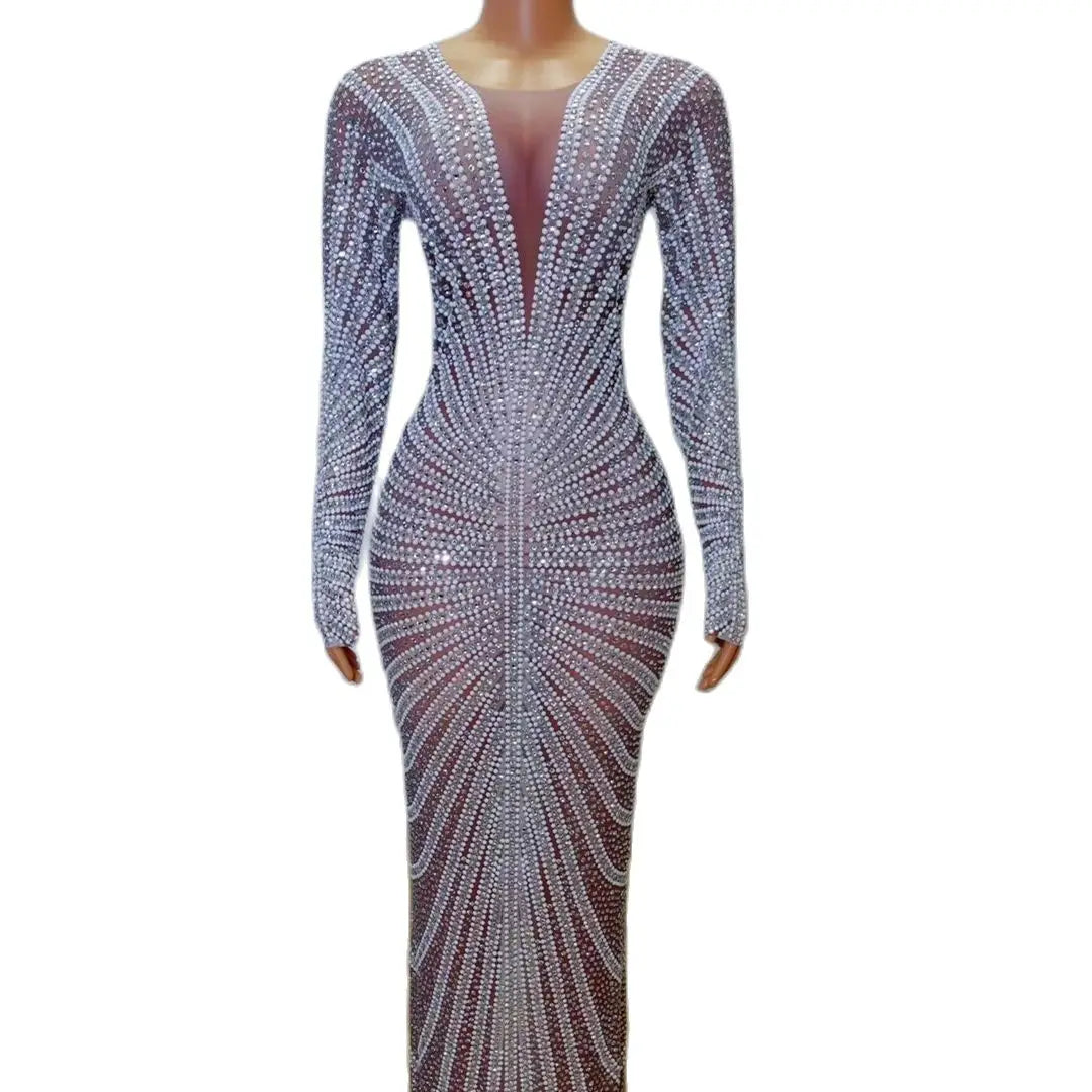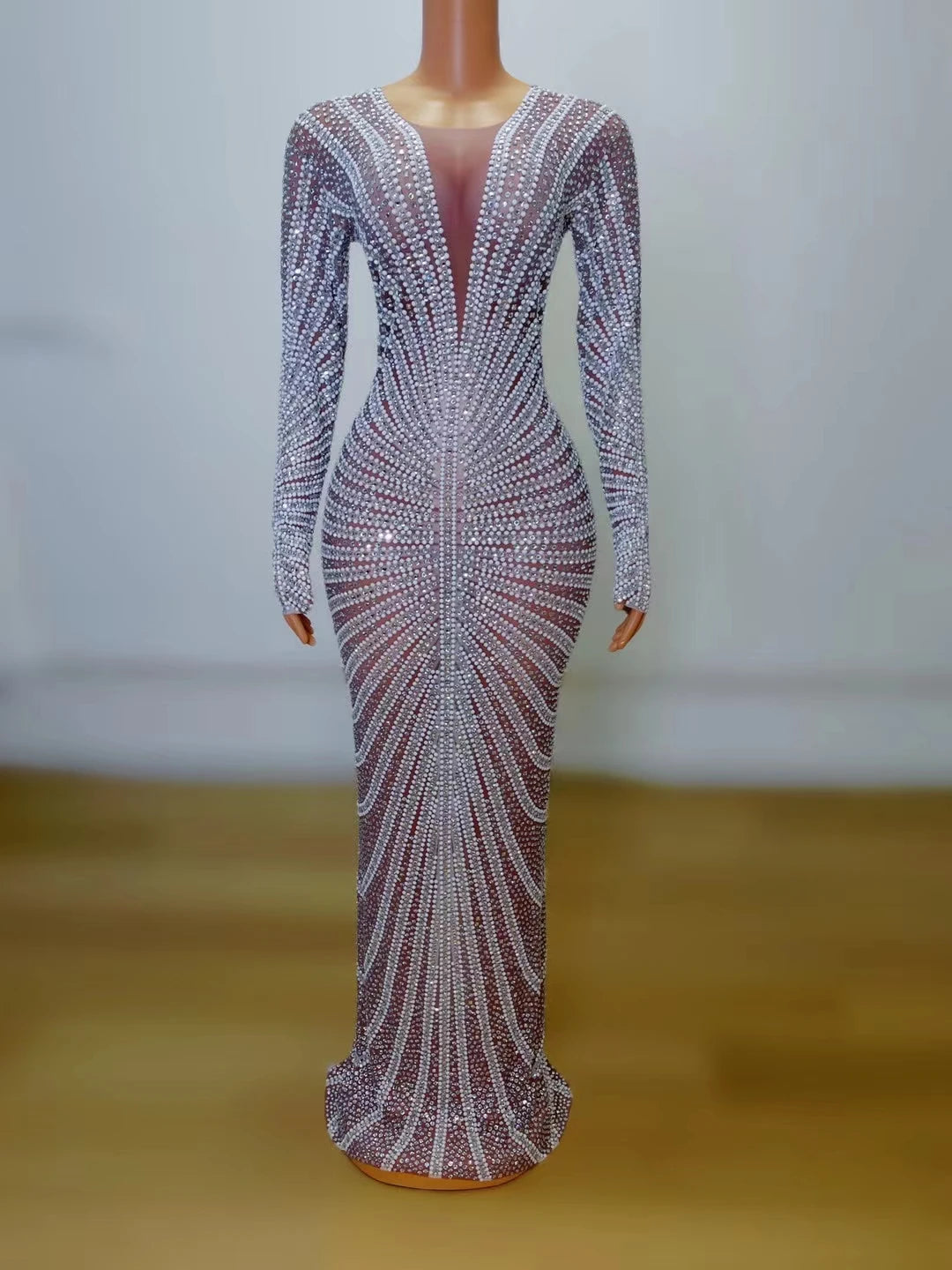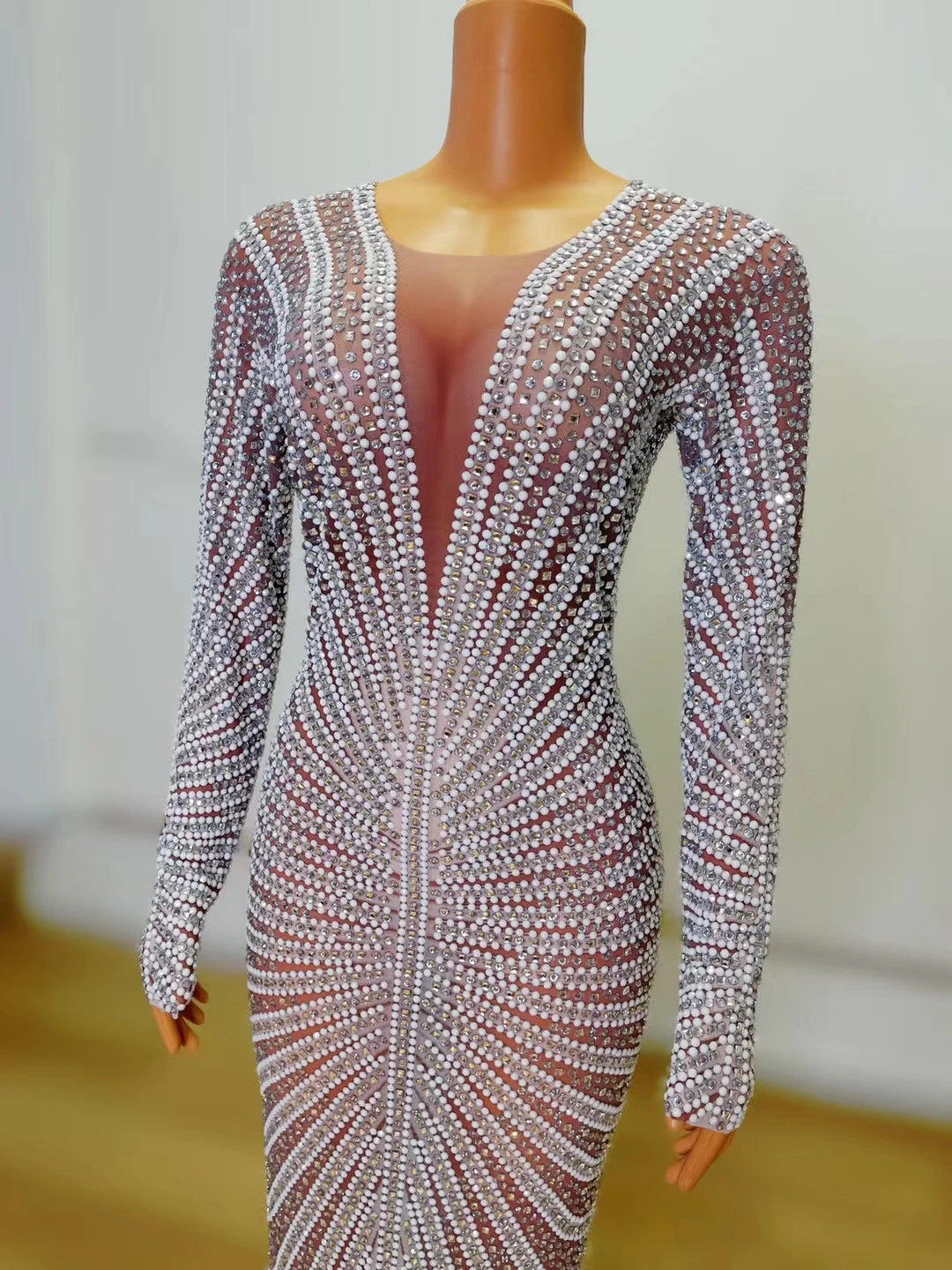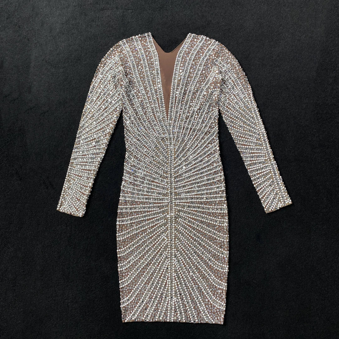Sparkly Diamond Pearl Dress Long Sleeve Tight Short Dress Women Birthday Celebrate Costume Brand Designer Evening Dress