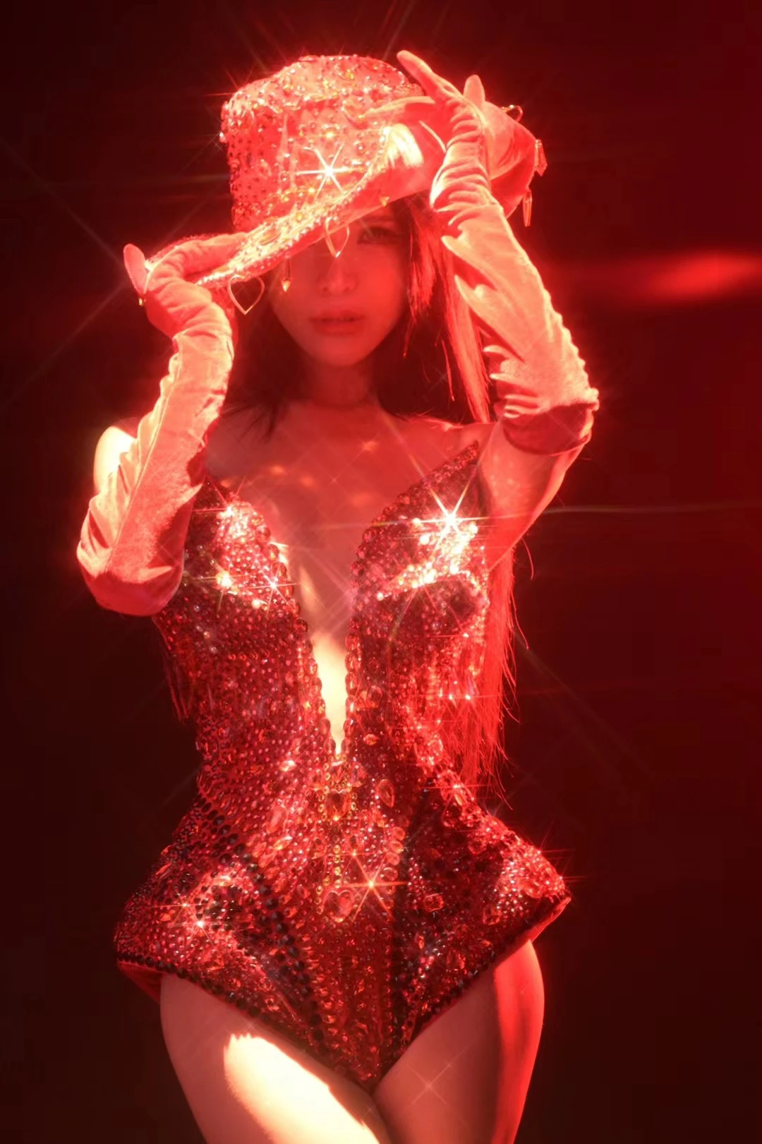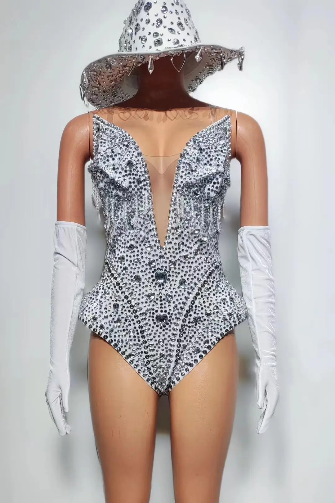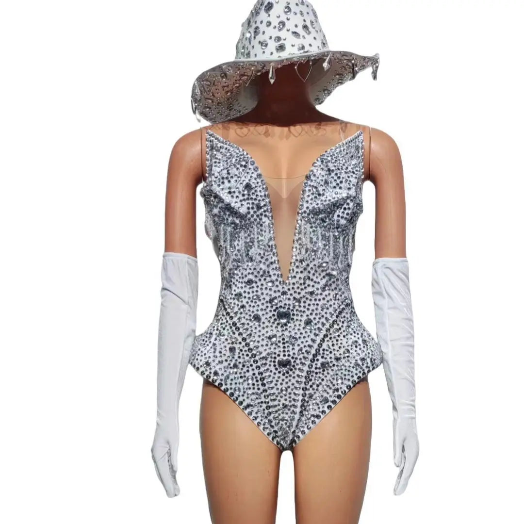 Sparkly Diamonds Deep V Neck Bodysuit Gloves Hats Set for Women Sexy Performance Dance Costume Dancer Show Stage Wear Qianwan