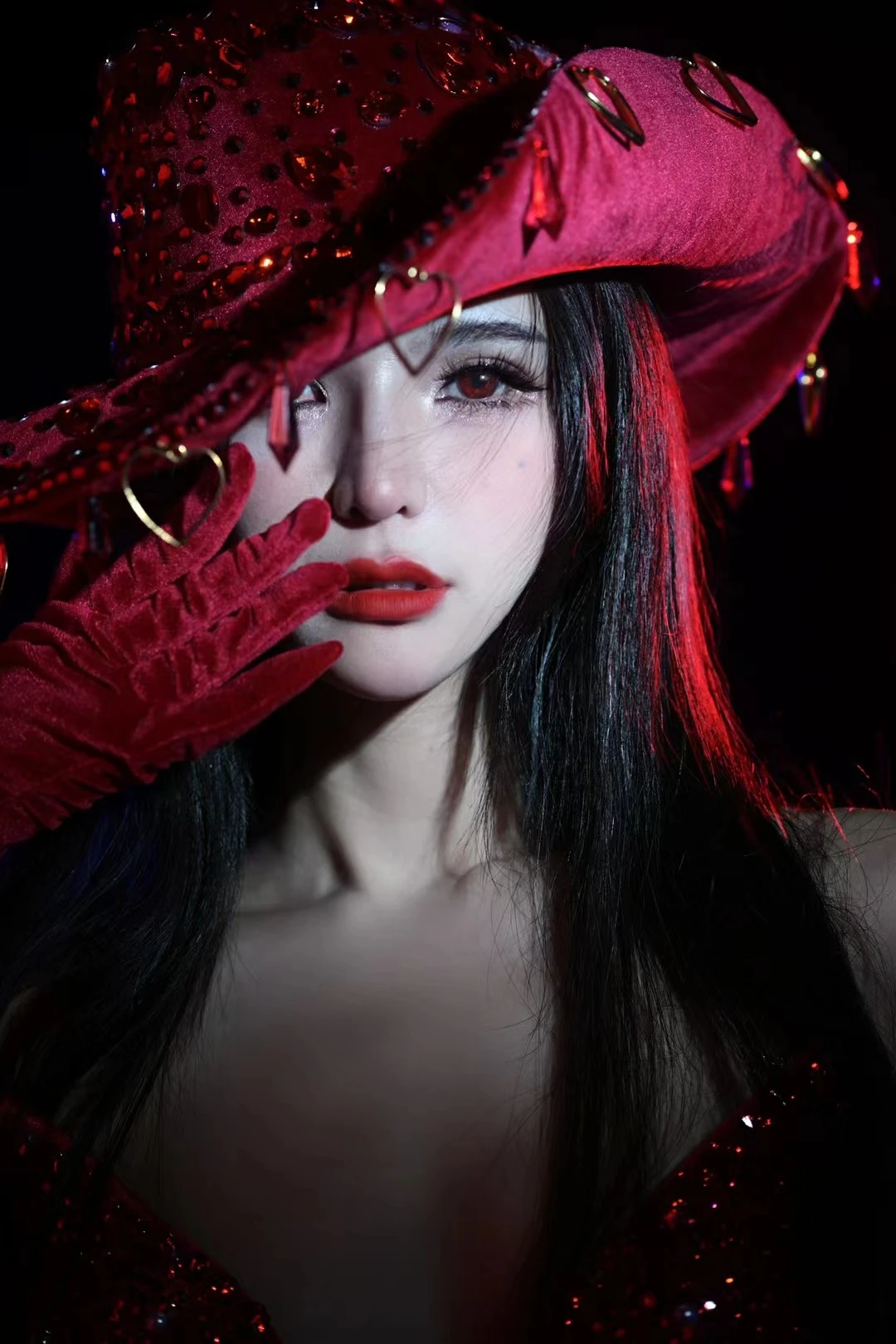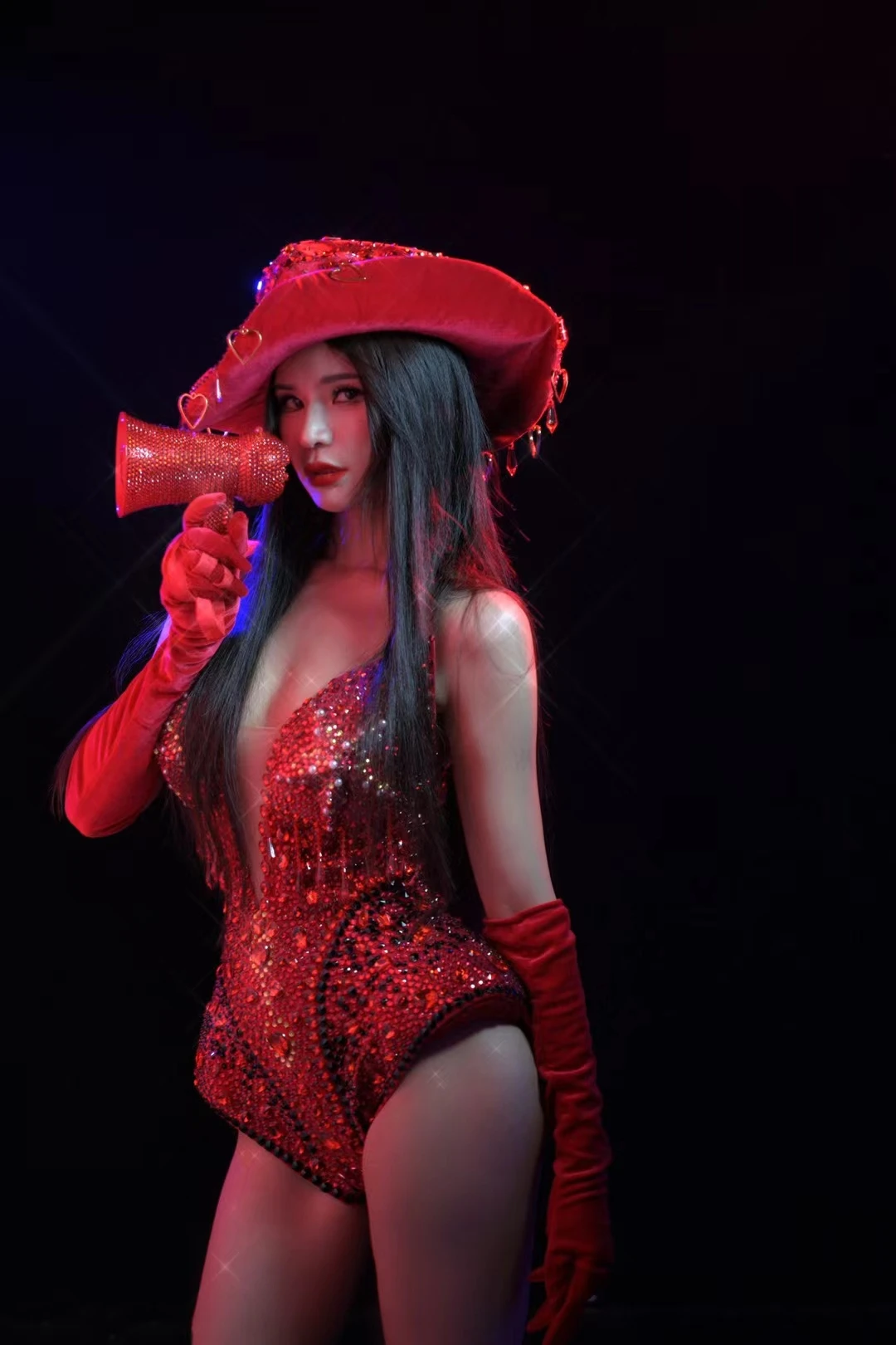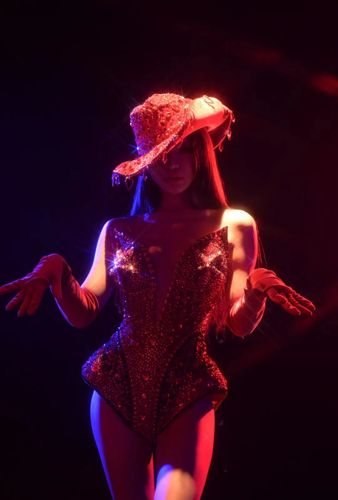 Sparkly Diamonds Deep V Neck Bodysuit Gloves Hats Set for Women Sexy Performance Dance Costume Dancer Show Stage Wear Qianwan