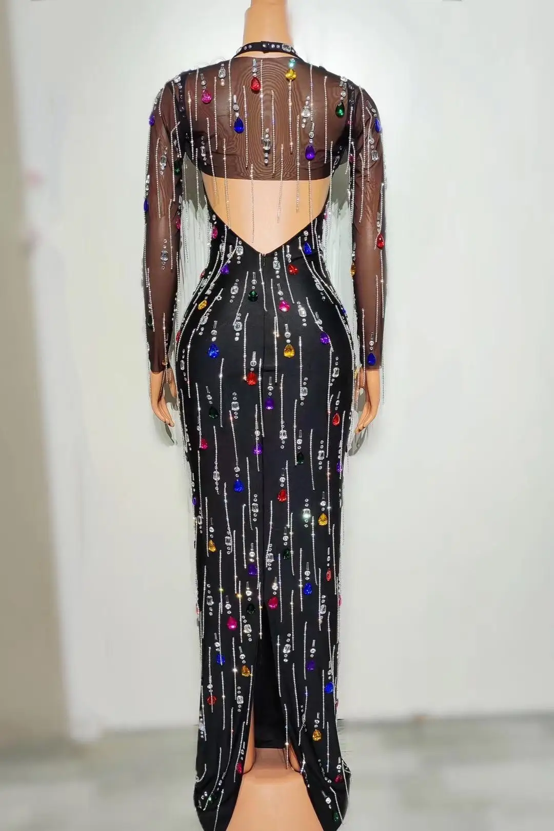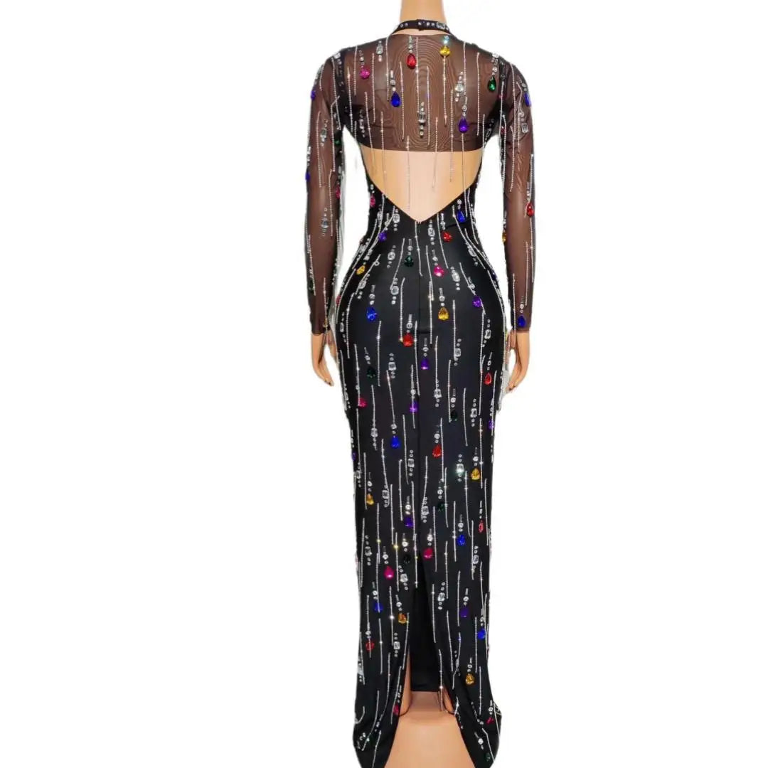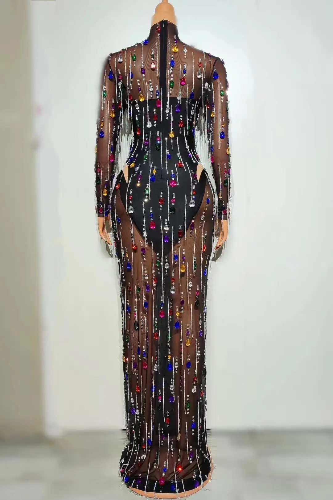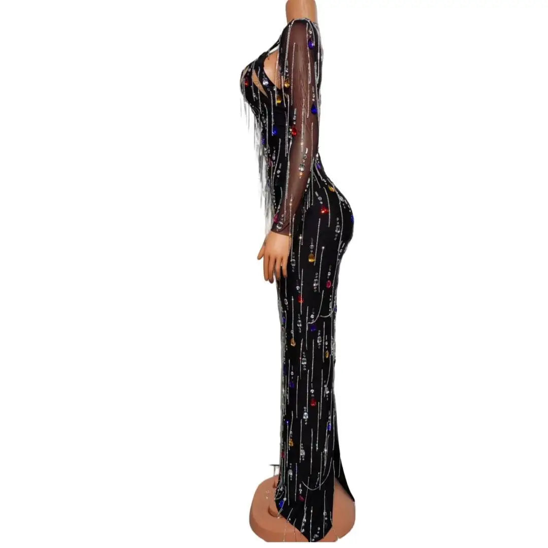 Sparkly Diamonds Long Dress for Women Sexy Mesh Wedding Celebrate Birthday Evening Prom Dress Photo Shoot Stage Wear Fugui