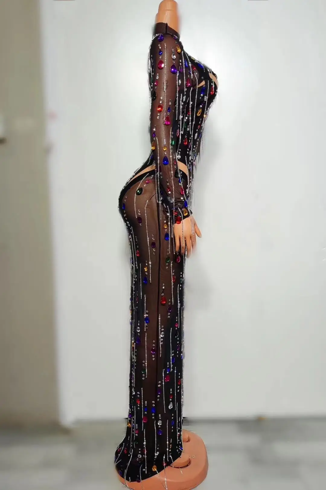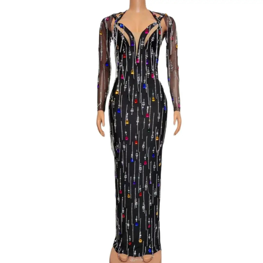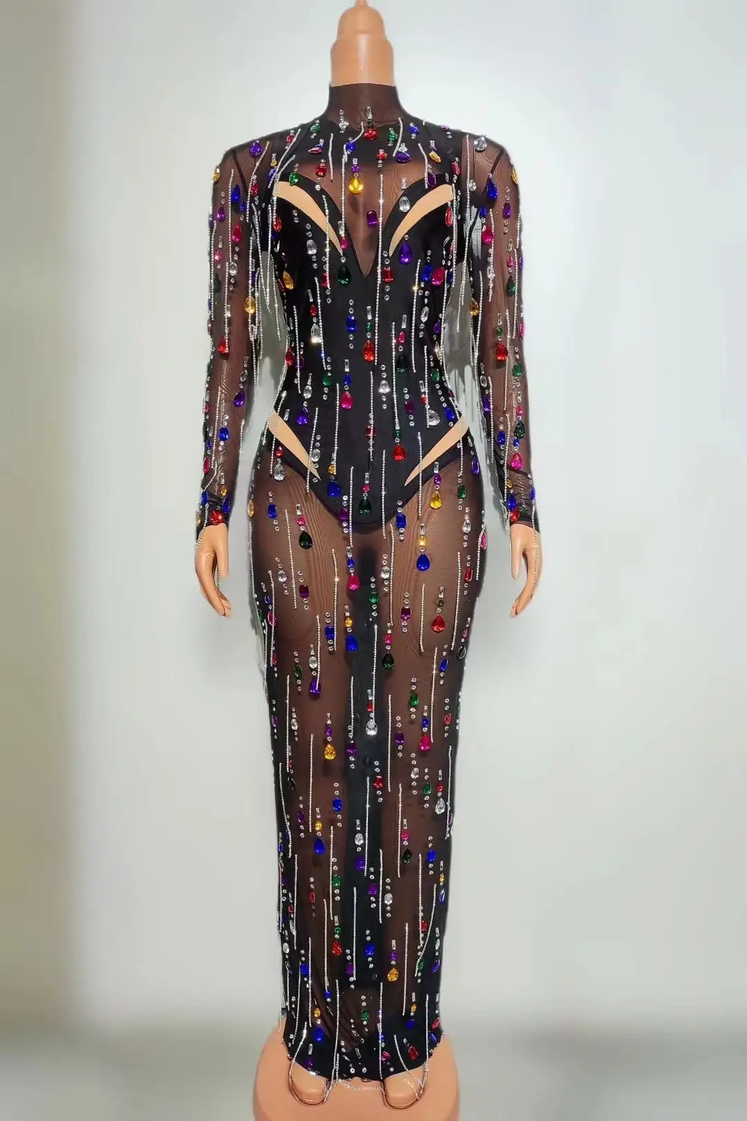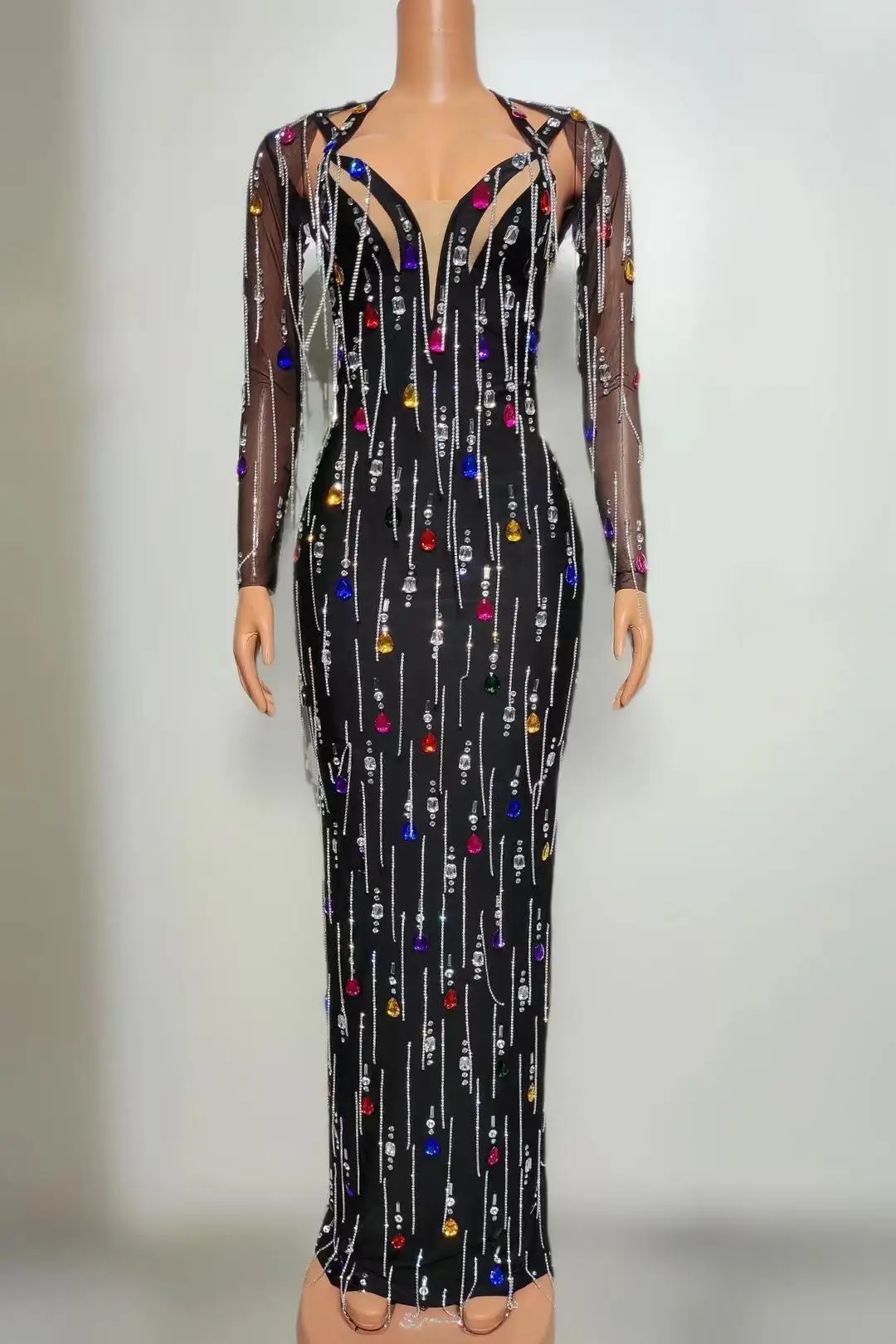 Sparkly Diamonds Long Dress for Women Sexy Mesh Wedding Celebrate Birthday Evening Prom Dress Photo Shoot Stage Wear Fugui