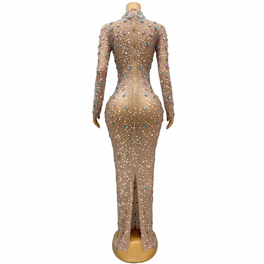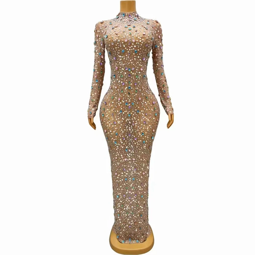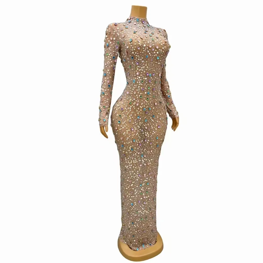 Sparkly Diamonds Pearls Long Dress for Women Sexy Mesh Celebrate Evening Prom Birthday Photo Shoot Dress Singer Show Stage Wear