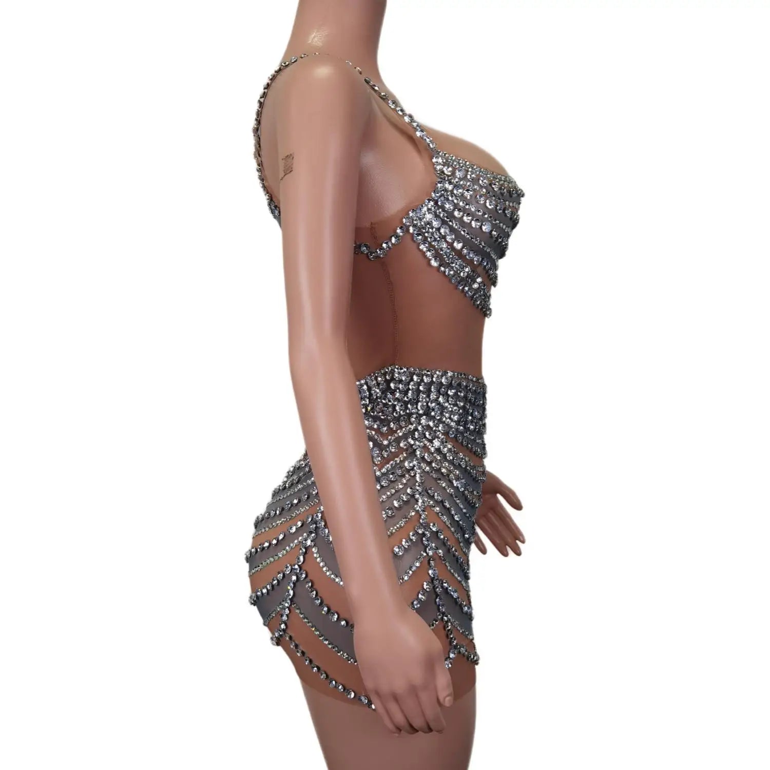 Dazzle in this sleeveless short dress adorned with sparkly diamonds, perfect for women who want to look sexy and glamorous. Whether you're attending a party, celebrating a birthday, or performing on stage, this dress is designed to make you stand out. The see-through design adds a touch of allure, while the sparkly diamonds elevate the dress to a whole new level of sophistication. Get ready to shine and make a statement in this sexy and eye-catching outfit that is sure to turn heads wherever you go.