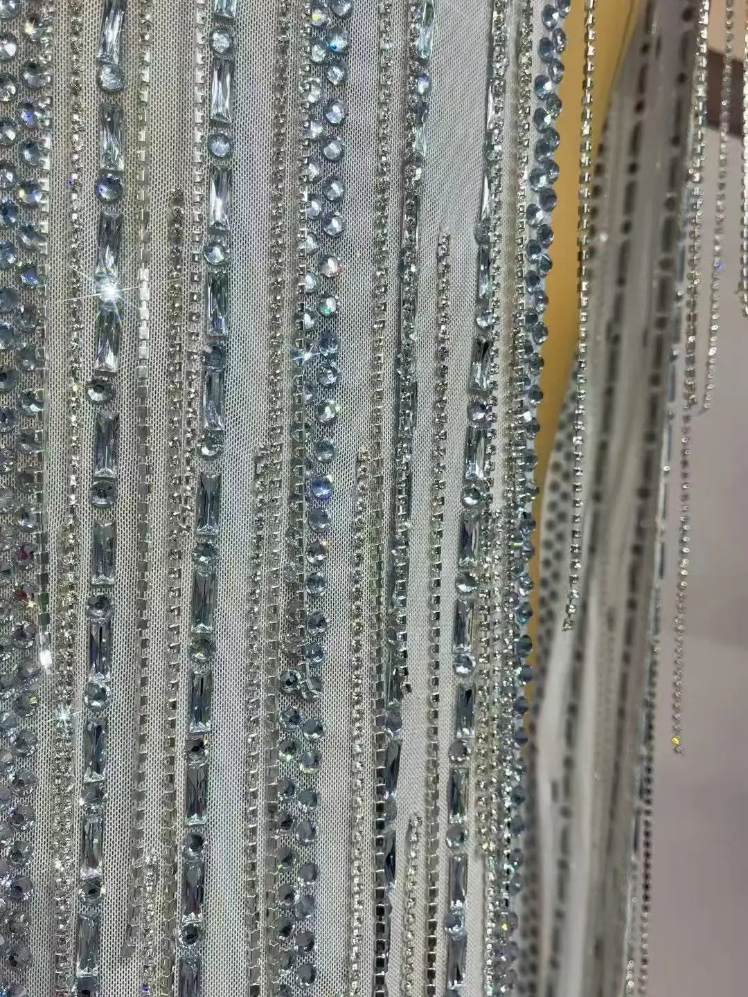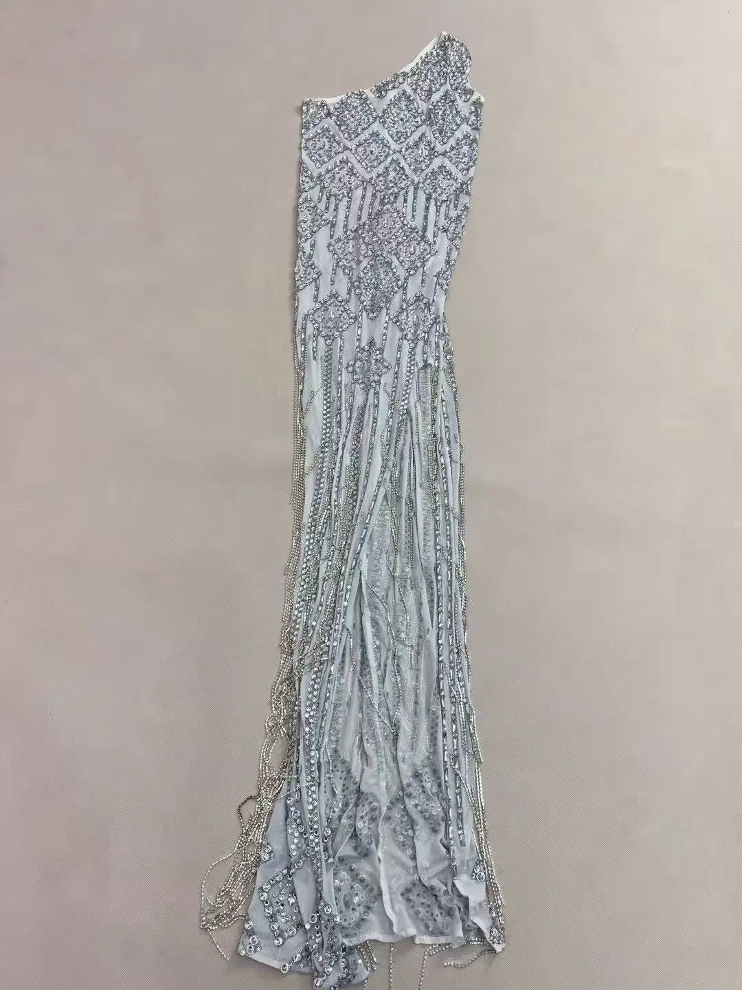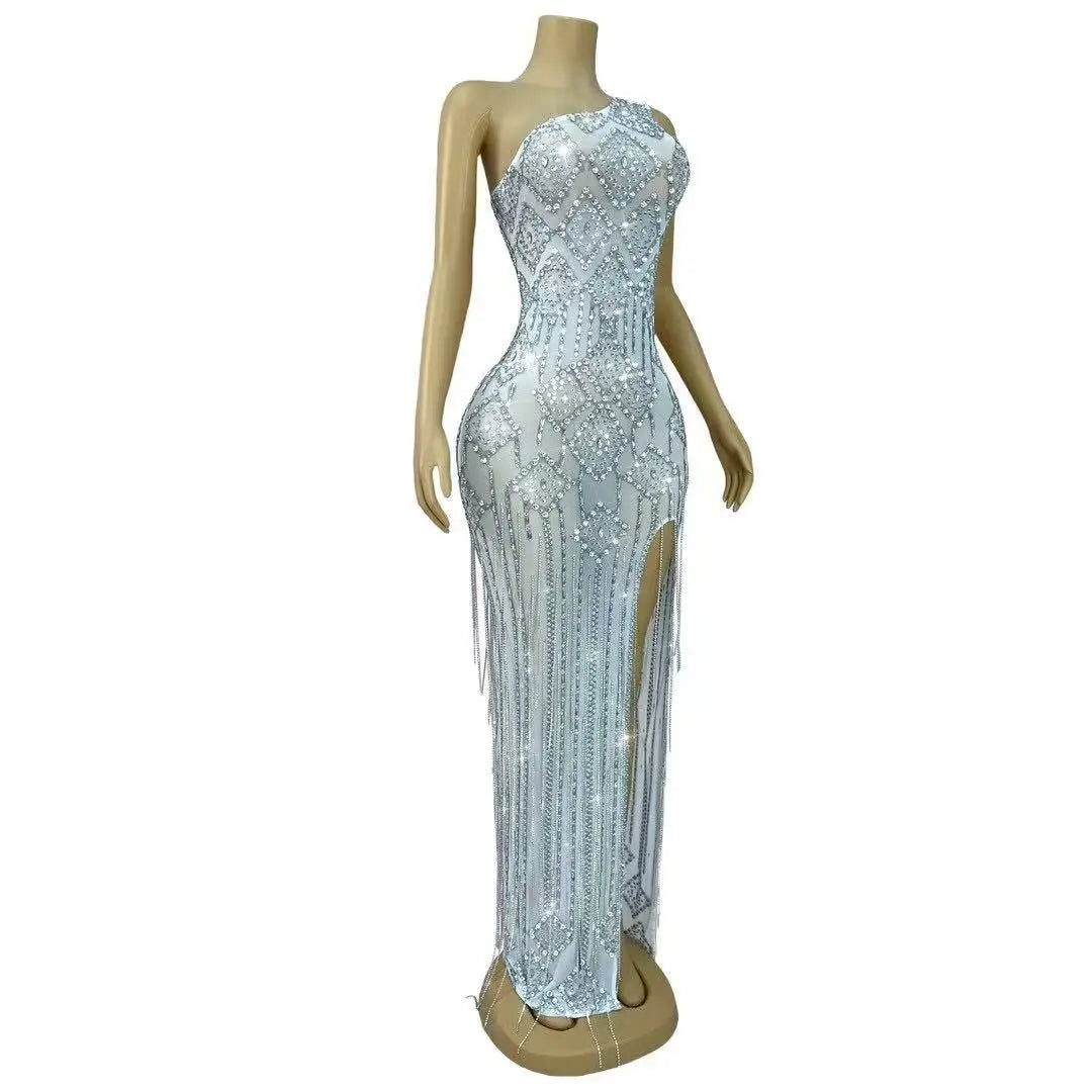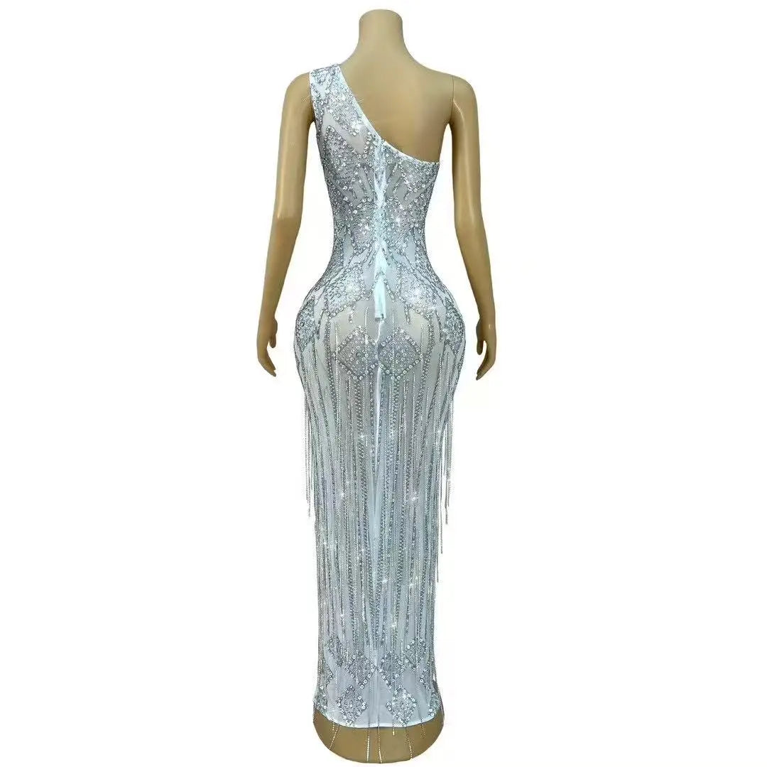 - Make every moment cinematic in our Sparkly Elegant One‑Shoulder Dress. The asymmetric neckline flatters the collarbone while hand‑applied crystals and faceted rhinestones catch lights and camera flashes. Subtle chain detailing along the shoulder and drape adds movement and modern edge, turning every step into a shimmering statement. Fully lined with reinforced seams and a hidden zipper, this dress balances show‑stopping glamour with comfort for long evenings and performances.