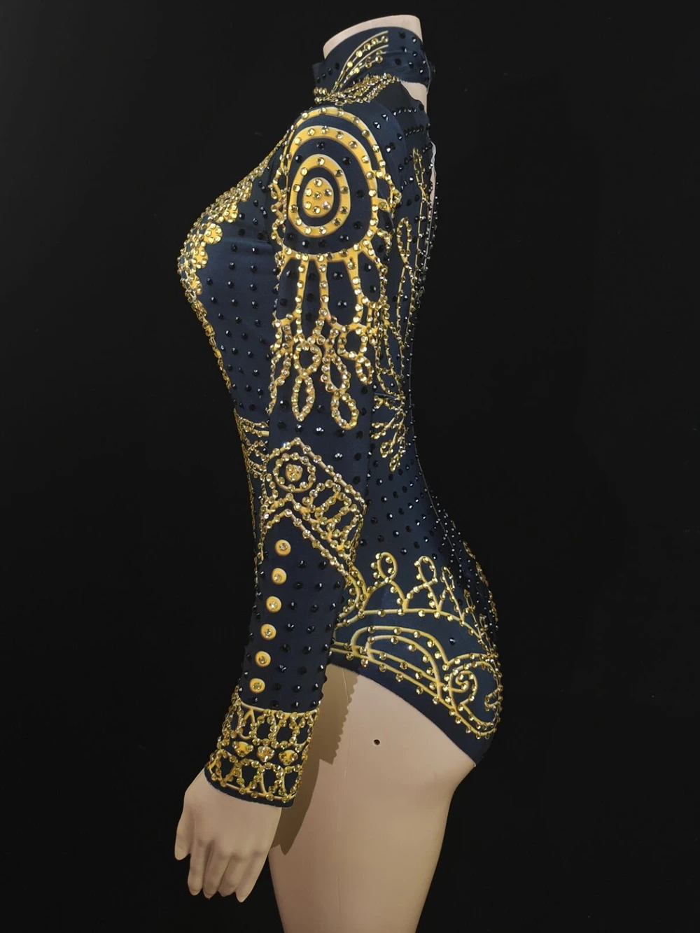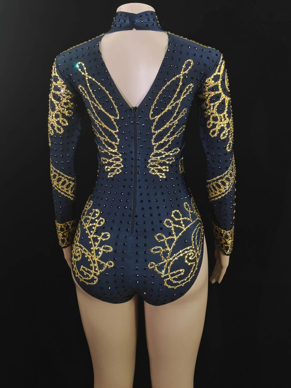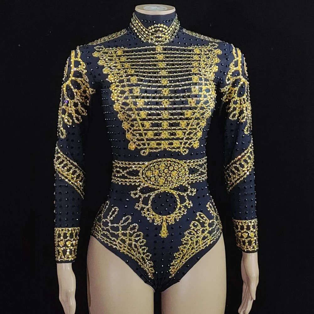 Sparkly Gold Black Rhinestones Leotard Long Sleeve Female Performance Dance Costume Singer Show Stage Wear Nightclub Outfit
