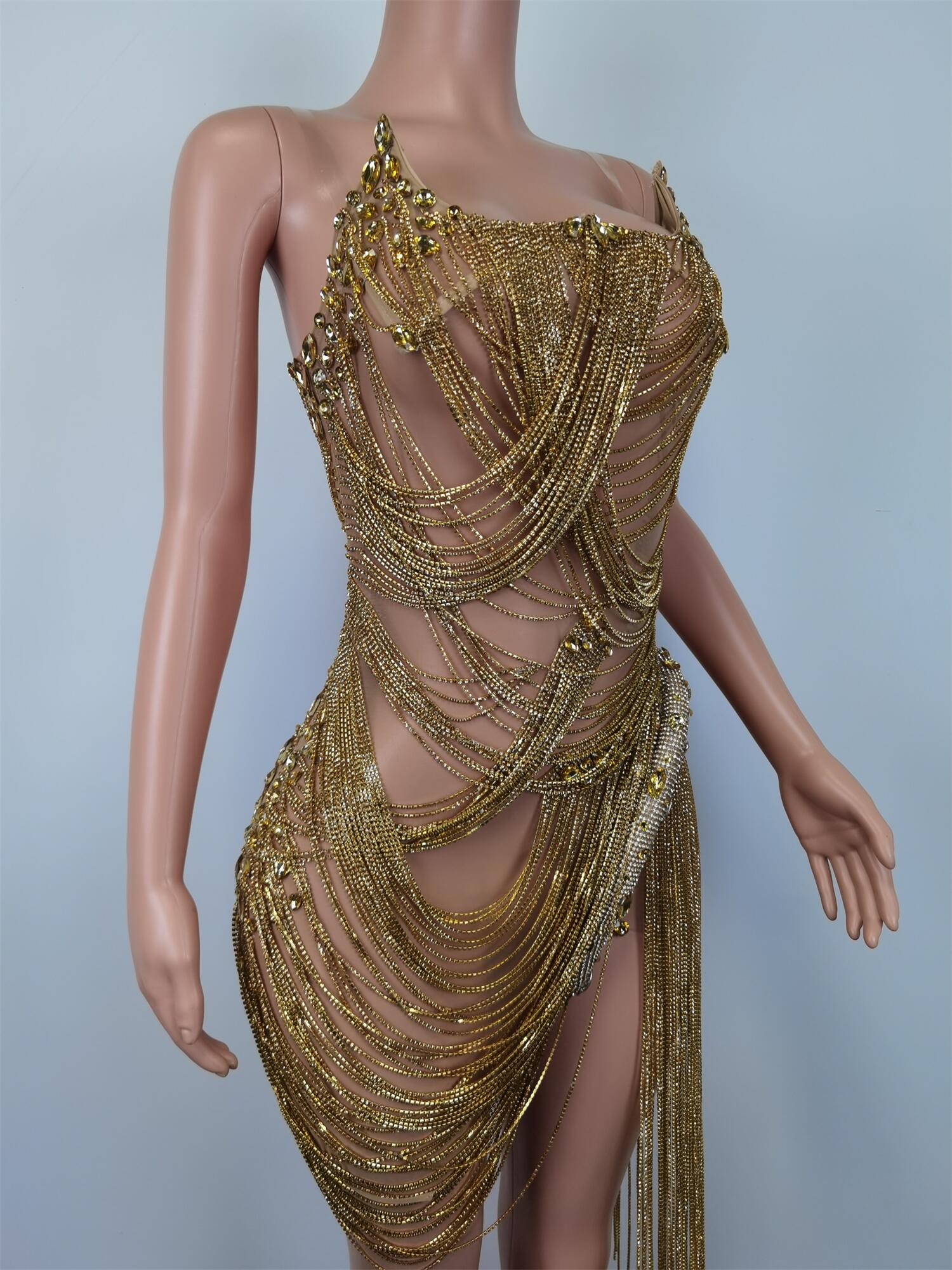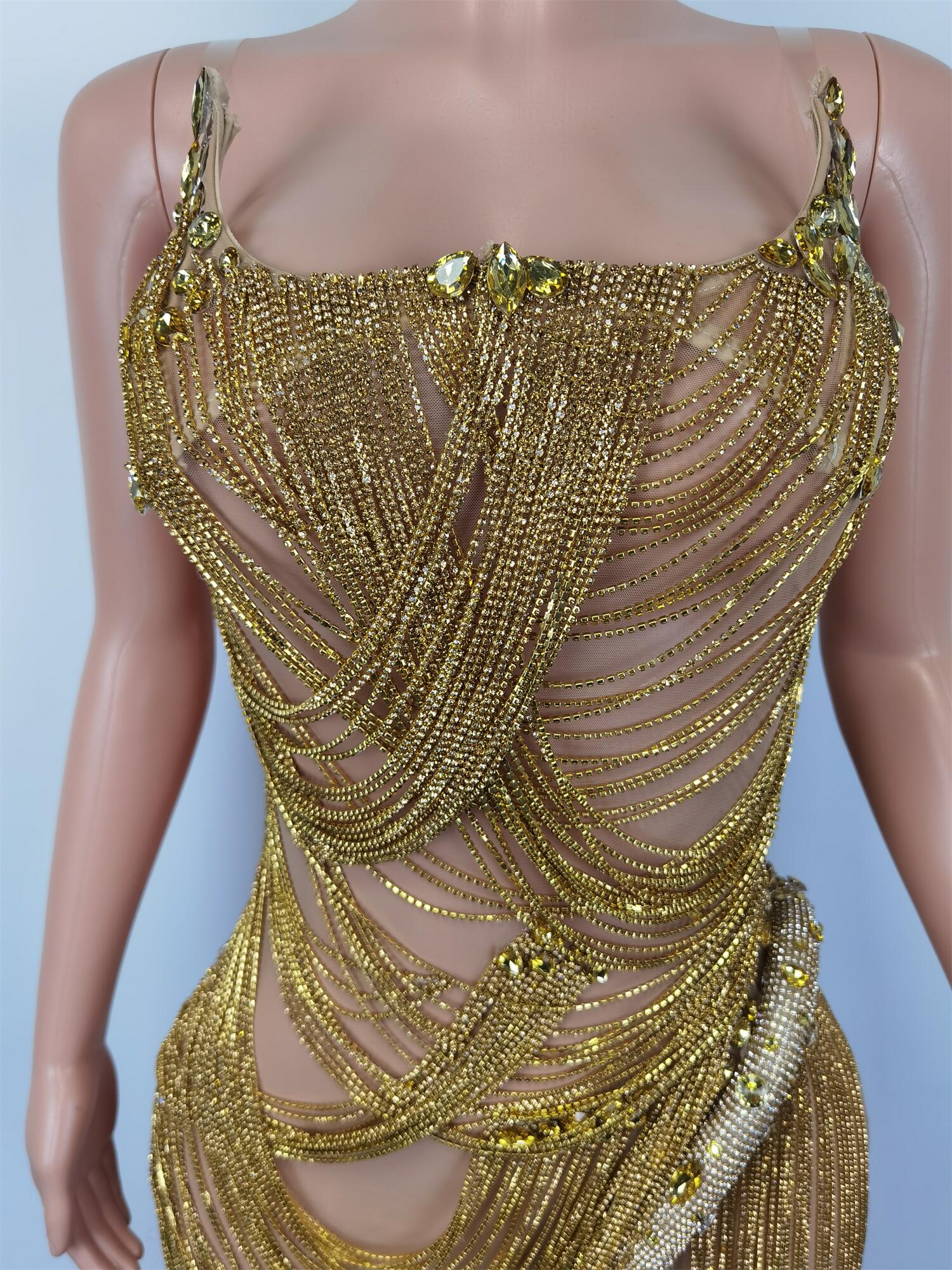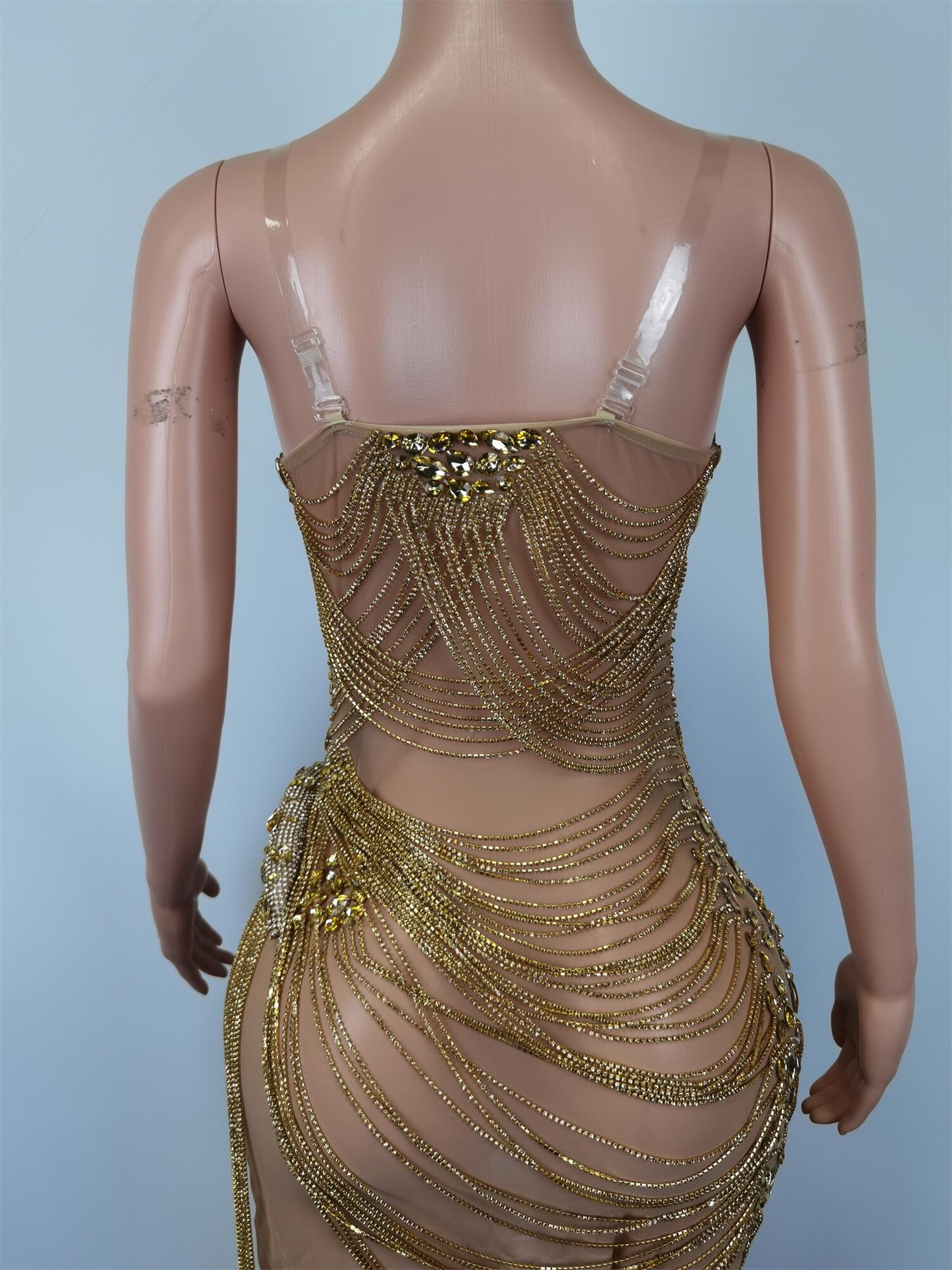 Sparkly Gold Drill Women Prom Dress Sexy See Through Birthday Queen Outfit Singer Stage Performance Wear Party Costume Luoli