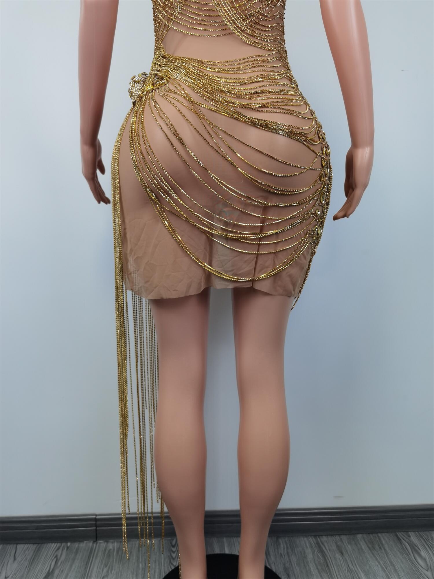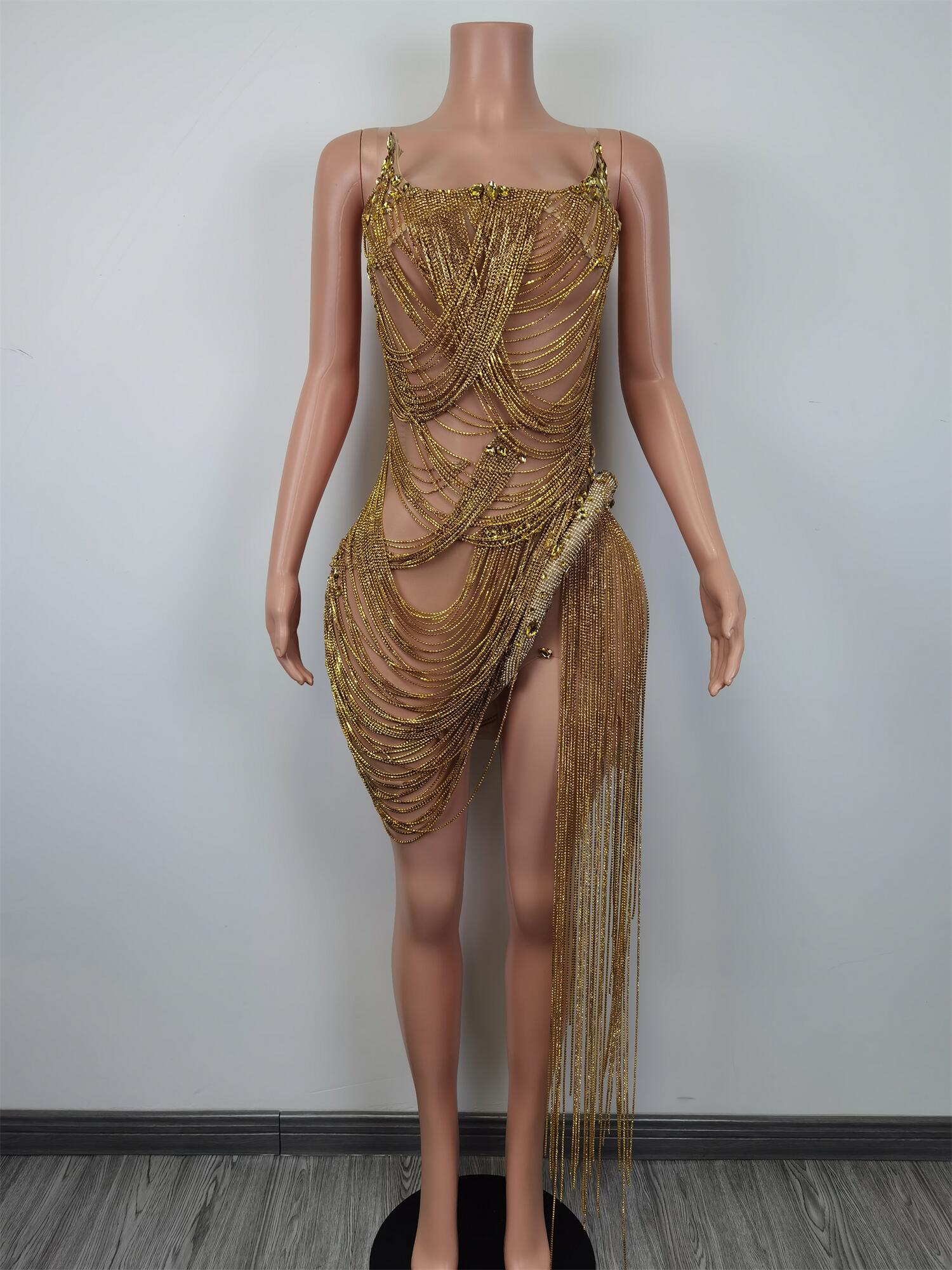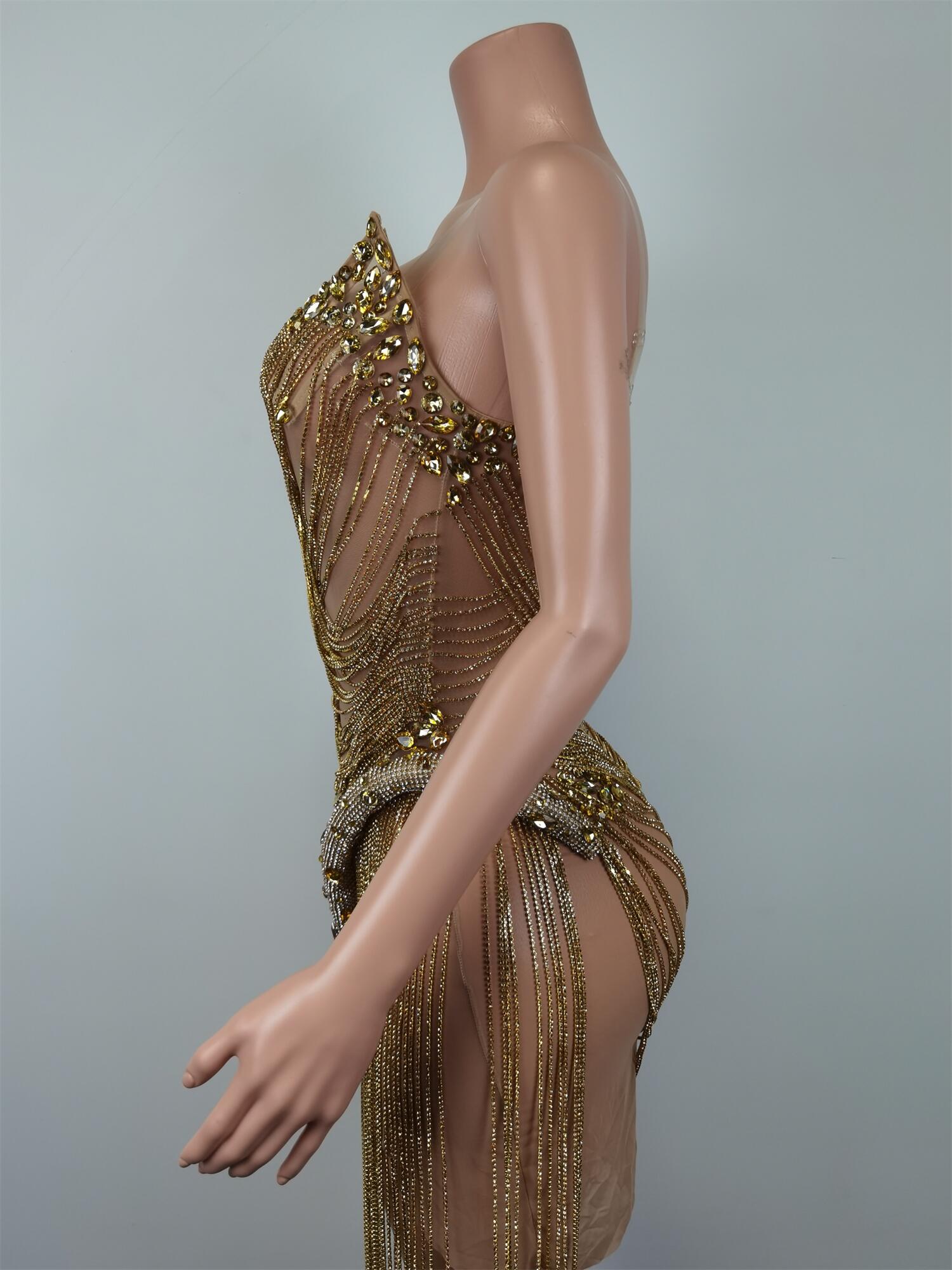 Sparkly Gold Drill Women Prom Dress Sexy See Through Birthday Queen Outfit Singer Stage Performance Wear Party Costume Luoli