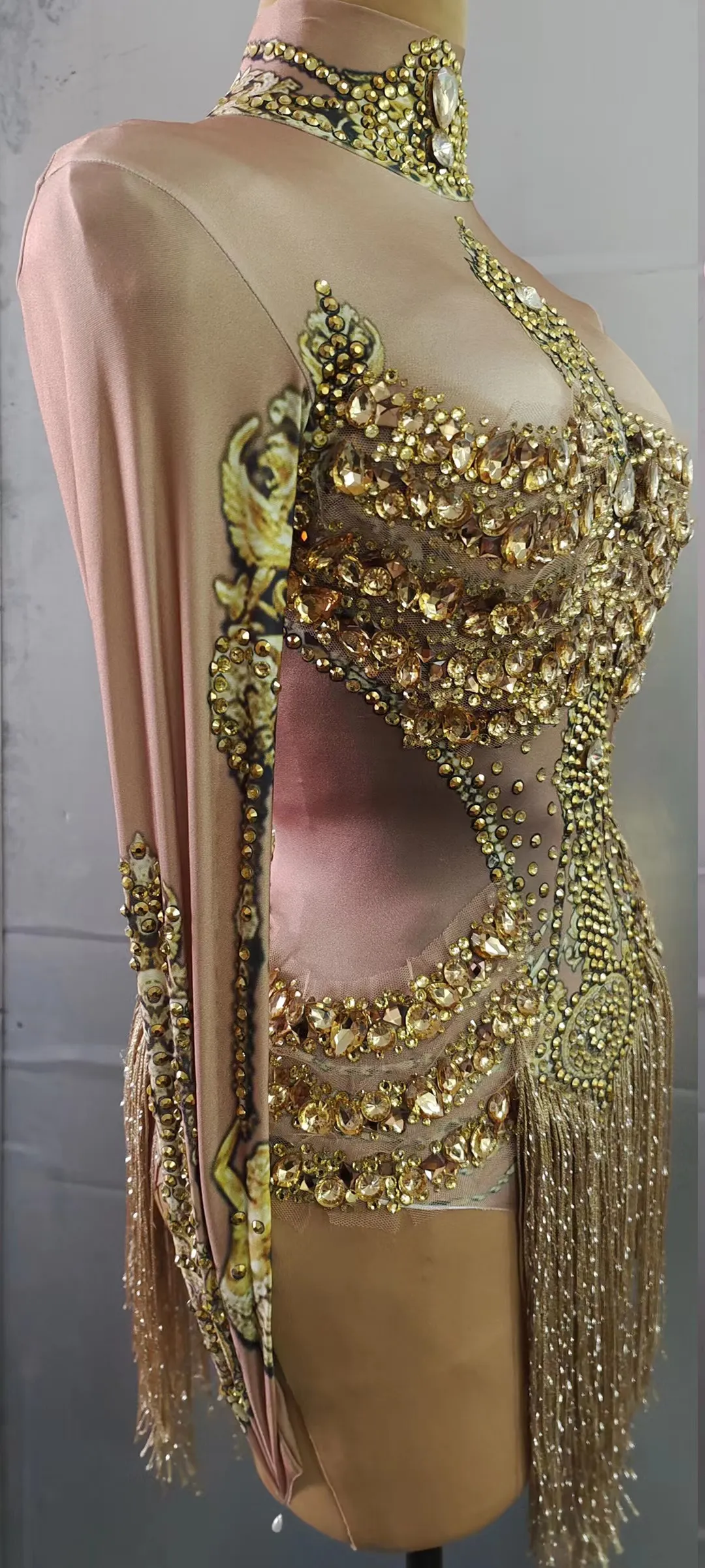 Sparkly Gold Rhinestones Fringe Leotard WomenBirthday Nightclub Party Outfit Sexy DanceBodysuit Performance Show Stage Wear