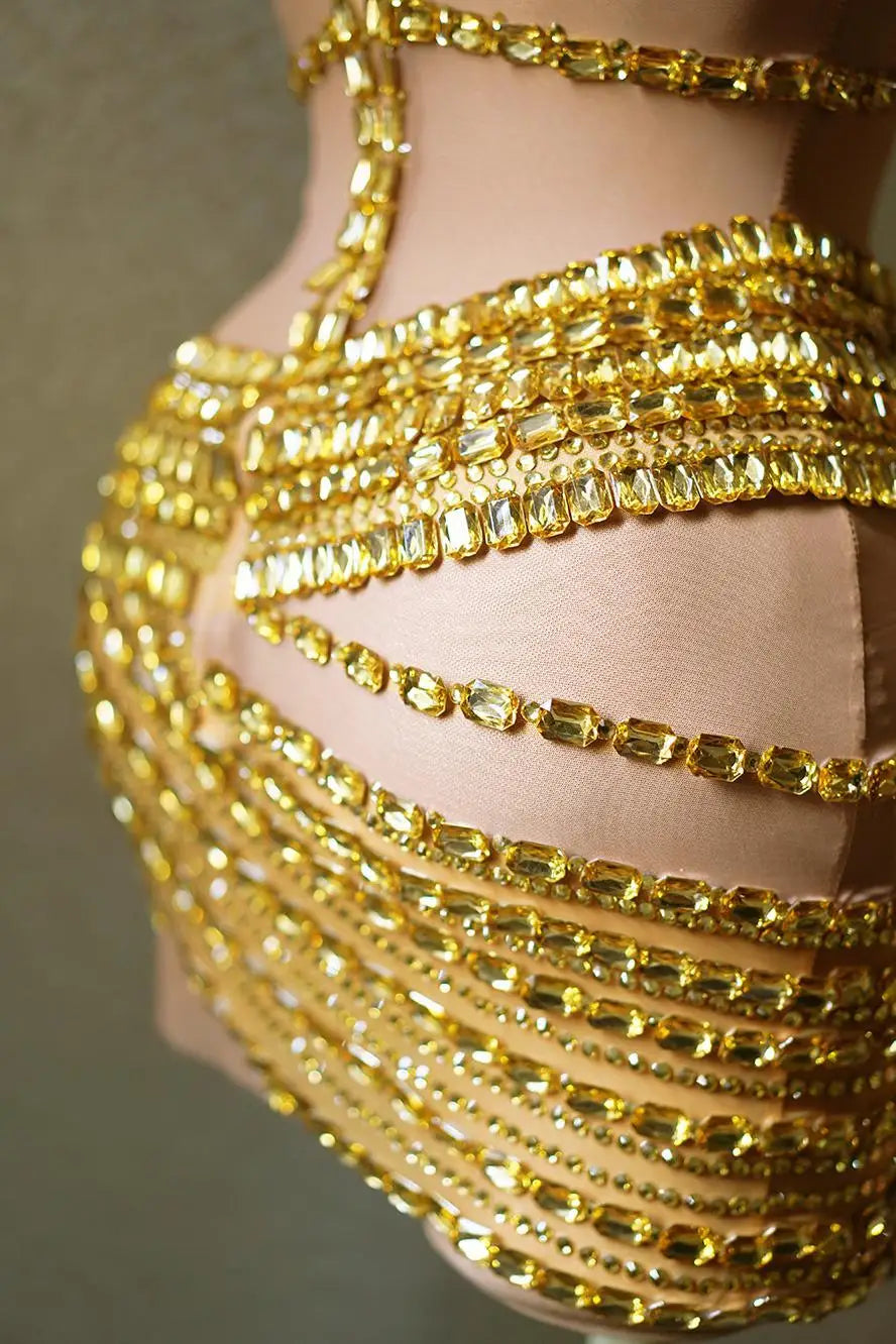 Sparkly Gold Rhinestones Short Dress Women Sexy Celebrate Prom Gown Lady Birthday Party Cocktail Dress Stage Wears Fangtang