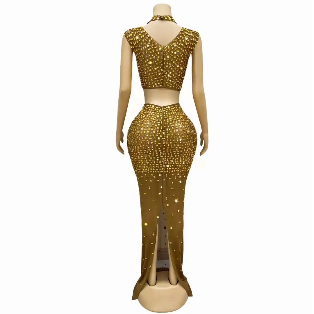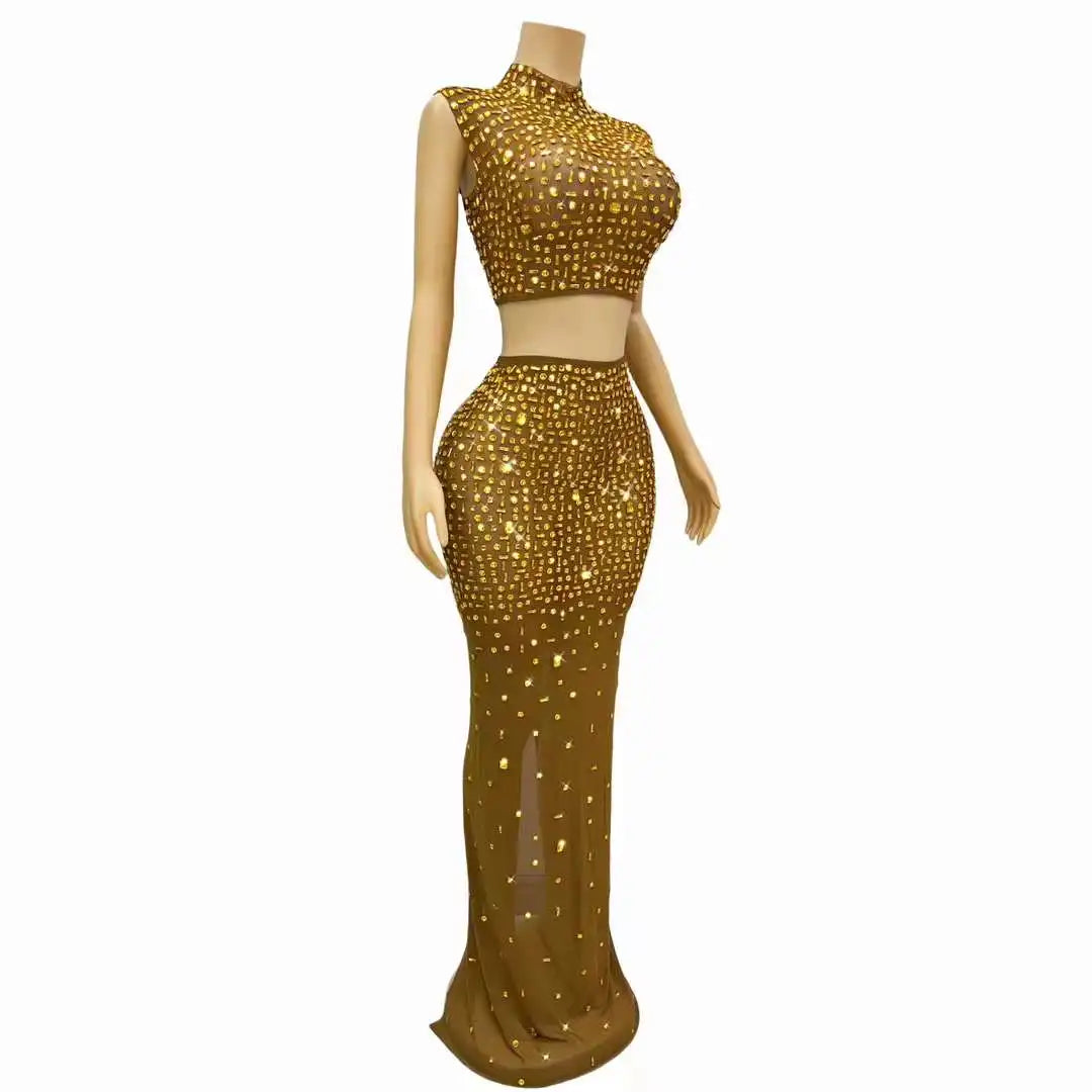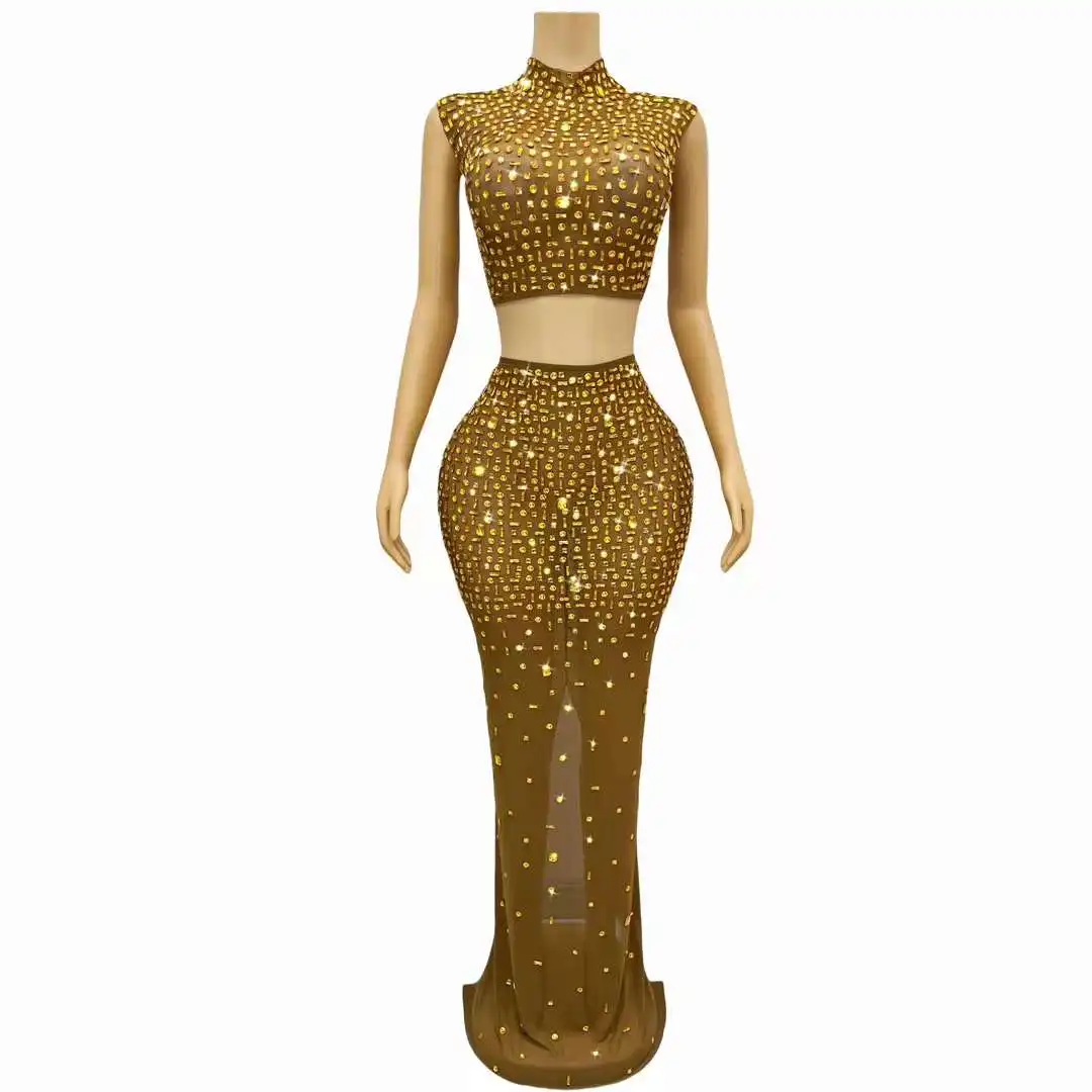 Sparkly Gold Rhinestones Sleeveless Top Long Skirt Two Pieces Set Women Sexy Transparent Celebrate Evening Prom Birthday Dress