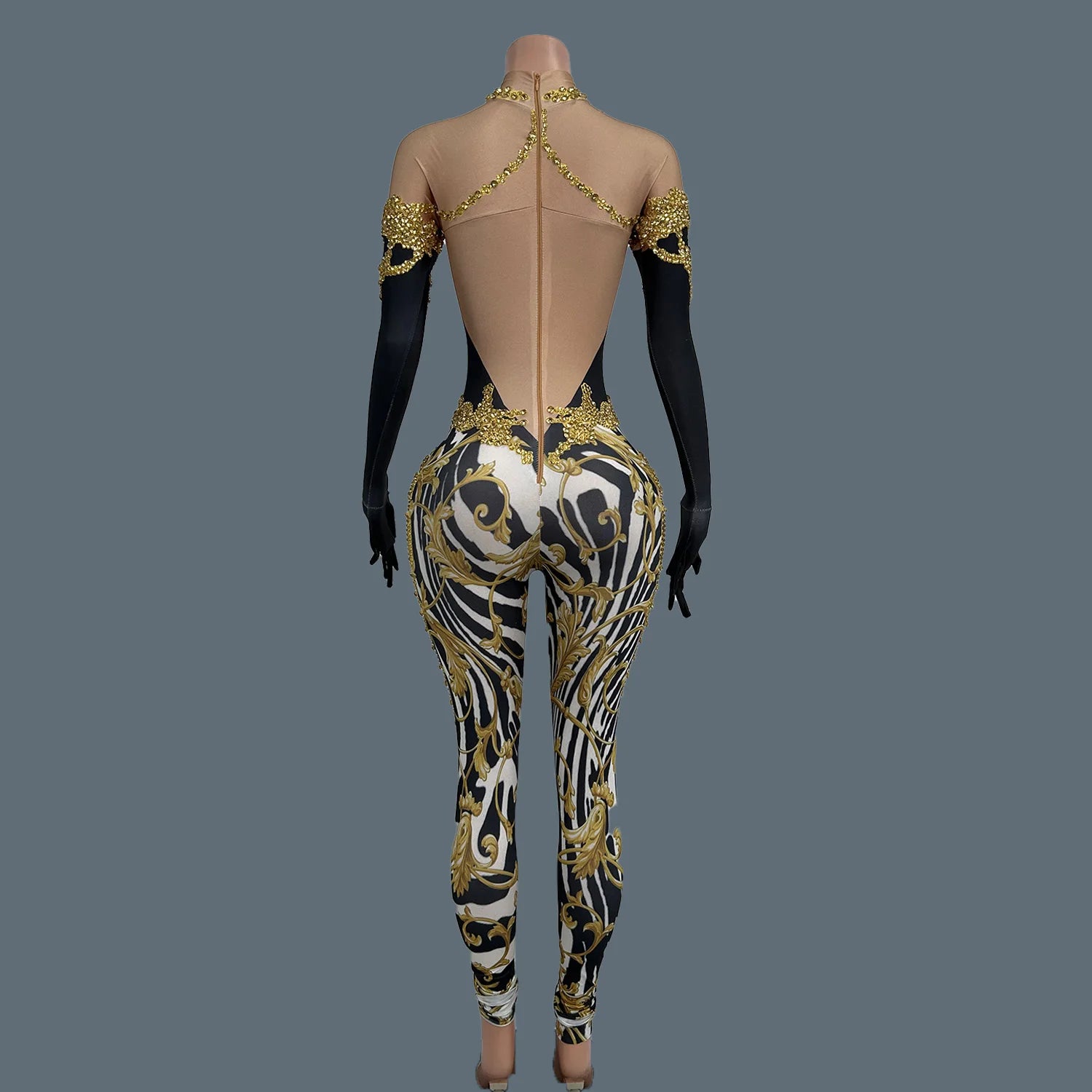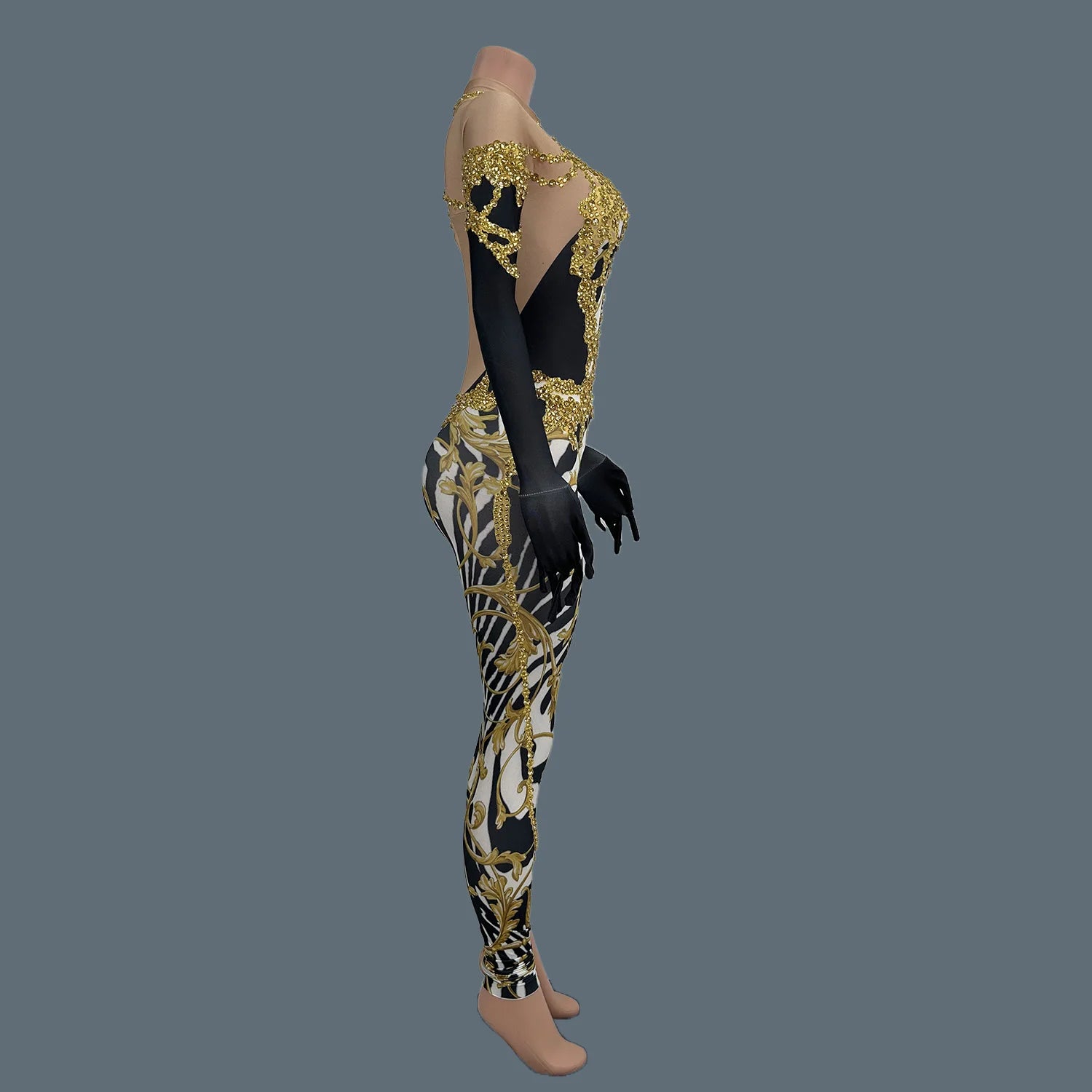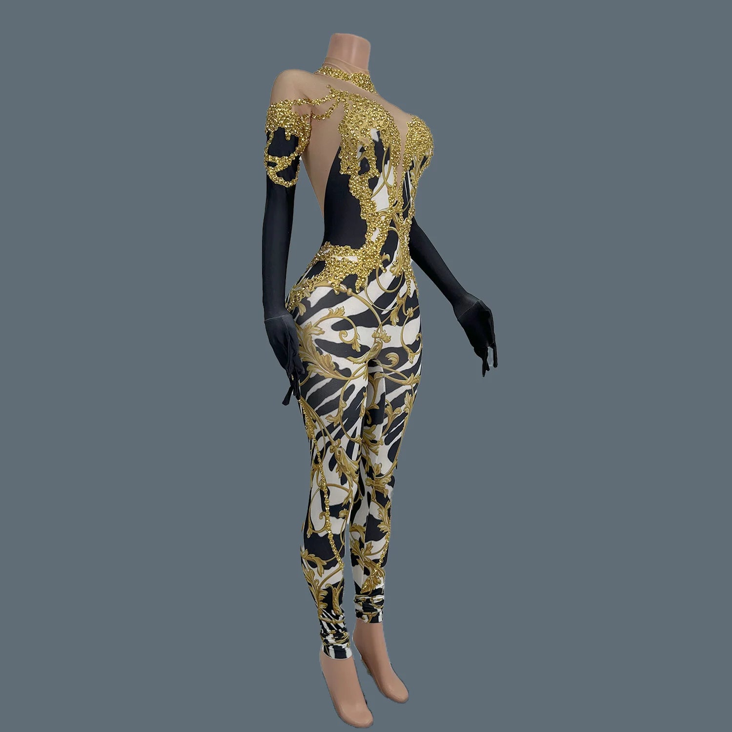 Command attention in this Sparkly Gold Rhinestones Tight Jumpsuit, designed for women who are ready to shine on stage. This sexy printed performance costume is adorned with dazzling rhinestones that reflect the light, making it perfect for nightclubs, bars, and dance activities. The form-fitting design highlights your curves while allowing for freedom of movement, ensuring you can dance the night away. Stand out and make a statement in this stunning jumpsuit that effortlessly combines style, glamour, and confidence!
