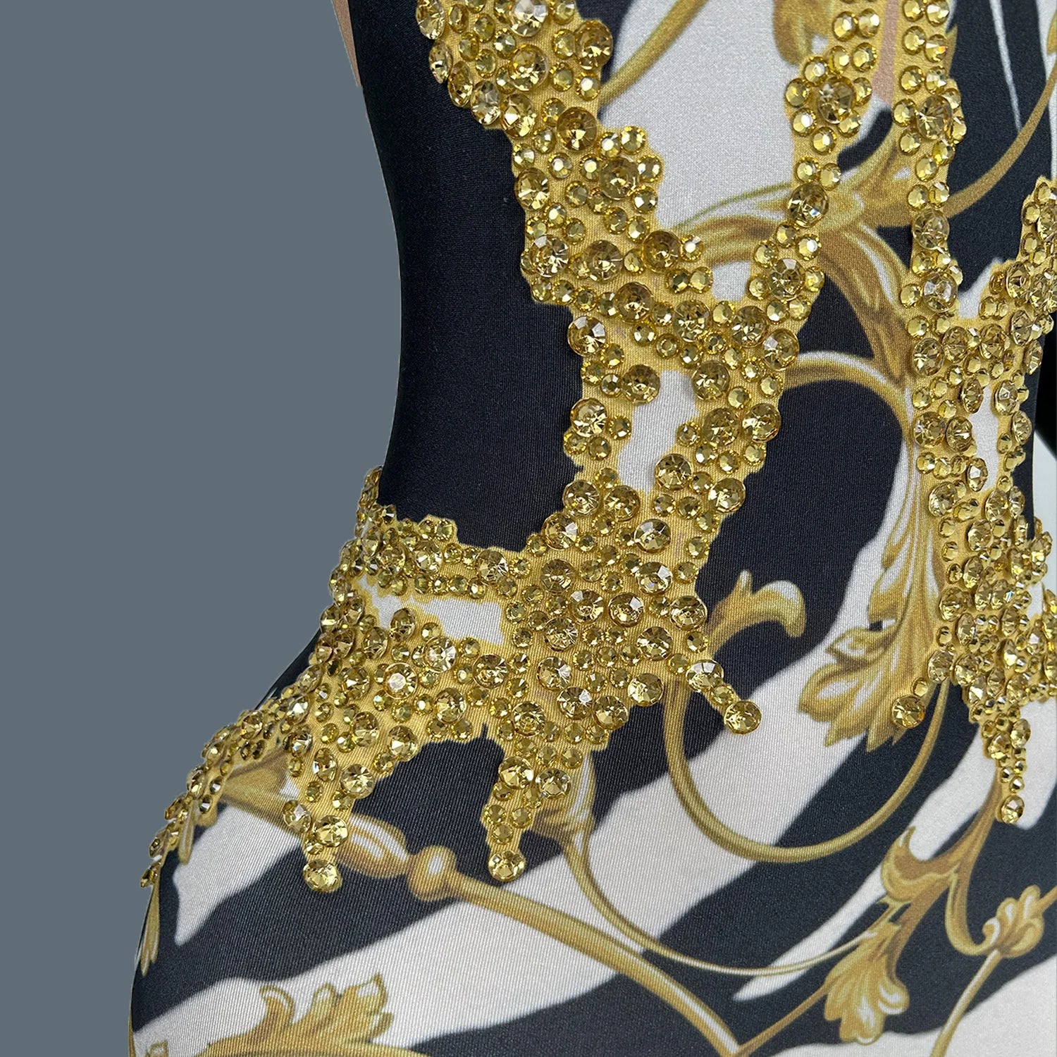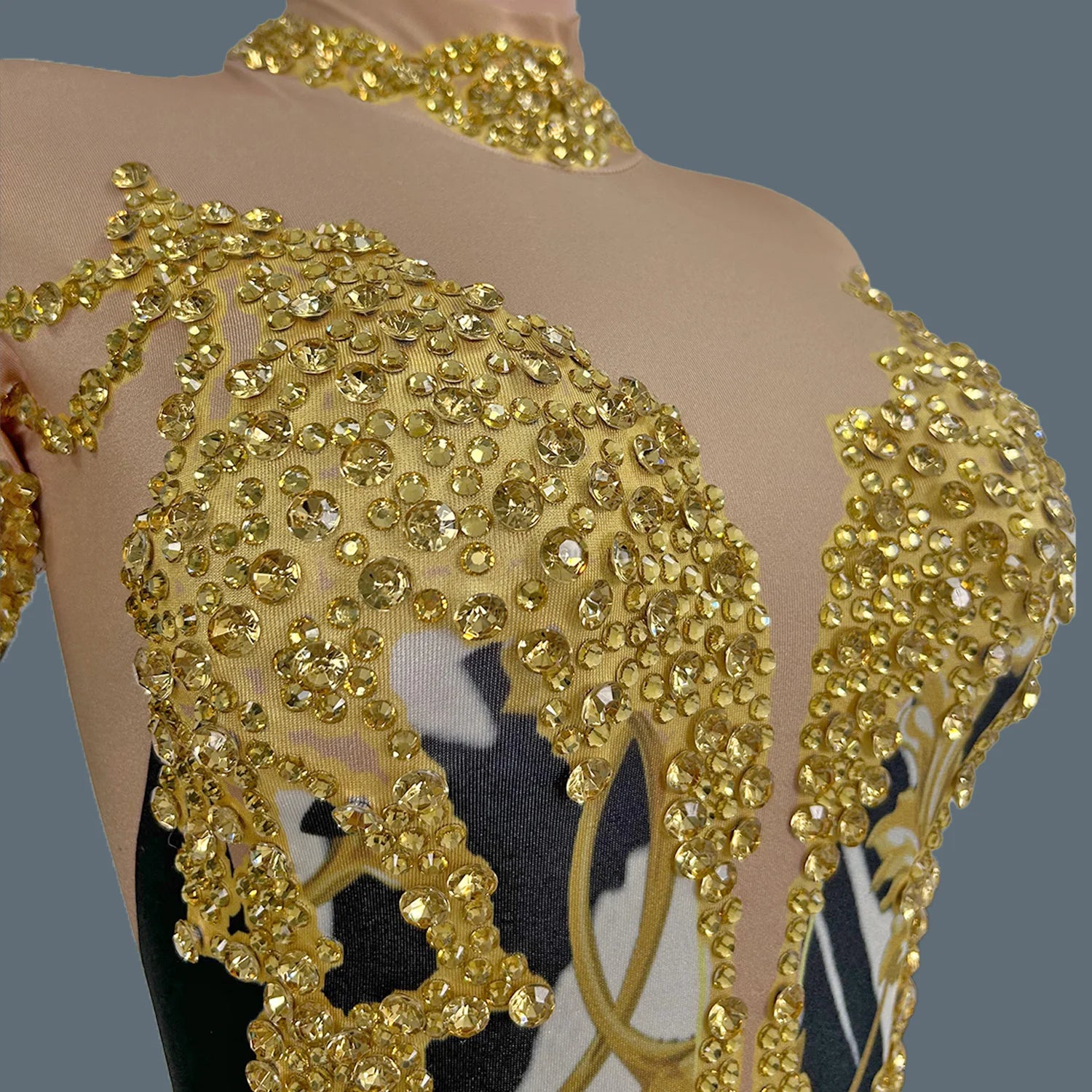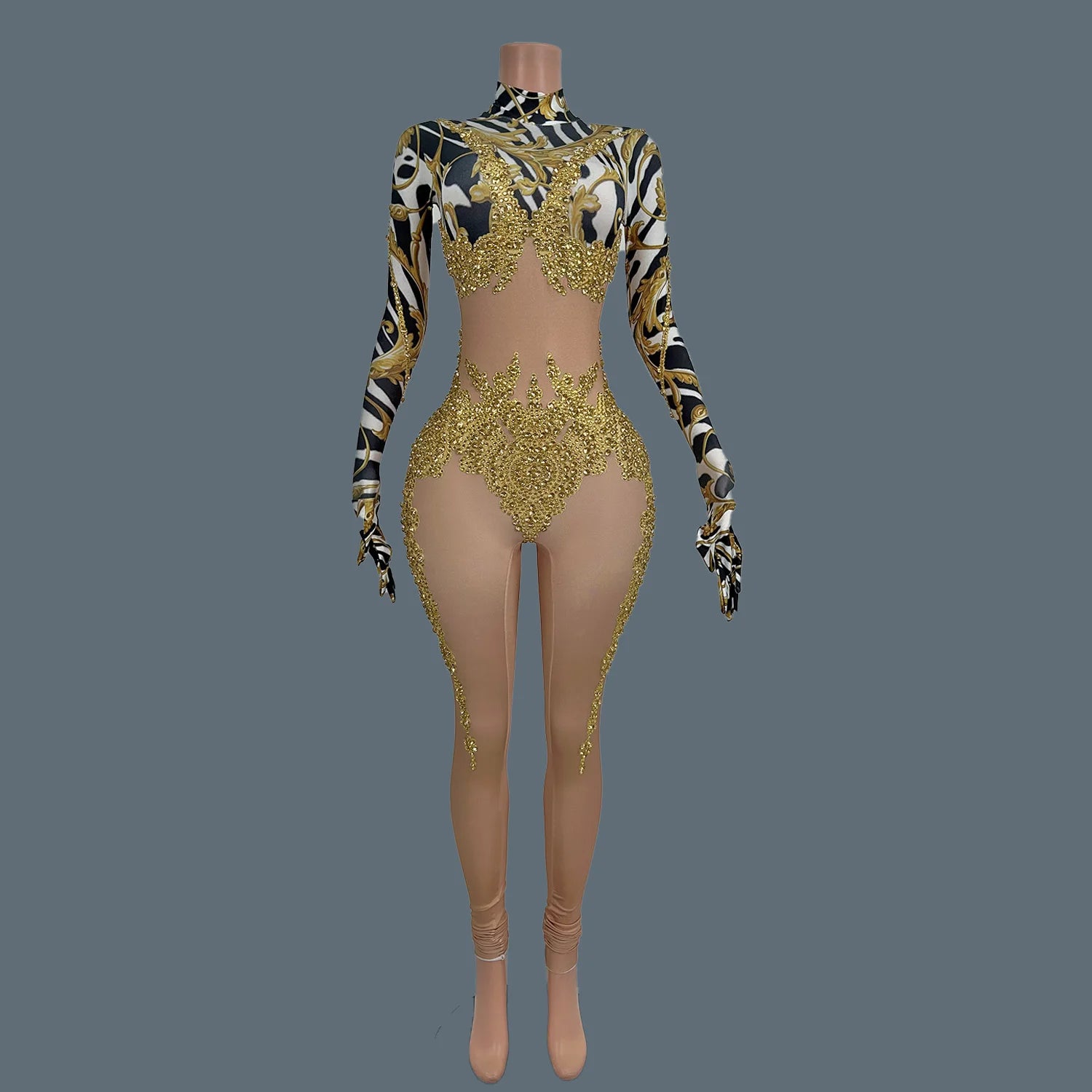 Command attention in this Sparkly Gold Rhinestones Tight Jumpsuit, designed for women who are ready to shine on stage. This sexy printed performance costume is adorned with dazzling rhinestones that reflect the light, making it perfect for nightclubs, bars, and dance activities. The form-fitting design highlights your curves while allowing for freedom of movement, ensuring you can dance the night away. Stand out and make a statement in this stunning jumpsuit that effortlessly combines style, glamour, and confidence!