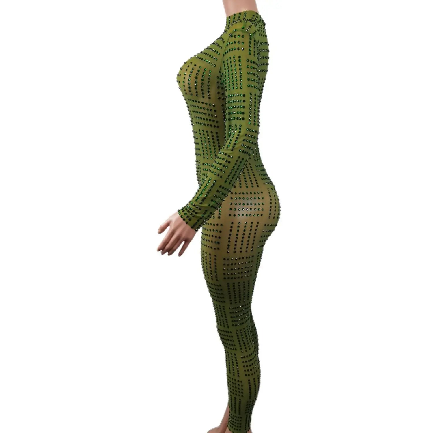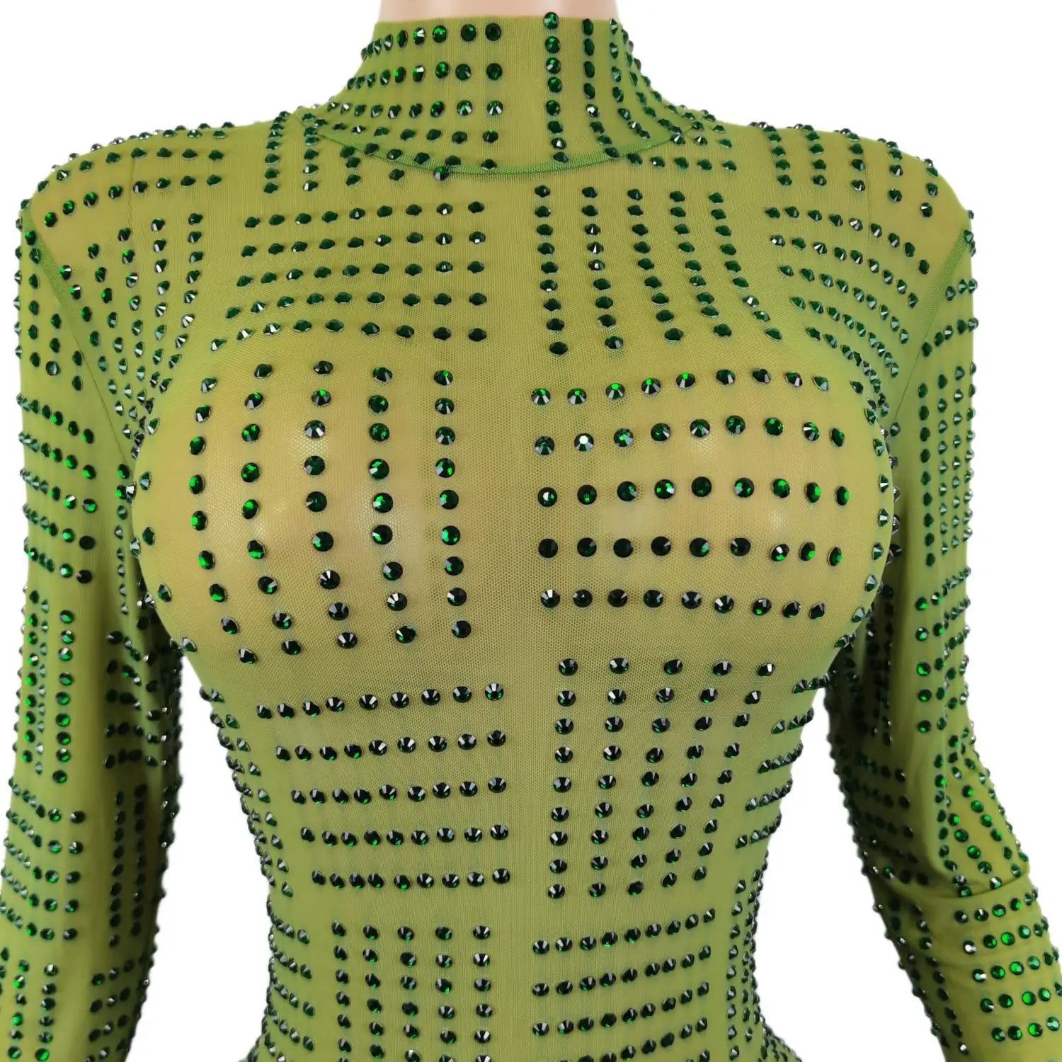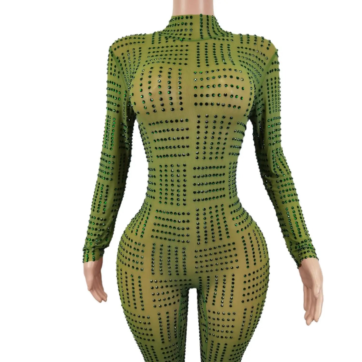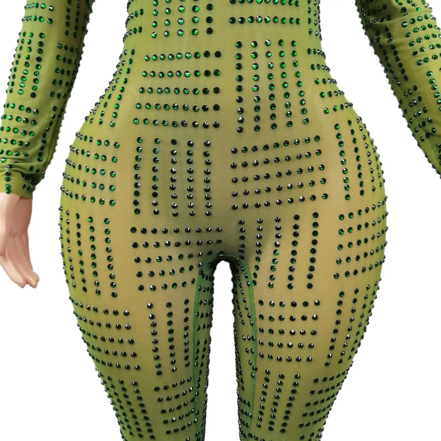 Sparkly Green Rhinestone Jumpsuit Women Fashion Sexy Big Stretch Dance Costume Bodysuit Birthday Outfit Party Legging Lvchangku