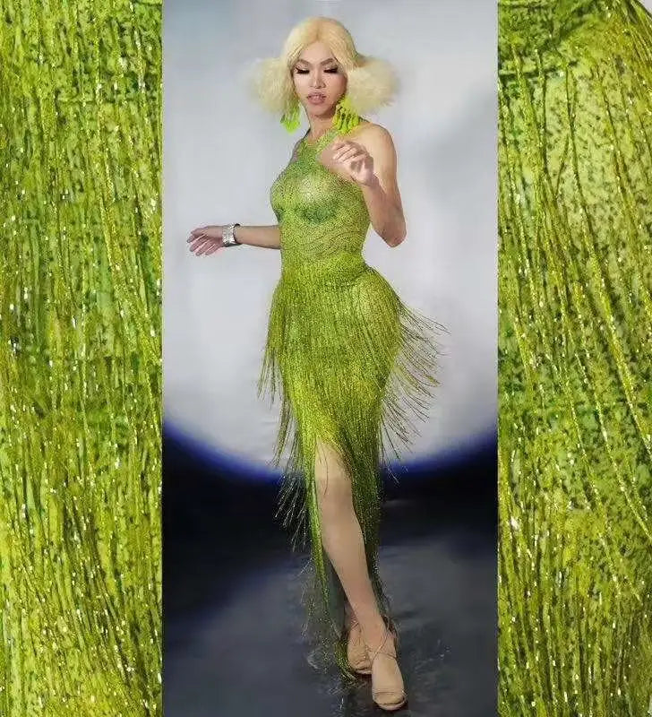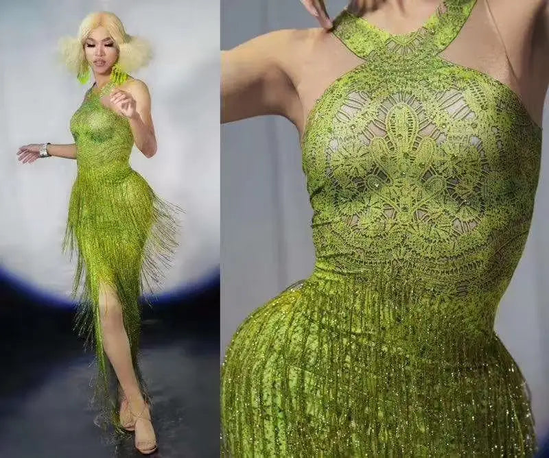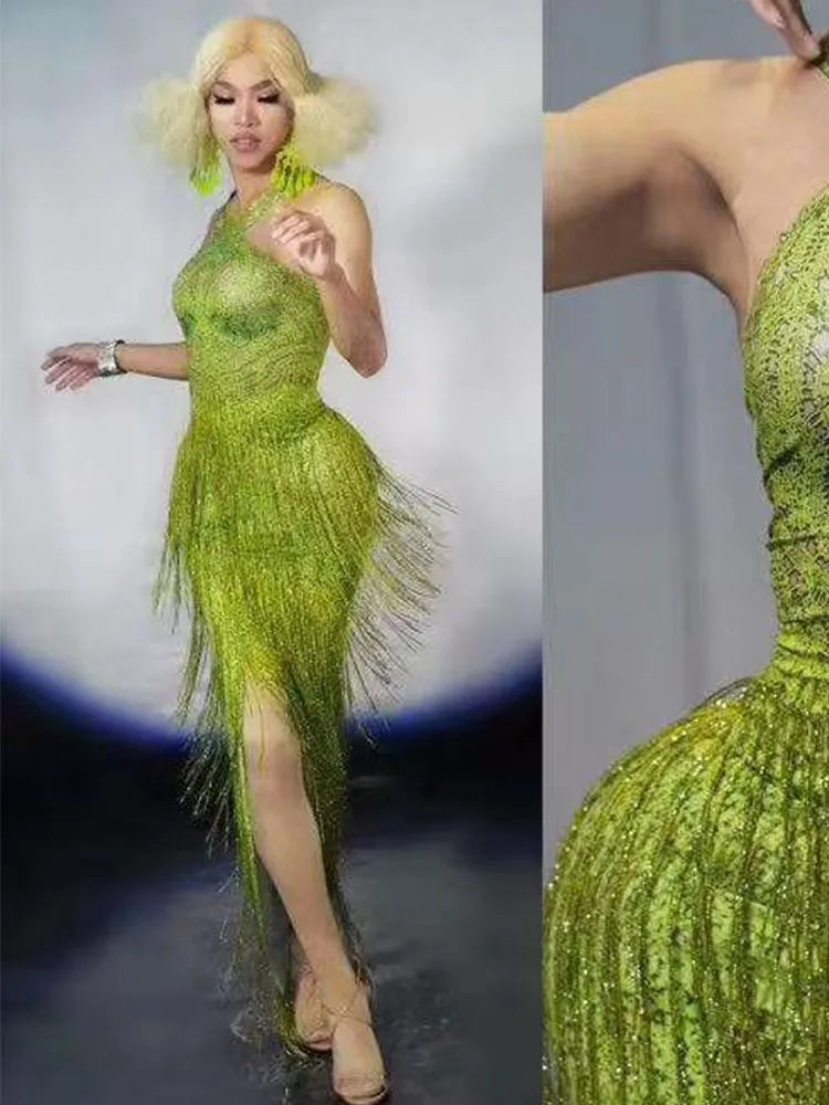 Sparkly Green Rhinestones Sexy Birthday Party Tassel Dress Performance Dance Costume Stage Photoshoot Wear