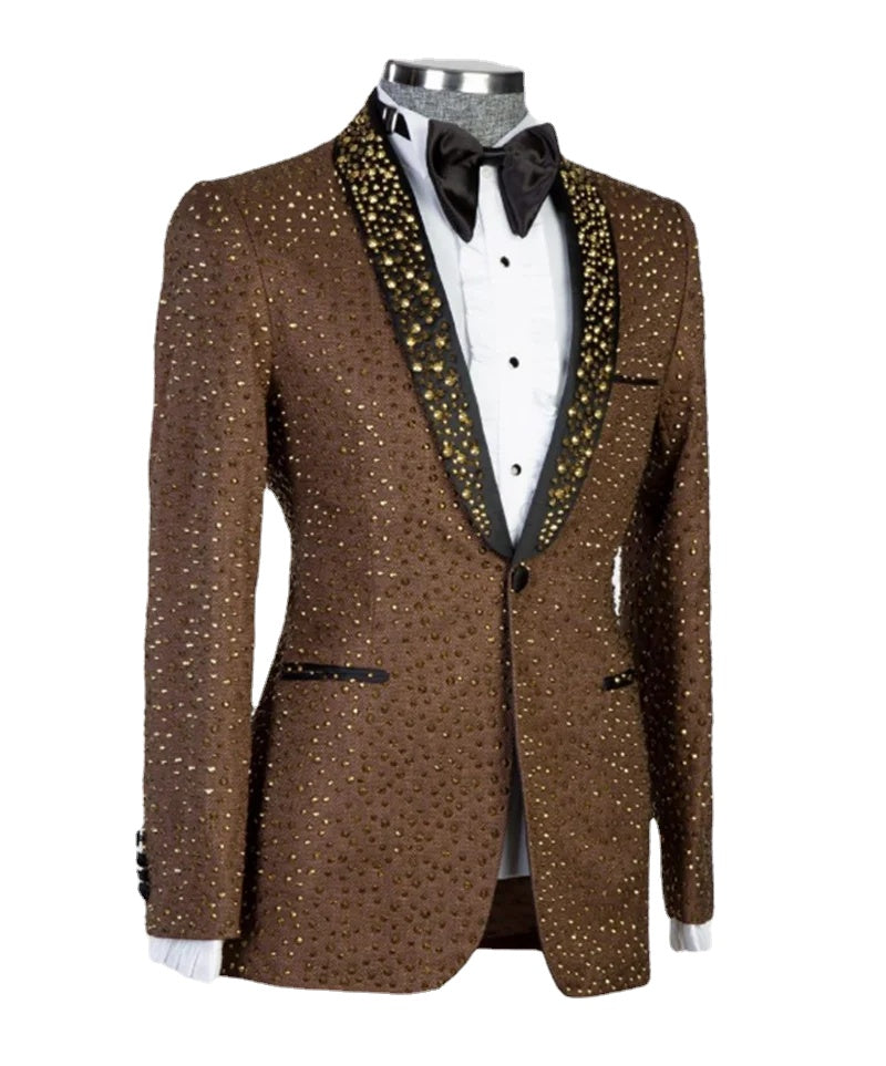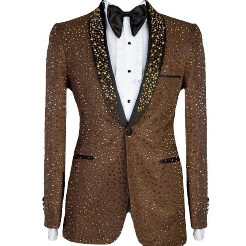 This luxury men's suit features a sparkly one-piece blazer with a single button closure, adorned with beads, diamonds, and a sheer lapel. Perfect for formal occasions, weddings, and as a slim-fit groom outfit. Available in plus sizes and tailored for a perfect fit.