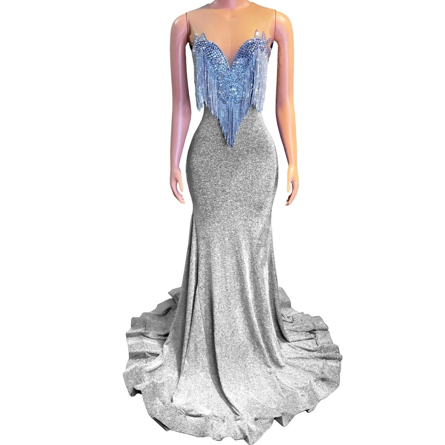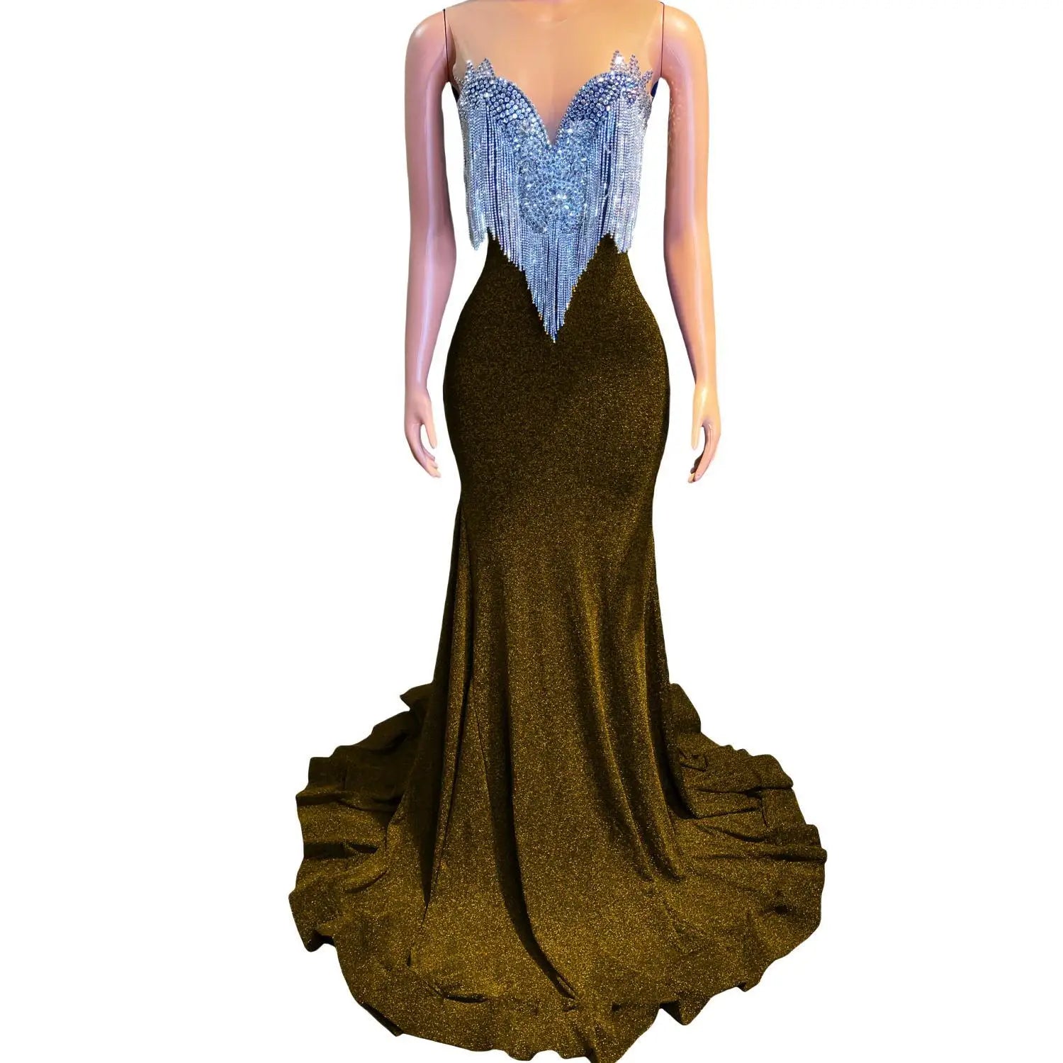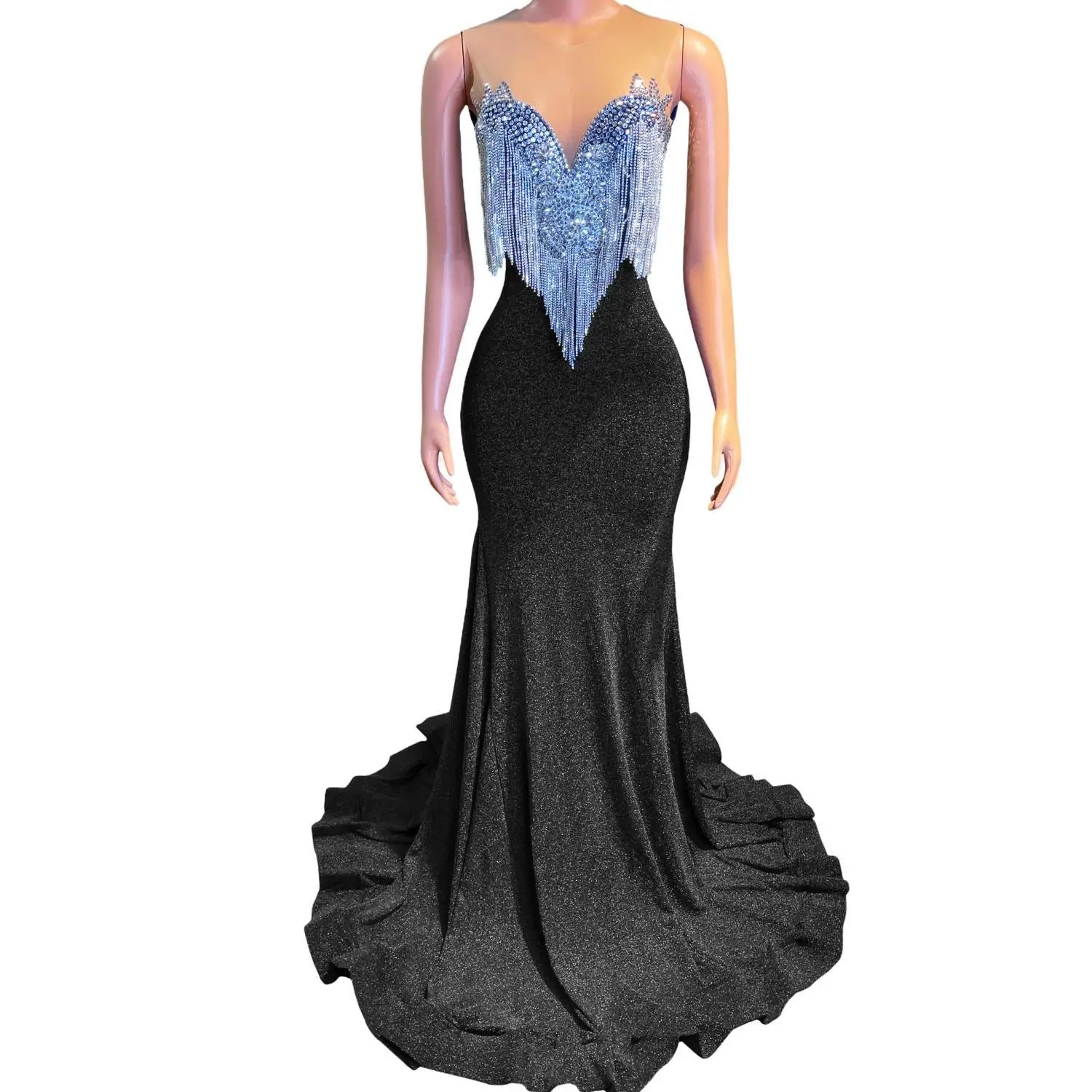 This Sparkly Mermaid Style Fitted Dress is a glamorous and eye-catching choice for prom, formal events, and special occasions. The dress features a fitted silhouette with crystal tassel sequins that add a touch of sparkle and elegance. Designed with an African girl in mind, this backless long prom dress exudes sophistication and style. Stand out in this sexy and sophisticated gown that is sure to make a statement at any event.