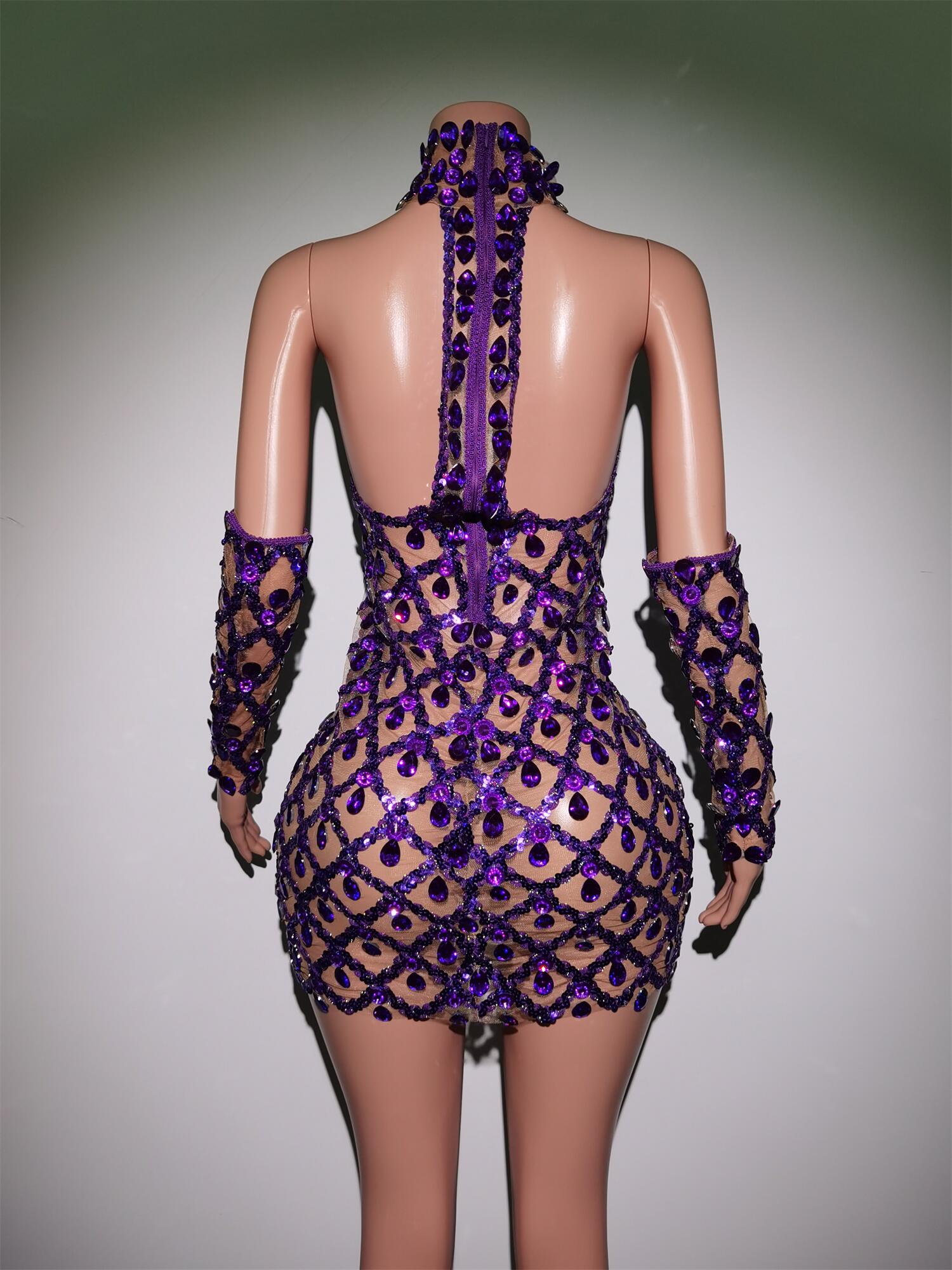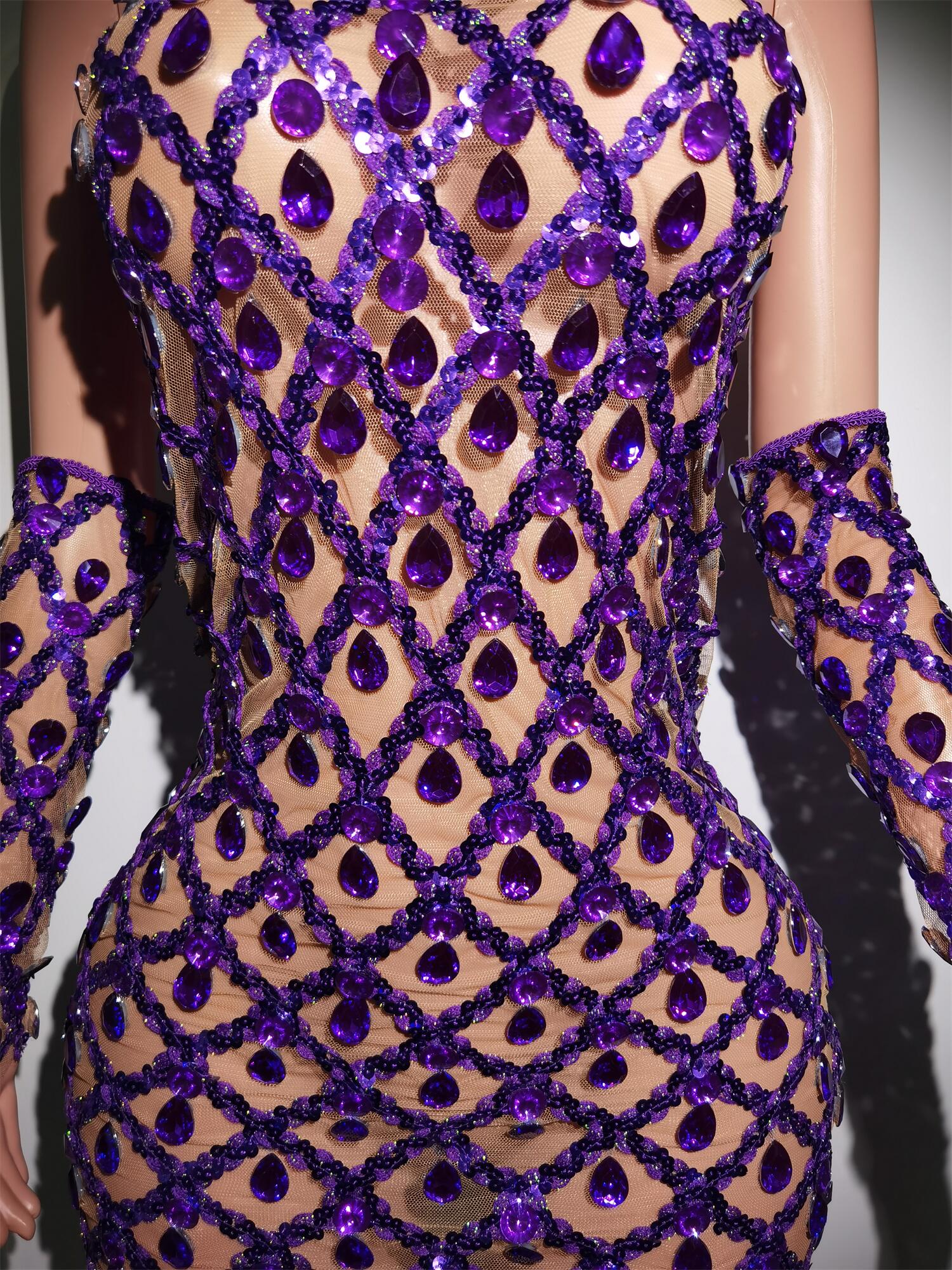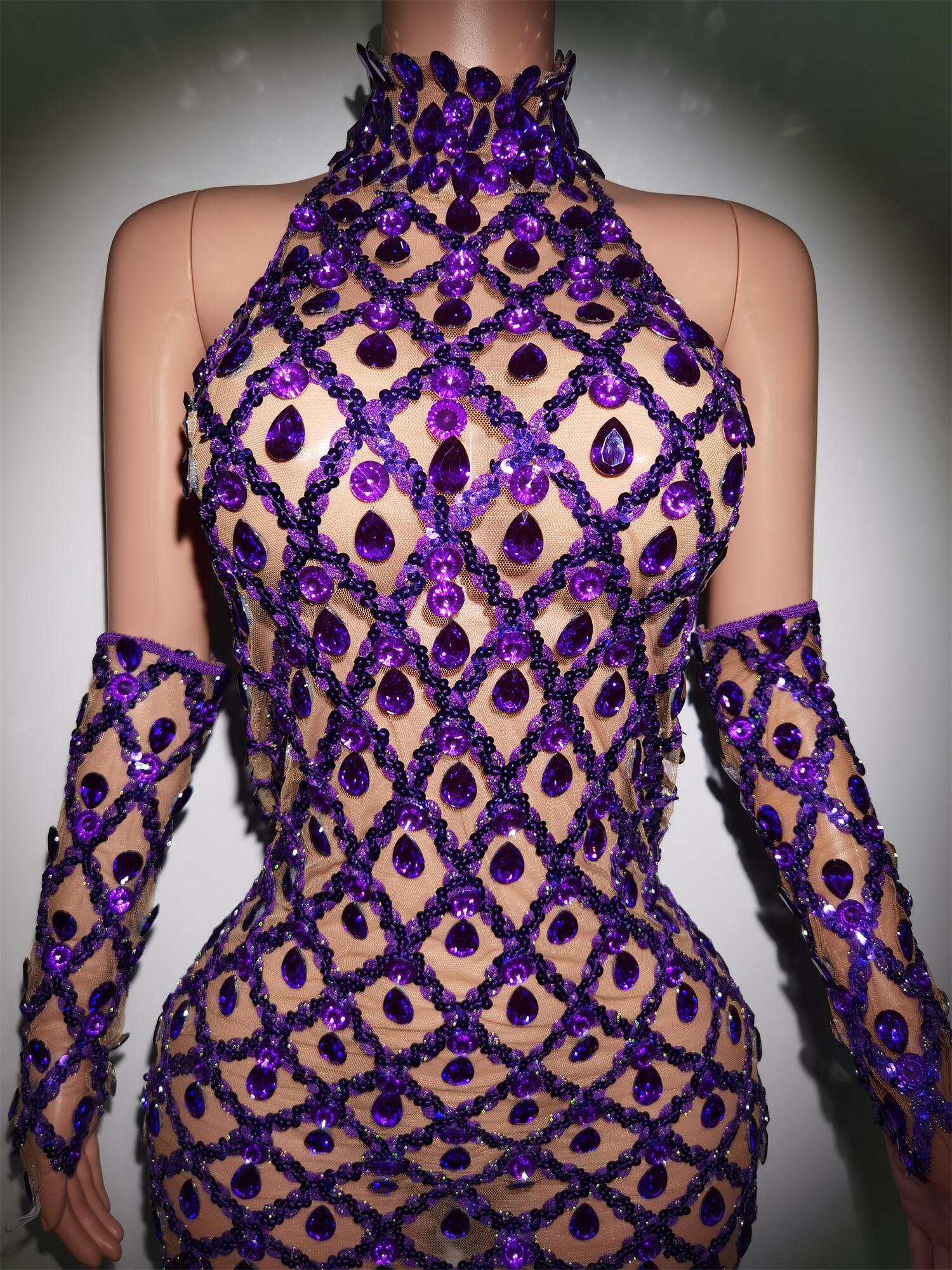 Sparkly Purple Crystals Dress Golves Female Singer Evening Birthday Party Dresses Sexy Transparent Stage Outfit Set Shaokaojia