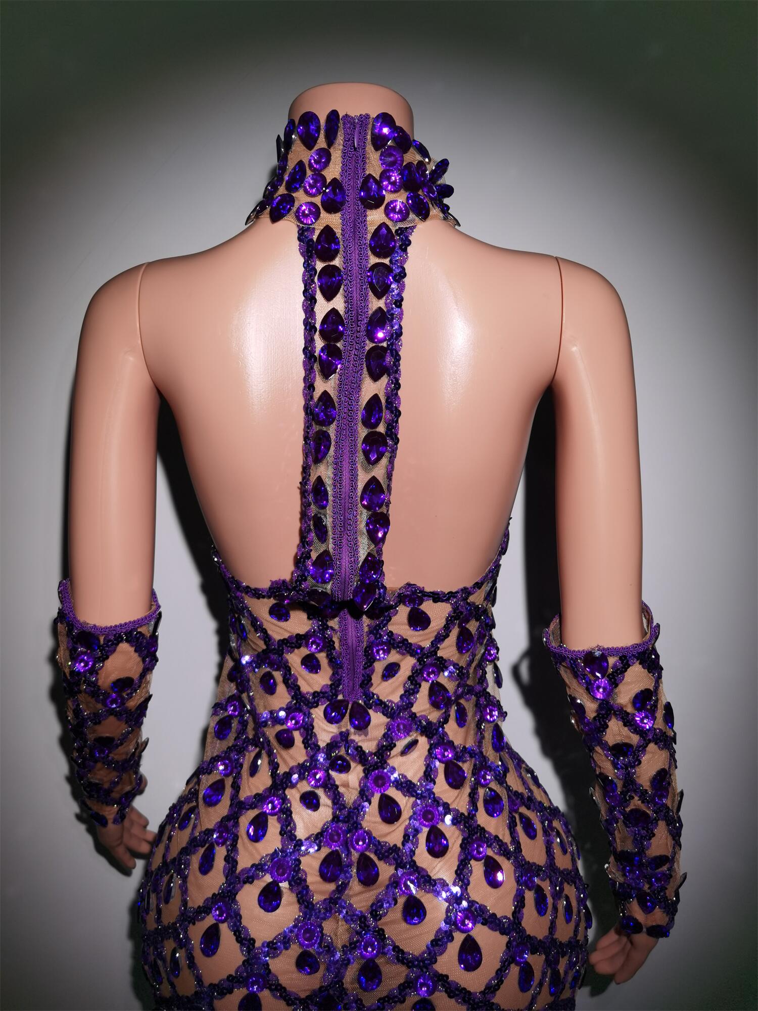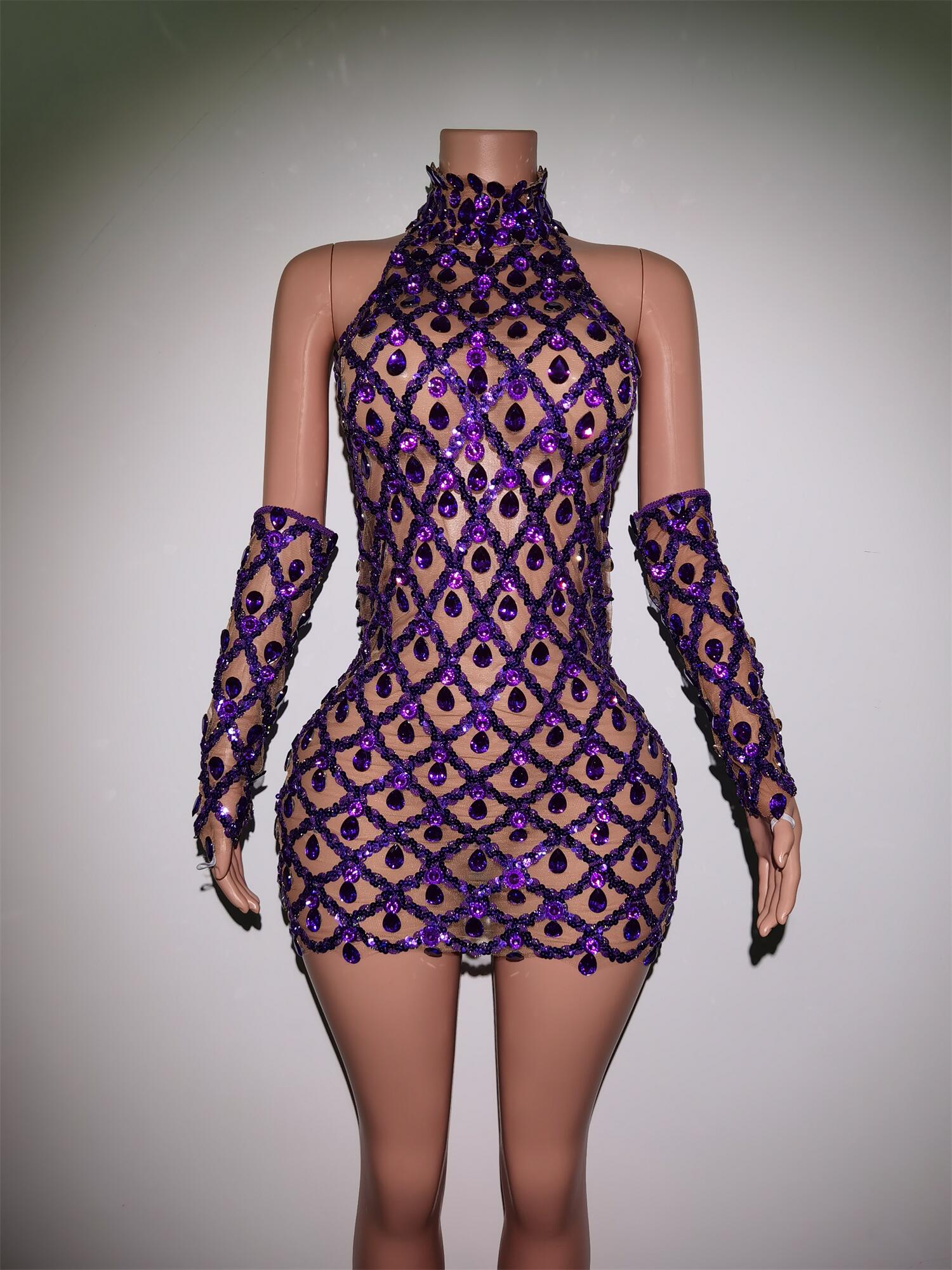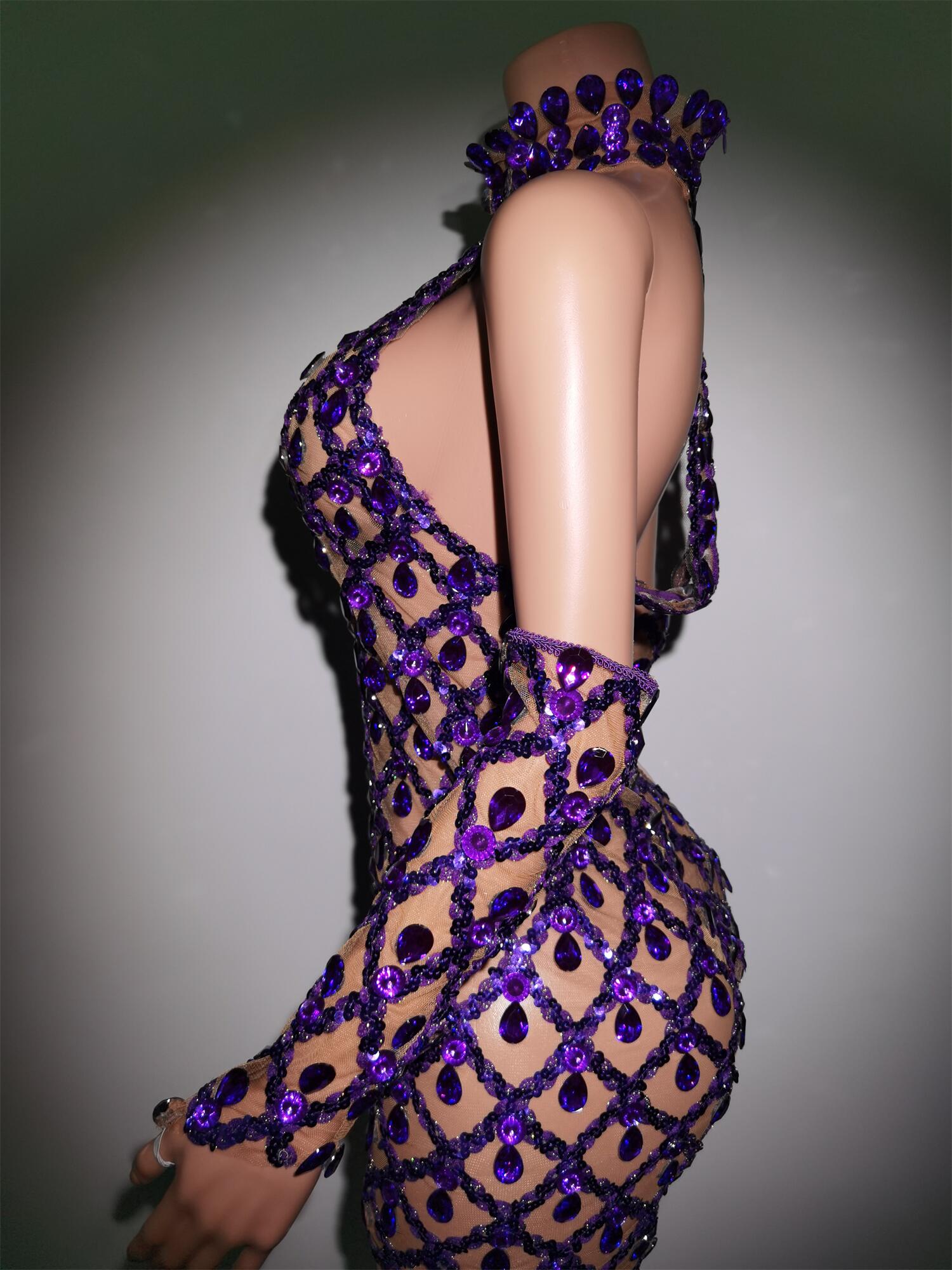 Sparkly Purple Crystals Dress Golves Female Singer Evening Birthday Party Dresses Sexy Transparent Stage Outfit Set Shaokaojia