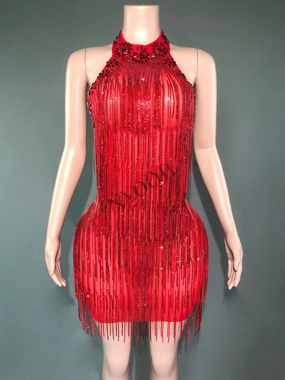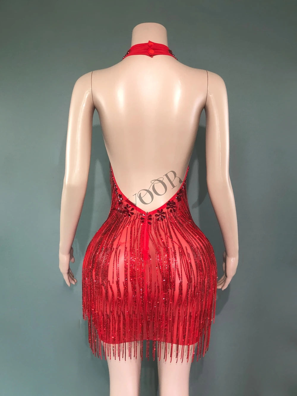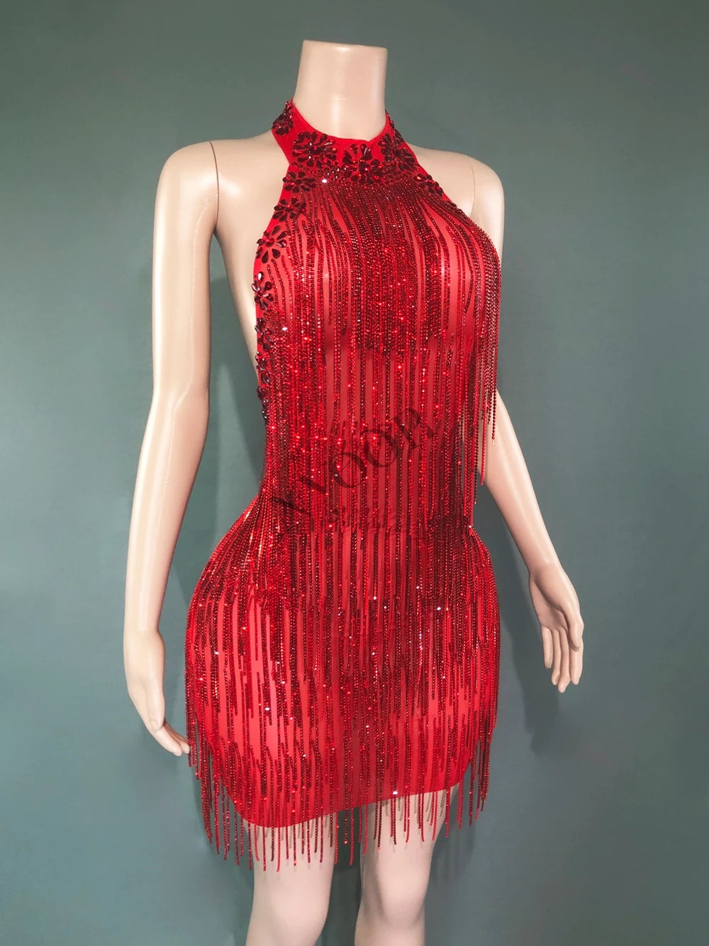 Sparkly Red Rhinestones Chains Backless Short Dress Women Sexy Birthday Evening Prom Celebrate Dress Photo Shoot Stage Wear