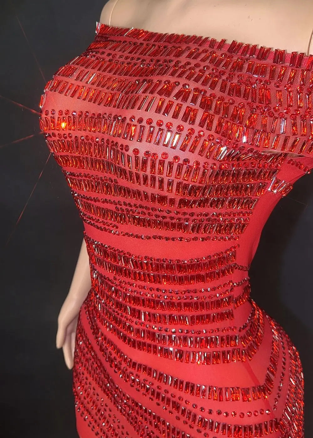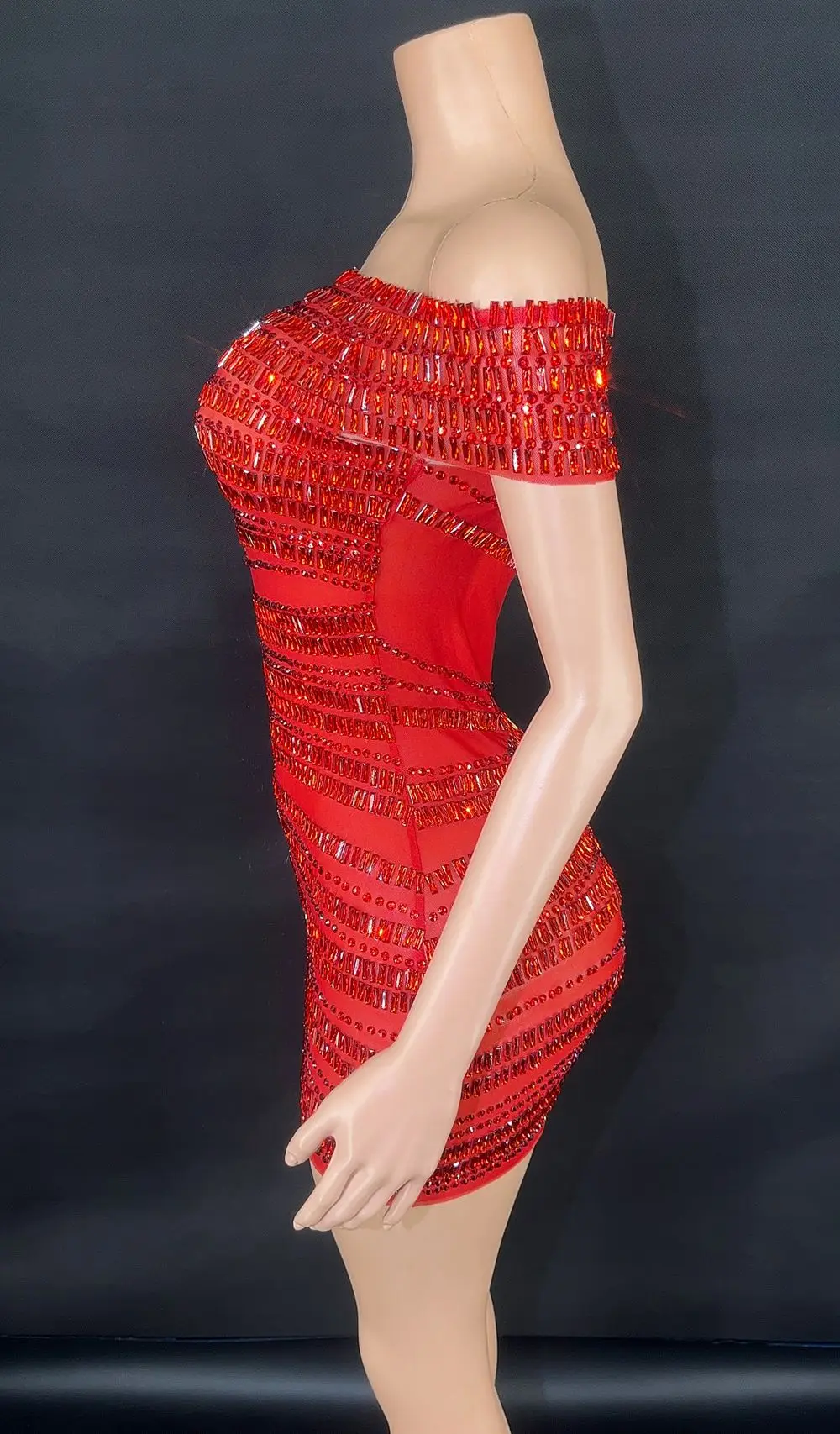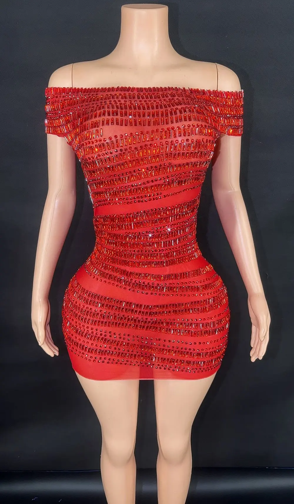 Sparkly Red Rhinestones Short Dress for Women Sexy Off-shoulder Mesh See Through Evening Prom Celebrate Birthday Dress
