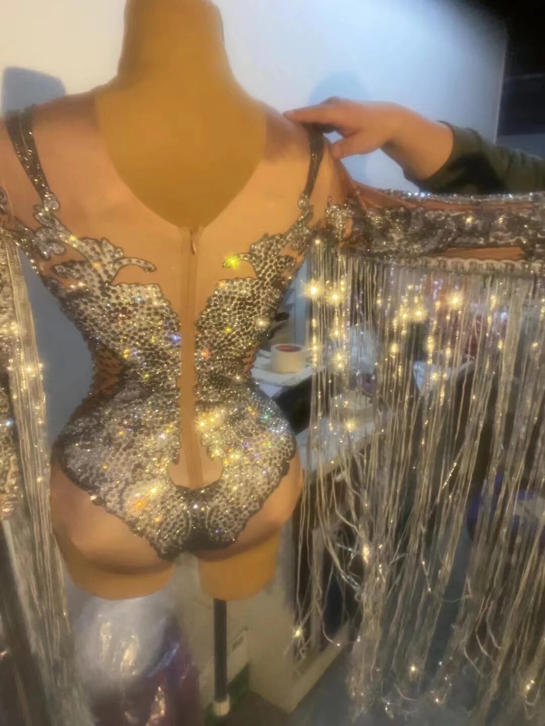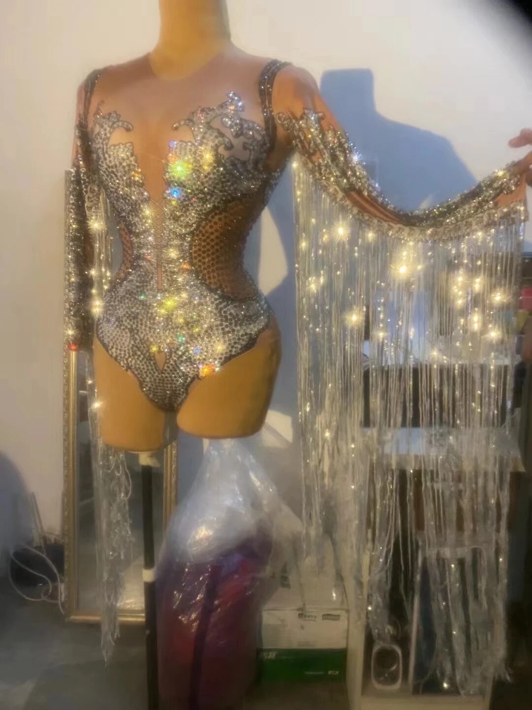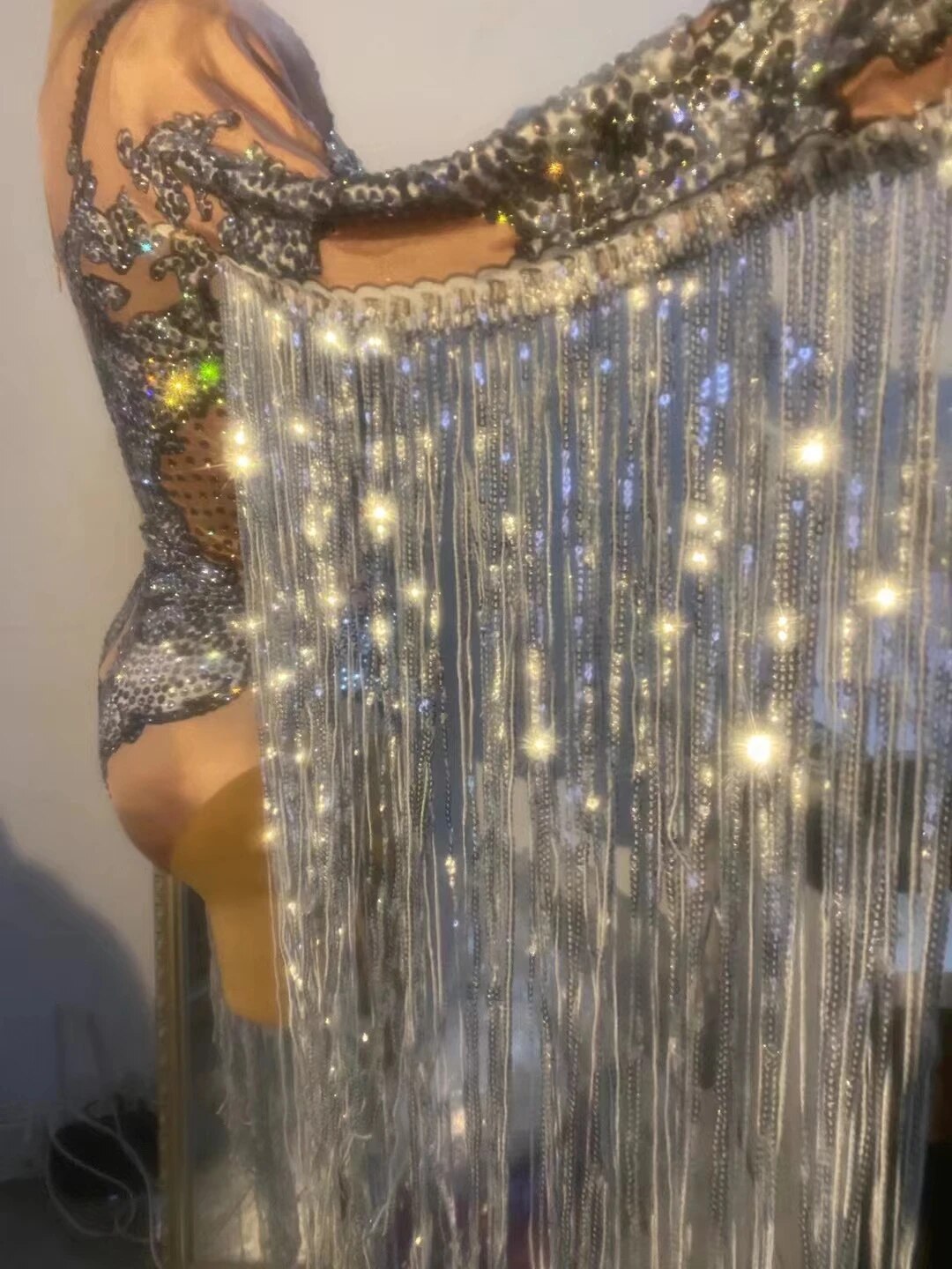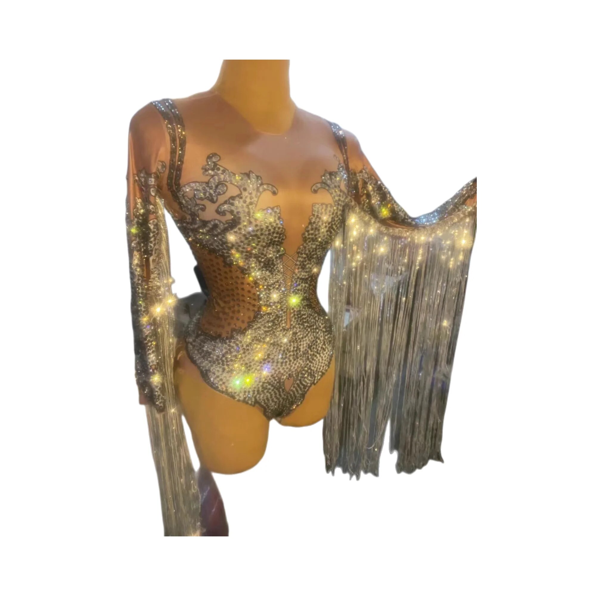 Sparkly Rhinestone Sequin Fringes BodvsuitWomen Bodycon Stage Wear Club Dancer TasselLeotard DS Party Show Dance Costume