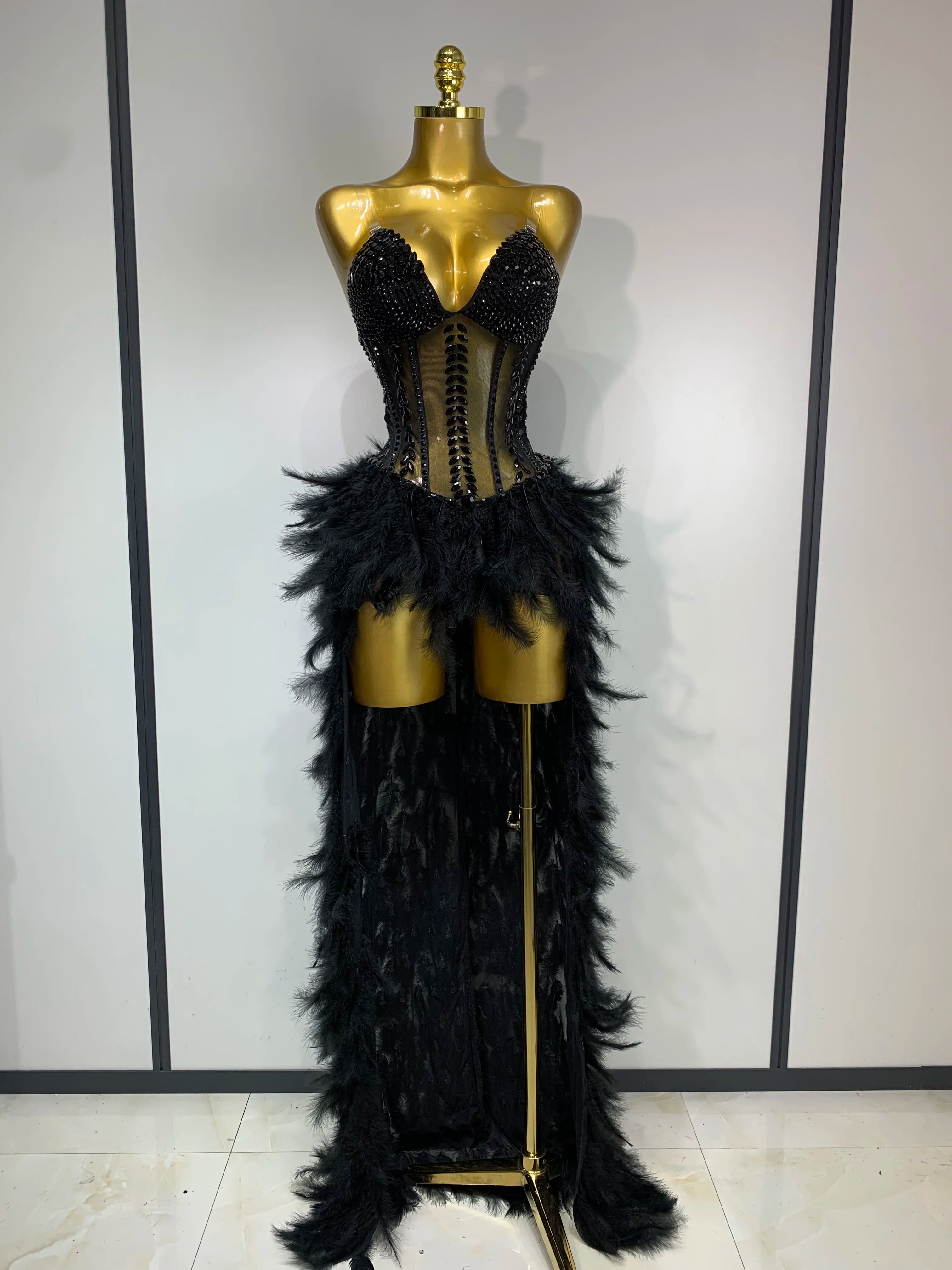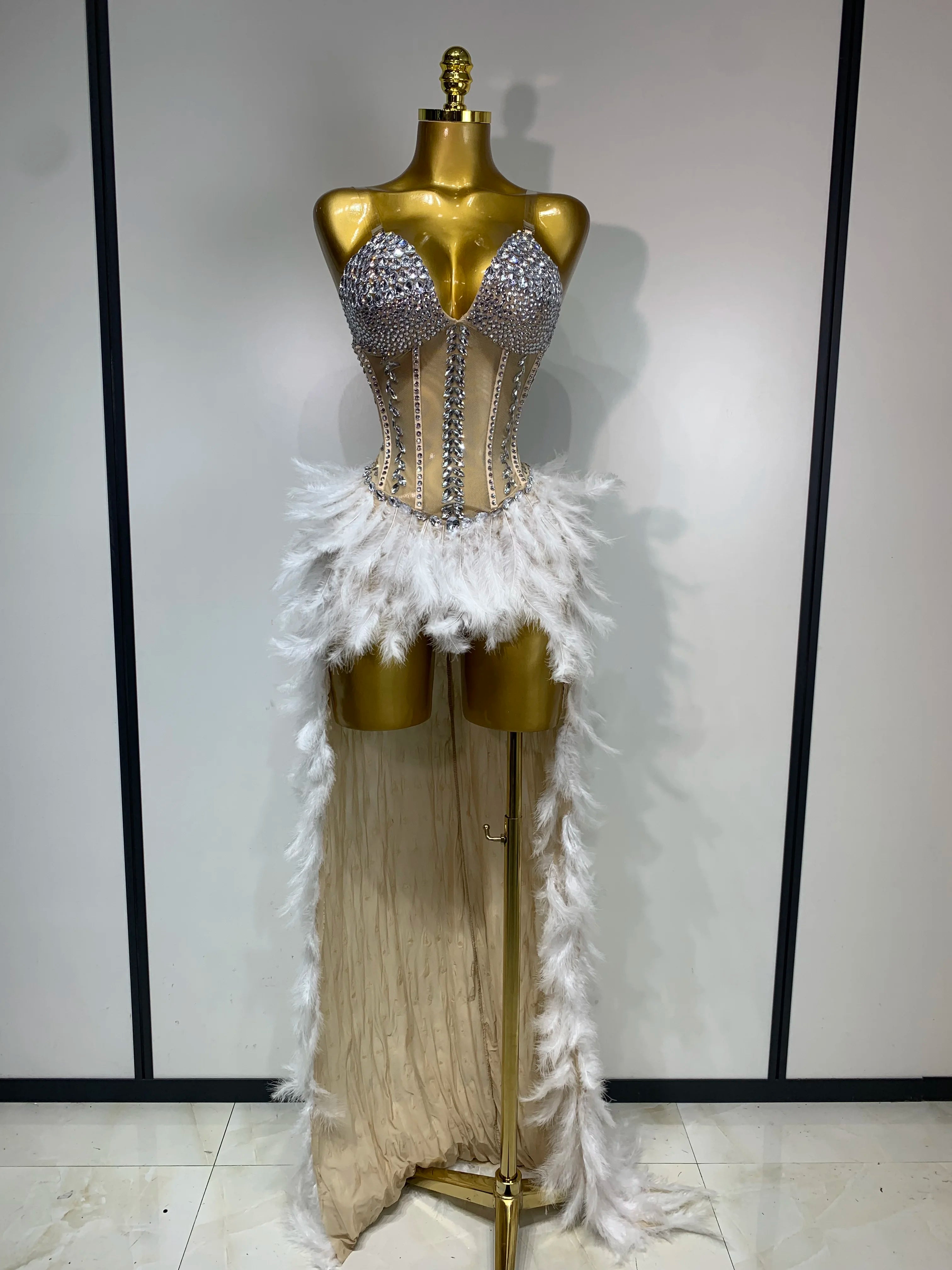 Sparkly Rhinestones Bodysuit Feathers Long Tail Dress Sexy Mesh Transparent Evening Party Celebrate Birthday Dress Stage Outfit