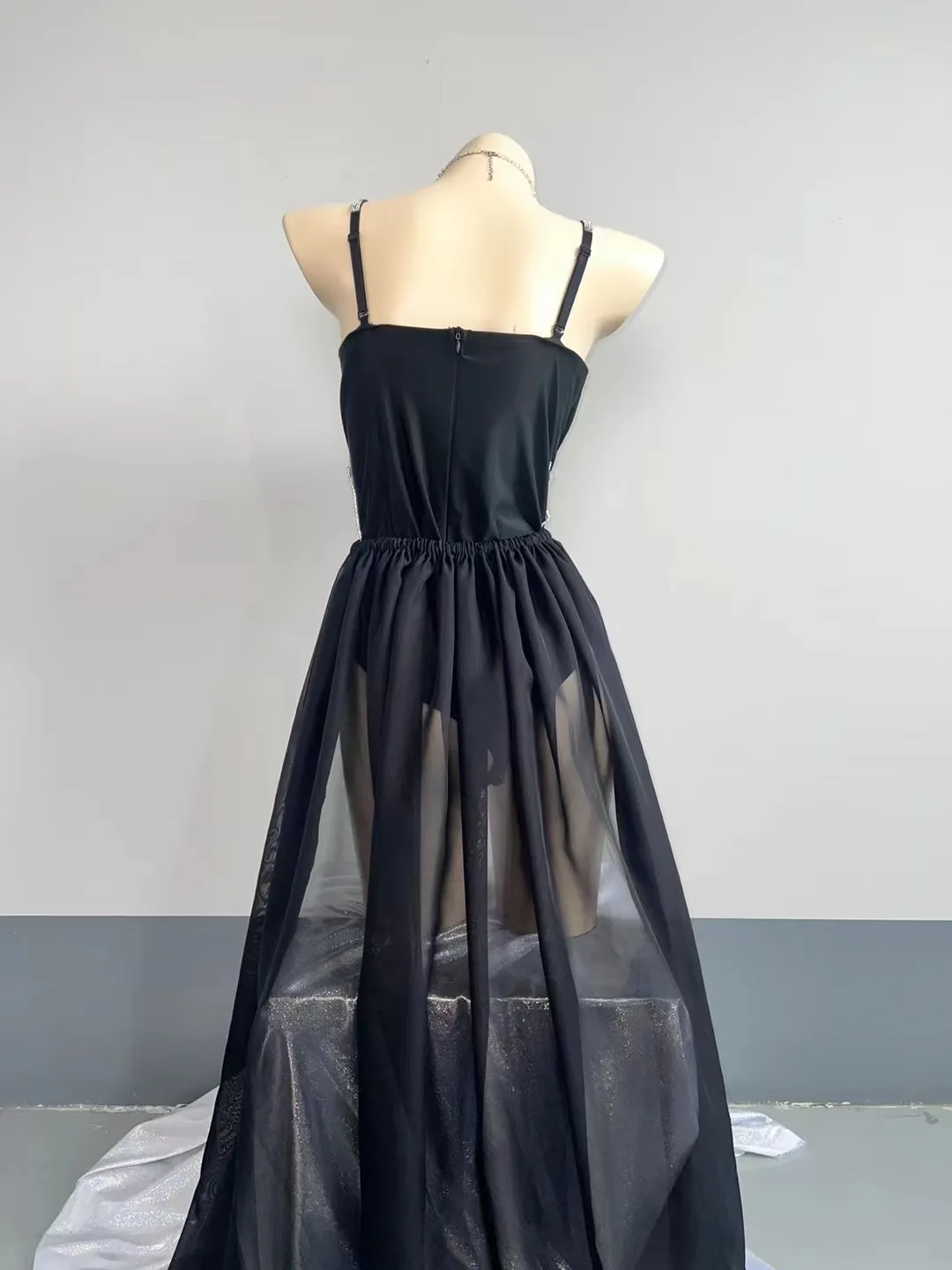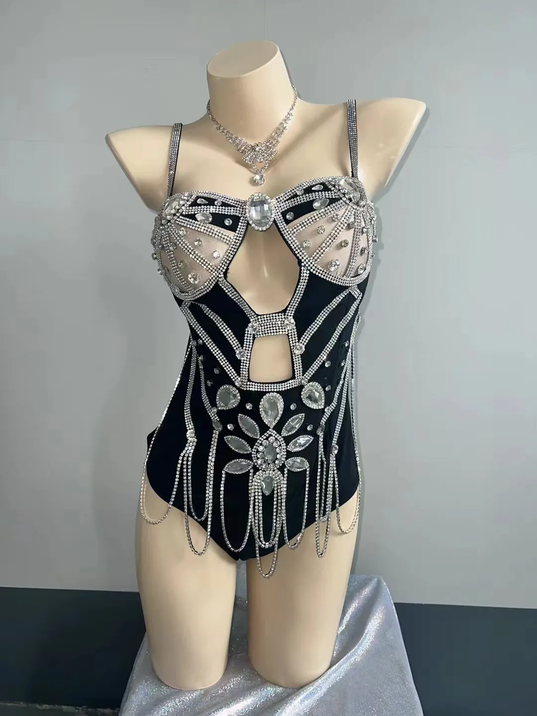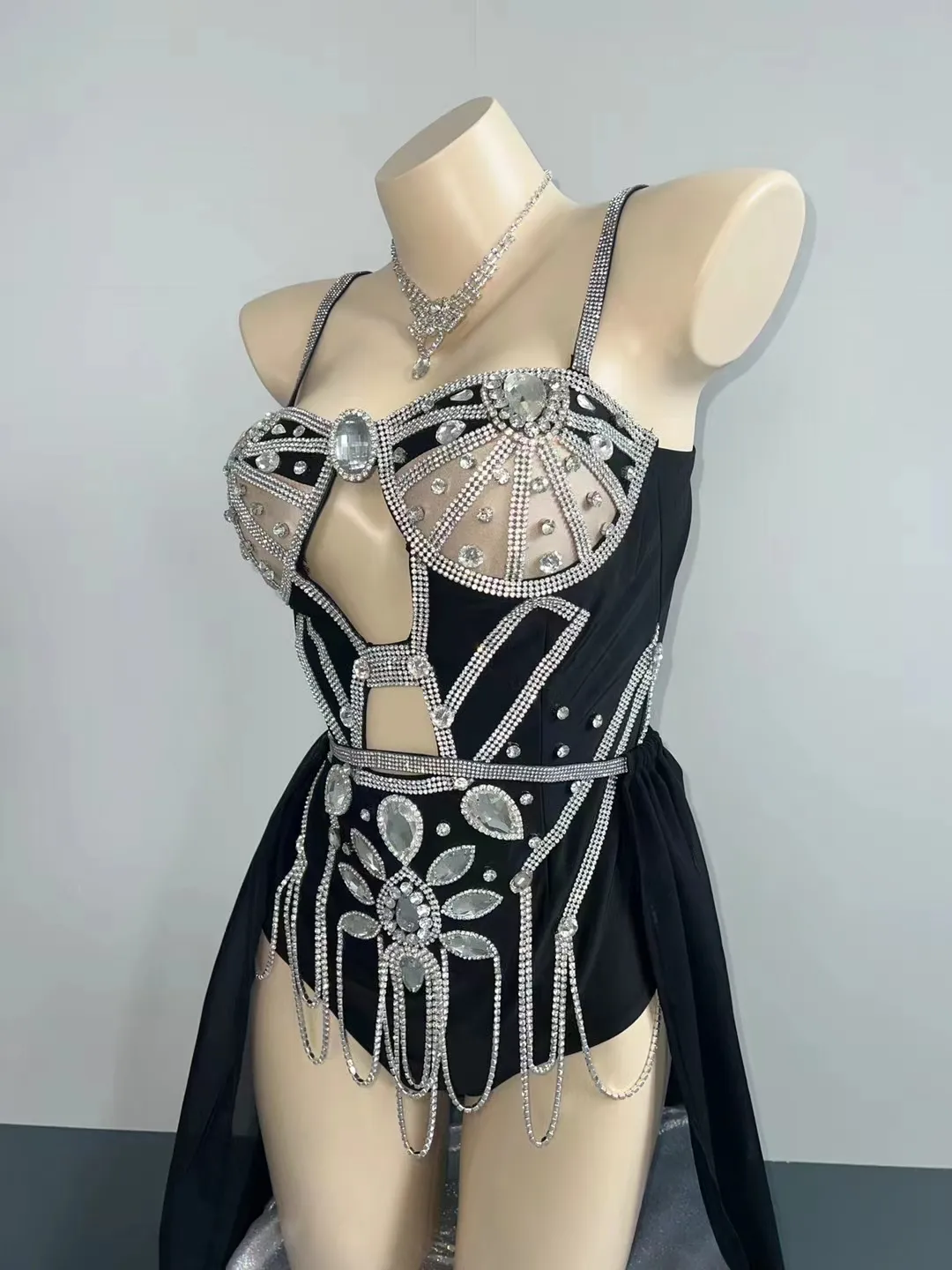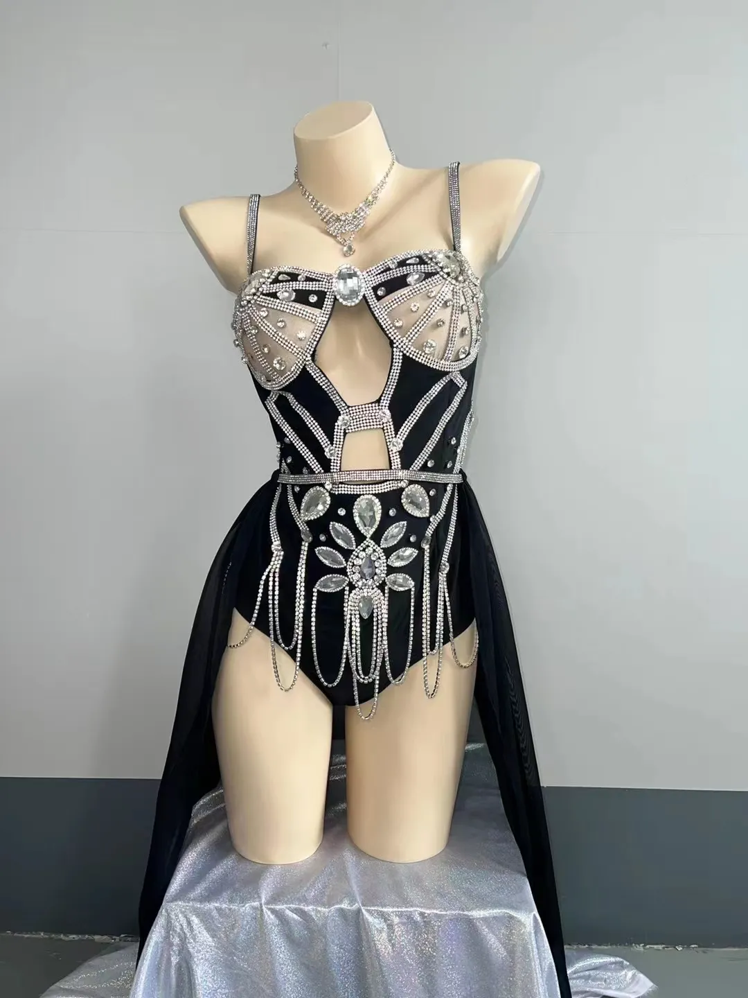 Sparkly Rhinestones Bodysuit Gauze Tailing Sexy Pole Dance Costume Club Party Stage Wear DJ Dancer Show Festival Rave Outfit