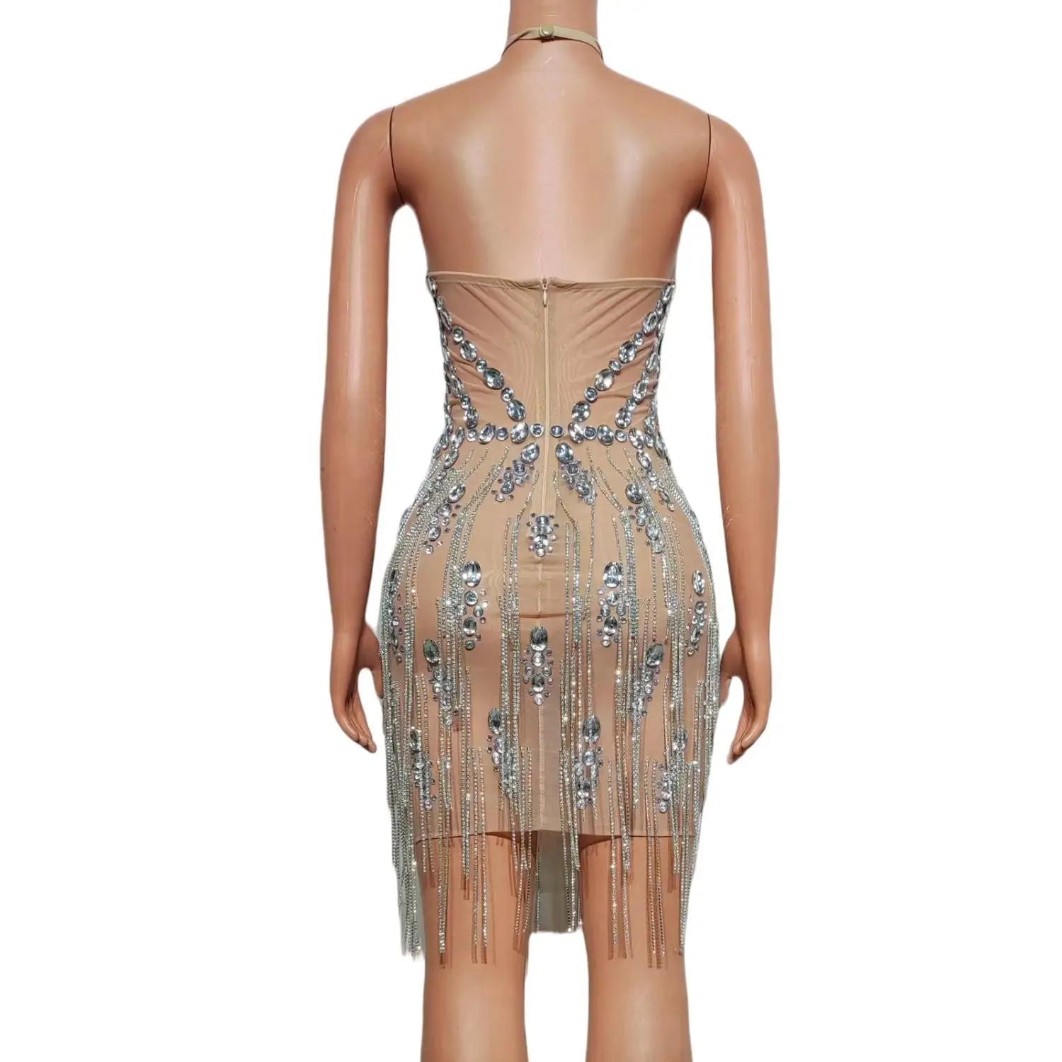 Sparkly Rhinestones Chain Bra Short Dress Women Sexy Mesh Birthday Party Dress Club Dance Dress Performance Costume Xiongqi