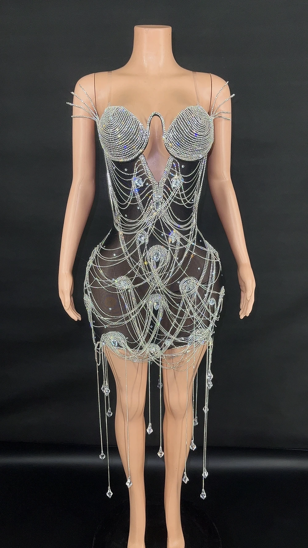 Sparkly Rhinestones Chains Crystals Tube Dress Women Sexy Mesh Evening Prom Celebrate Birthday Dress Photo Shoot Show Stage Wear