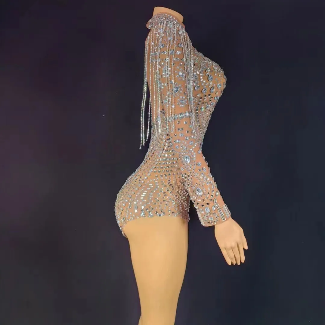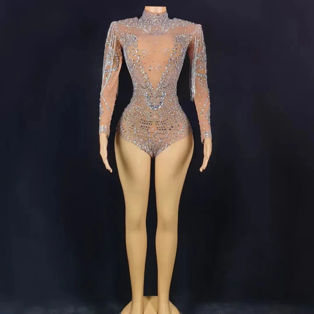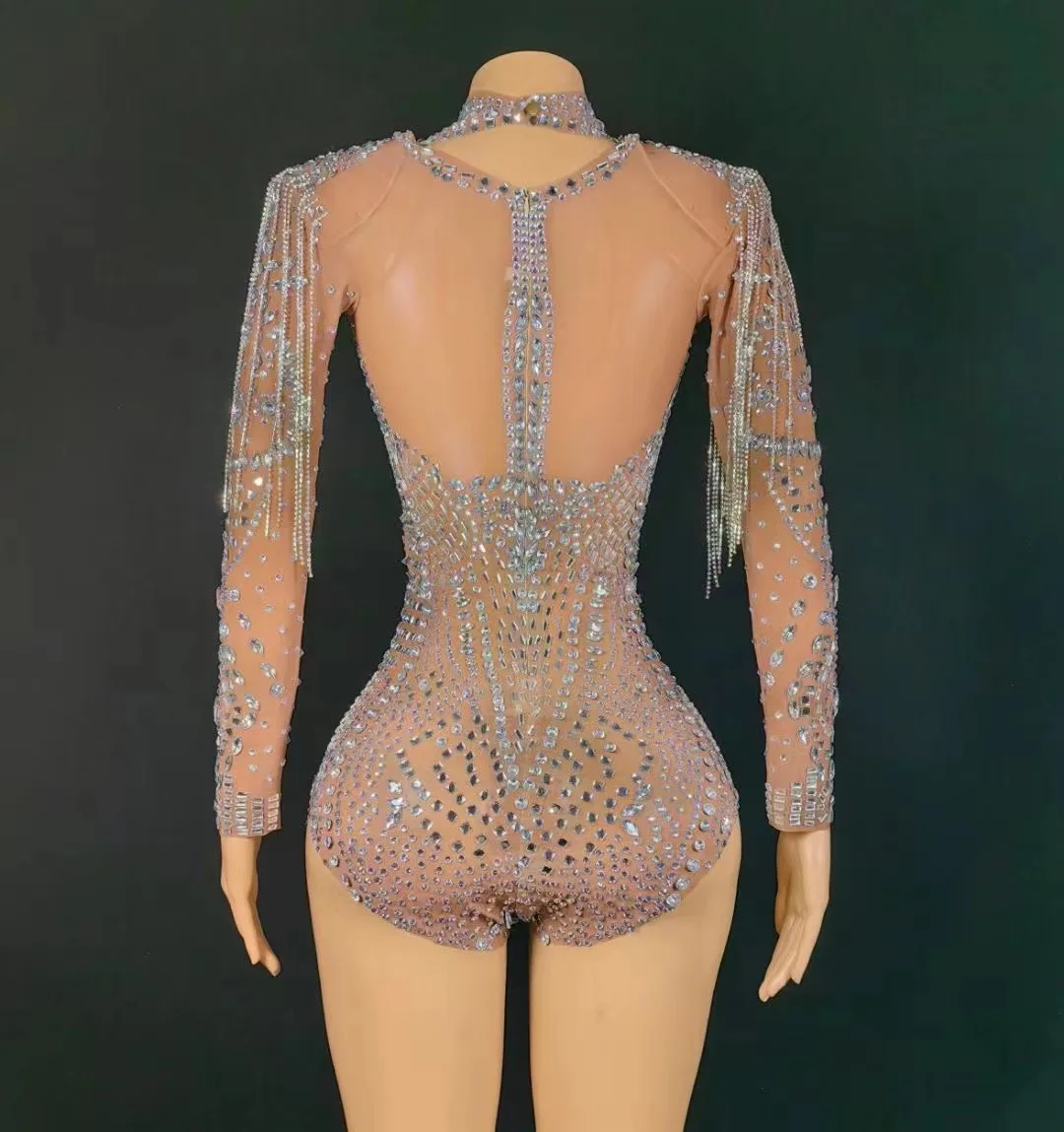 Sparkly Rhinestones Chains Long Sleeve Leotard Women Sexy Performance Dance Costume Singer Dancer Stage Wear Nightclub Outfit