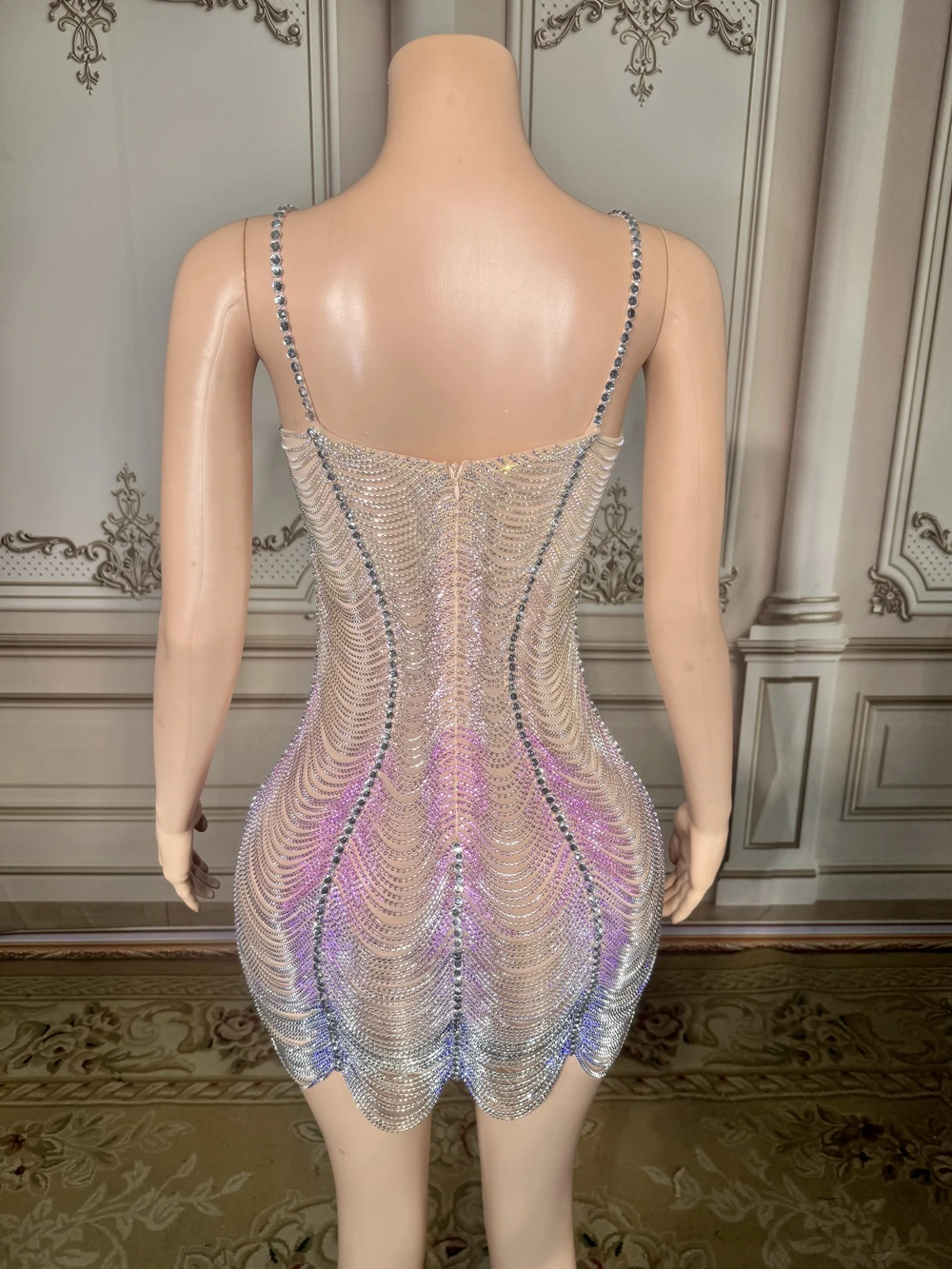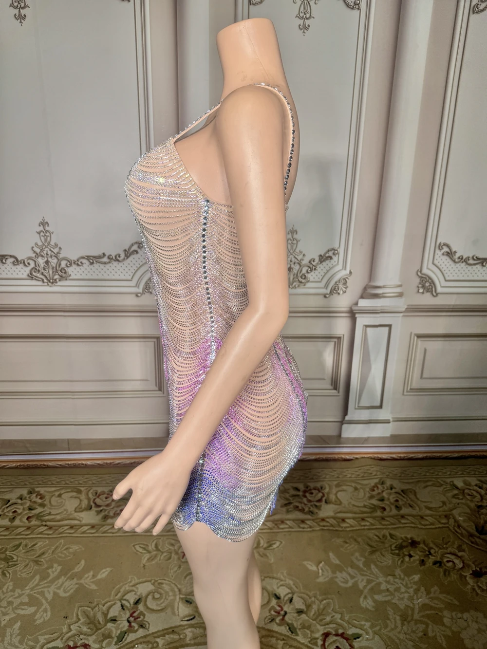 Sparkly Rhinestones Chains Slip Short Dress Women Sexy Mesh Evening Prom Celebrate Birthday Dress Photo Shoot Show Stage Wear