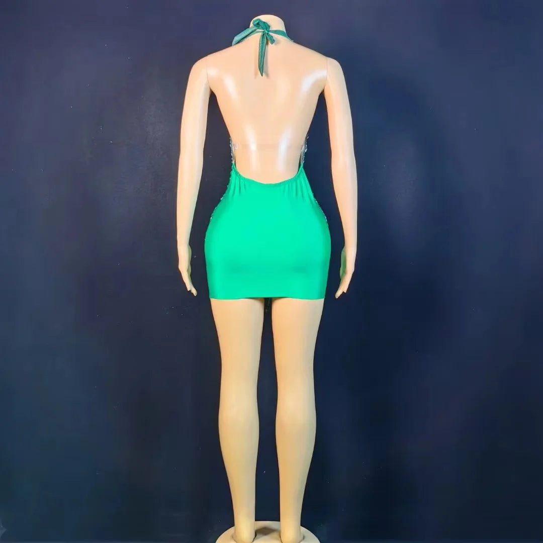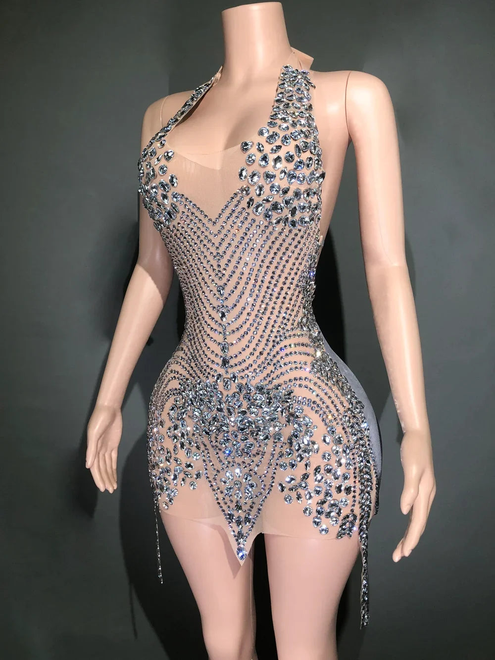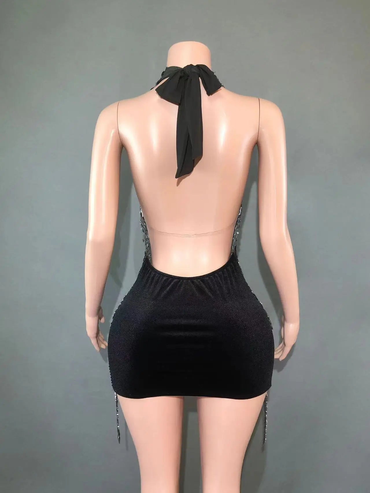 Shine bright in this sparkly rhinestones evening dress, perfect for prom and birthday celebrations! This sexy halter backless design, made from soft mesh velvet, beautifully enhances your silhouette. Ideal for stage performances, this short dress combines elegance with allure, ensuring you steal the spotlight at any event. Celebrate in style and make a memorable entrance!