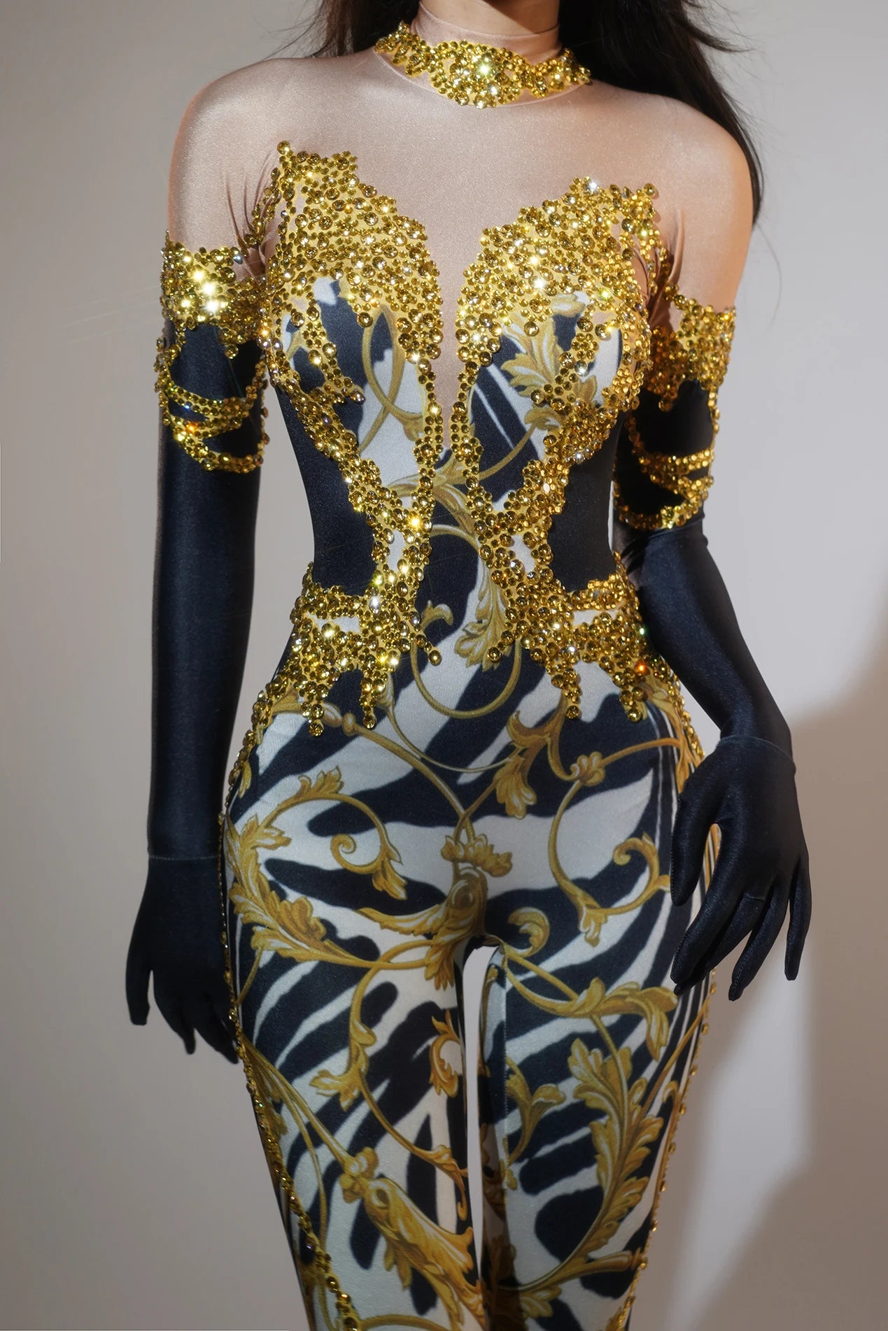 Shine bright this Halloween (and every night out) in a figure‑hugging skinny jumpsuit embellished with sparkling rhinestones and matching gloves. Designed for club nights, stage performances, bar events, and high‑street Halloween looks, this sexy costume pairs show‑stopping sparkle with a sleek silhouette for maximum impact.