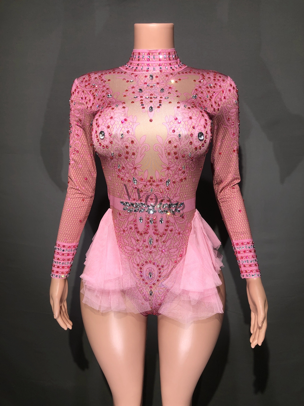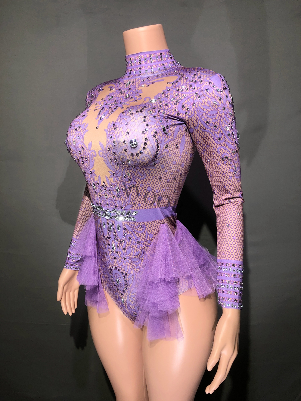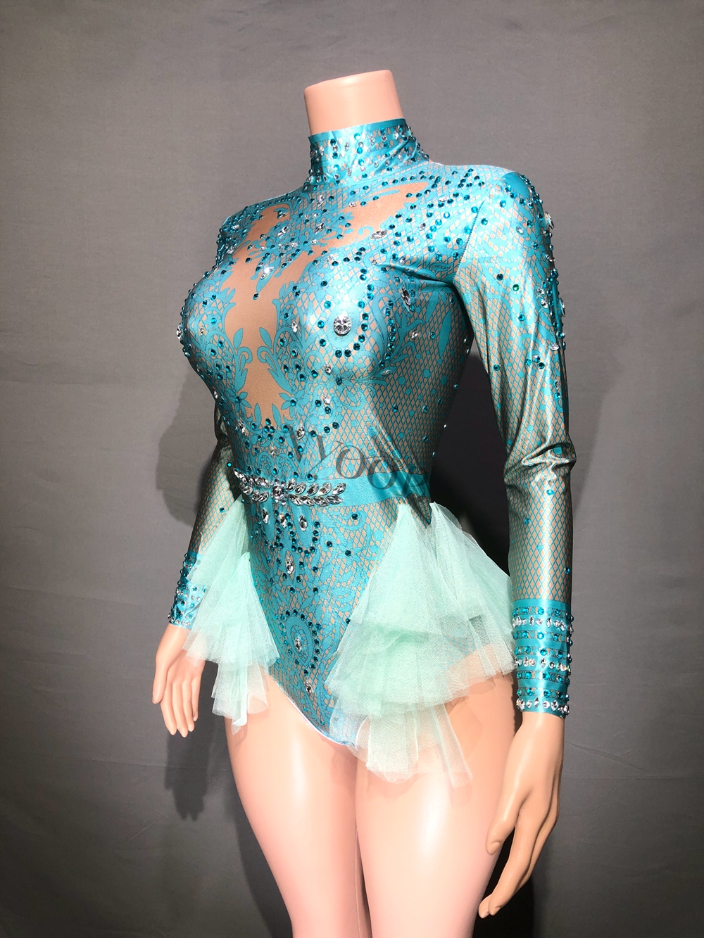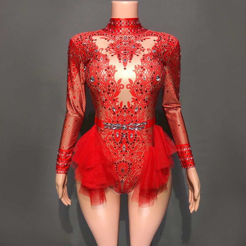 Sparkly Rhinestones Leotard for Women Party Birthday Dress Sexy Mesh Ruffles Performance Dance Costume Nightclub Stage Wear