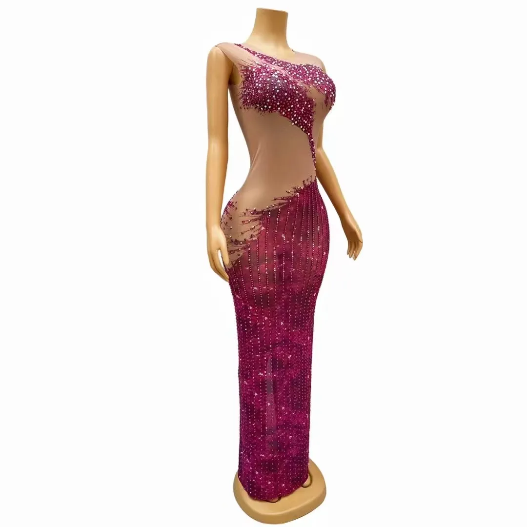 Sparkly Rhinestones Long Dress for Women Sexy Mesh See Through Celebrate Evening Prom Birthday Photo Shoot Dress Stage Wear